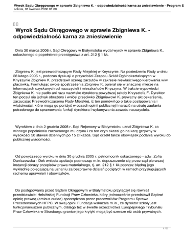 Wyrok Sądu Okręgowego w sprawie Zbigniewa K. - odpowiedzialność karna za zniesławienie - Program S sobota, 01 kwietnia 2006 01:00 Wyrok Sądu Okręgowego w sprawie Zbigniewa K. odpowiedzialność karna za zniesławienie Dnia 30 marca 2006 r. Sąd Okręgowy w Białymstoku wydał wyrok w sprawie Zbigniewa K., oskarżonego o popełnienie przestępstwa z art. 212 § 1 kk. Zbigniew K. jest przewodniczącym Rady Miejskiej w Knyszynie. Na posiedzeniu Rady w dniu 28 lutego 2005 r., podczas dyskusji o przyszłości Zespołu Szkół Ogólnokształcących w Knyszynie Zbigniew K. przedstawił szereg zarzutów w zakresie niewłaściwego kierowania w/w placówką. Formułując swoje spostrzeżenia Zbigniew K. opierał się w znacznej mierze na informacjach uzyskanych od nauczycieli i mieszkańców Knyszyna. W trakcie wypowiedzi Zbigniewa K. nie padło ani razu nazwisko dyrektora powyższej szkoły Krzysztofa F. Dyrektor ten poczuł się jednak obrażony i wniósł przeciwko Zbigniewowi K. prywatny akt oskarżenia, zarzucając Przewodniczącemu Rady Miejskiej, iż ten pomówił go o takie postępowania i właściwości, które mogą go poniżyć w oczach opinii publicznej i narazić na utratę zaufania potrzebnego do sprawowania funkcji dyrektora i wykonywania zawodu nauczyciela. Wyrokiem z dnia 2 grudnia 2005 r. Sąd Rejonowy w Białymstoku uznał Zbigniewa K. za winnego popełnienia zarzucanego mu czynu i za ten czyn skazał go na karę grzywny w wysokości 50 stawek dziennych po 15 zł każda. Sąd orzekł także obowiązek podania wyroku do publicznej wiadomości. Od powyższego wyroku w dniu 30 grudnia 2005 r. pełnomocnik oskarżonego - adw. Zofia Daniszewska - Dek wniosła apelacje podnosząc m.in. dopuszczenie się przez sąd pierwszej instancji obrazy przepisów prawa materialnego, tj. art. 212 § 1 kk poprzez błędną jego wykładnię polegającą na uznaniu za bezprawne działań podjętych w ramach przysługujących radnemu uprawnień i obowiązków. Do postępowania przed Sądem Okręgowym w Białymstoku przyłączył się również przedstawiciel Helsińskiej Fundacji Praw Człowieka, który jednocześnie przedstawił Sądowi opinię prawną (amicus curiae) sporządzona przez pracowników Programu Sprawa Precedensowych HFPC. W swej opinii Fundacja wskazała m.in., że dyrektor szkoły jest funkcjonariuszem publicznym, dlatego też w świetle orzecznictwa Europejskiego Trybunału Praw Człowieka w Strasburgu granice jego krytyki mogą być szersze niż osób prywatnych. 1/2 Wyrok Sądu Okręgowego w sprawie Zbigniewa K. - odpowiedzialność karna za zniesławienie - Program Sp sobota, 01 kwietnia 2006 01:00 Fundacja podkreśliła także, iż formułując zarzuty wobec dyrektora szkoły Zbigniew K. działał jako reprezentant mieszkańców Knyszyna, a więc wypełniał swoje obowiązki jako radnego. Wyrokiem z dnia 30 marca 2006 r. Sąd Okręgowy w Białymstoku zmienił zaskarżony wyrok i uznając Zbigniewa K. za winnego popełnienia zarzucanego mu czynu warunkowo umorzył wobec niego postępowanie karne na okres próby wynoszący 1 rok. Sąd nie przychylił się do stanowisko oskarżonego, iż jego zachowanie nie nosiło cech bezprawności, jednakże uznał, że skutki samego wyroku skazującego byłyby dla niego, jako polityka, o wiele bardziej dolegliwe niż sama ewentualnie wymierzona kara. Pełnomocnik Zbigniewa K. planuje złożenie w sprawie skargi konstytucyjnej. Joomla SEF URLs by Artio 2/2