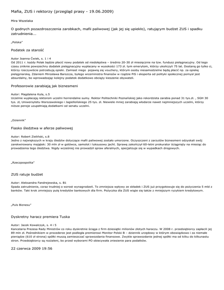 Mafia, ZUS i rektorzy (przegląd prasy - 19.06.2009) Mira Wszelaka O godnych pozazdroszczenia zarobkach, mafii paliwowej (jak jej się upiekło), ratującym budżet ZUS i spadku zatrudnienia... „Polska” Podatek za starość Autor Joanna Ćwiek, s. 1 i 4 Od 2011 r. każdy Polak będzie płacić nowy podatek od niedołęstwa – średnio 20-30 zł miesięcznie na tzw. fundusz pielęgnacyjny. Od tego czasu zniknie powszechny dodatek pielęgnacyjny wypłacany w wysokości 173 zł. tym emerytom, którzy ukończyli 75 lat. Dostaną go tylko ci, którzy rzeczywiście potrzebują opieki. Zamiast niego pojawią się vouchery, którym osoby niesamodzielne będą płacić np. za opiekę pielęgniarską. Zdaniem Mirosława Barszcza, byłego wiceministra finansów w rządzie PiS i eksperta od polityki społecznej pomysł jest absurdalny, bo wprowadzając kolejny podatek dodatkowo obciąży kieszenie obywateli. Profesorowie zarabiają jak biznesmeni Autor: Magdalena Kula, s.5 Uczelnie wypłacają rektorom uczelni horrendalne sumy. Rektor Politechniki Poznańskiej jako rekordzista zarabia ponad 31 tys.zł. , SGH 30 tys. zł, Uniwersytetu Warszawskiego i Jagiellońskiego 25 tys. zł. Niewiele mniej zarabiają włodarze nawet najmniejszych uczelni, którzy niższe pensje uzupełniają dodatkami od senatu uczelni. „Dziennik” Fiasko śledztwa w aferze paliwowej Autor: Robert Zieliński, s.8 Jedno z największych w kraju śledztw dotyczące mafii paliwowej zostało umorzone. Oczyszczeni z zarzutów biznesmeni odzyskali swój zarekwirowany majątek: 30 mln zł w gotówce, samolot i luksusowy jacht. Sprawę zakończył 60-letni prokurator ściągnięty na miesiąc do prowadzenia tego śledztwa. Nigdy wcześniej nie prowadził spraw aferalnych, specjalizuje się w wypadkach drogowych. „Rzeczpospolita” ZUS ratuje budżet Autor: Aleksandra Fandrejewska, s. B1 Spada zatrudnienie, coraz trudniej o wzrost wynagrodzeń. To zmniejsza wpływy ze składek i ZUS już przygotowuje się do pożyczenia 5 mld z banków. Taki krok zmniejszy pulę kredytów bankowych dla firm. Pożyczka dla ZUS wiąże się także z mniejszym ryzykiem kredytowym. „Puls Biznesu” Dyskretny haracz premiera Tuska Autor: Jacek Kowalczyk, s. 4 i 5 Kancelaria Prezesa Rady Ministrów co roku dyskretnie ściąga z firm dziesiątki milionów złotych haraczu. W 2008 r. przedsiębiorcy zapłacili jej 89 mln zł. Pośrednikiem w procederze jest podległa premierowi Monitor Polski B – dziennik urzędowy w którym obowiązkowo i za niemałe pieniądze (610 zł strona) spółki muszą zamieszczać sprawozdania finansowe. Zwykle sprawozdanie jednej spółki ma od kilku do kilkunastu stron. Przedsiębiorcy są rozżaleni, bo przed wyborami PO obiecywała zniesienie para podatków. 22 czerwca 2009 19:56