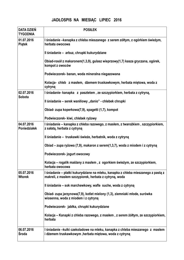 JADŁOSPIS NA MIESIĄC LIPIEC 2016 DATA DZIEŃ TYGODNIA 01.07.2016 Piątek POSIŁEK I śniadanie –kanapka z chleba mieszanego z serem zółtym, z ogórkiem świeżym, herbata owocowa II śniadanie – arbuz, chrupki kukurydziane Obiad-rosół z makaronem(1,3,9), gulasz wieprzowy(1,7) kasza gryczana, ogórek, kompot z owoców Podwieczorek- banan, woda mineralna niegazowana Kolacja- chleb z masłem, dżemem truskawkowym, herbata miętowa, woda z cytryną 02.07.2016 Sobota I śniadanie- kanapka z pasztetem , ze szczypiorkiem, herbata z cytryną, II śniadanie – serek waniliowy „danio” - chlebek chrupki Obiad- zupa koperkowa(7,9), spagetti (1,7), kompot Podwieczorek- kiwi, chlebek ryżowy 04.07.2016 Poniedziałek I śniadanie – kanapka z chleba razowego, z masłem, z twarożkiem , szczypiorkiem, z sałatą, herbata z cytryną II śniadanie – truskawki świeże, herbatnik, woda z cytryną Obiad – zupa ryżowa (7,9), makaron z serem(1,3,7), woda z miodem i z cytryną Podwieczorek- jogurt owocowy Kolacja – rogalik maślany z masłem , z ogorkiem świeżym, ze szczypiorkiem, herbata owocowa 05.07.2016 Wtorek I śniadanie – płatki kukurydziane na mleku, kanapka z chleba mieszanego z pastą z makreli, z masłem szczypiorek, herbata z cytryną, woda II śniadanie – sok marchewkowy, wafle suche, woda z cytryną Obiad- zupa jarzynowa(7,9), kotlet mielony (1,3), ziemniaki młode, surówka wiosenna, woda z miodem i z cytryną Podwieczorek- jabłka, chrupki kukurydziane Kolacja – Kanapki z chleba razowego, z masłem , z serem żółtym, ze szczypiorkiem, herbata 06.07.2016 Środa I śniadanie –kulki czekoladowe na mleku, kanapka z chleba mieszanego z masłem i dżemem truskawkowym ,herbata miętowa, woda z cytryną II śniadanie – ciasto domowe, herbata z cytryną Obiad – Krupnik(1,9), makaron z kurczakiem i z warzywami,kompot Podwieczorek- brzoskwinia, woda z sokiem Kolacja – kanapka z chleba razowego, z masłem , z kiełbasą z indyka z rzodkiewką i ze szczypiorkiem, herbata owocowa 07.07.2016 Czwartek I śniadanie –chleb razowy z pastą z jajeczną, ze szczypiorkiem,z sałatą, herbata owocowa, woda II śniadanie – chleb „Waza” z dżemem truskawkowym, herbata z cytryną Obiad- zupa groszkowa, gulasz drobiowy z warzywami(1,7), kasza jęczmienna, kapusta kiszona, kompot Podwieczorek –gruszka, woda z cytryną Kolacja – kanapka z chleba mieszanego z polędwicą z indyka,z masłem, z ogórkiem świeżym i ze szczypiorkiem, herbata miętowa 08.07.2016 Piątek I śniadanie – kluski lane na mleku, bułka pszenna z maslem, z miodem , herbata miętowa, woda z cytryną II śniadanie – melon miodowy, chrupki kukurydziane Obiad- Zu pa kalfiorowa(7,9), ryż z jabłkami(1,3,7), kompot Podwieczorek- banan, woda z sokiem Kolacja- kanapka z chleba mieszanego z masłem, z szynką z kurcząt, z ogórkiem kiszonym, herbata owocowa 09.07.2016 Sobota I śniadanie- bułka ziarnista z serkiem białym z bazylią, ze szczypiorkiem, herbata z cytryną, woda z cytryną II śniadanie – jogurt naturalny z jagodami Obiad-kapuśniak(9), kluski śląskie z sosem warzywnym(1,3,7,9), kompot Podwieczorek-jogurt owocowy, biszkopty 11.07.2016 Poniedziałek I śniadanie – kanapka z chleba razowego z masłem, z polędwicą sopocką, z pomidorem i szczypiorkiem, bawarka, woda niegazowana II śniadanie – kisiel żurawinowy z jabłkiem tartym Obiad- barszcz biały, łazanki z kapustą, woda z miodem i z cytryną Podwieczorek- jabłka, woda z sokiem Kolacja- rogal z masłem, z serem żółtym, ze szczypiorkiem, herbata miętowa, woda 12.07.2016 Wtorek I śniadanie – parówka z indyka, kanapka z masłem, herbata z cytryną II śniadanie – sok marchewkowy, wafle ryżowe, woda z cytryną Obiad- Zupa pomidorowa z ryżem(7,9), pierogi ruskie(1,3,7), woda z miodem i z cytryną Podwieczorek- gruszki, chrupki kukurydziane Kolacja- Kanapka z bułki maślanej, z masłem , pomidorem i ze szczypiorkiem herbata z ctryną 13.07.2016 Środa I śniadanie –kanapka z chleba mieszanego z ,z sałatą, z pomidorem kawa „Inka”, woda z cytryną II śniadanie – ciasto domowe, woda, z sokiem Obiad – Zupa ogórkowa(7,9), kotlet schabowy(1,3,7), ziemniaki młode, mizeria, kompot Podwieczorek- banan Kolacja – bułka grahamka, z masłem, z kiełbasą podsuszaną, ogórek kiszony, herbata owocowa, woda 14.07.2016 Czwartek I śniadanie – kanapka z chleba mieszanego, z masłem twarożek , ze śmietanką , ogórek świeży, herbata miętowa II śniadanie –galaretka owocowa z truskawkami, woda niegazowana Obiad- Krem warzywny, klopsiki w sosie koperkowym, ryż, buraczki czerwone, kompot Podwieczorek- jogurt owocowy , wafle ryżowe Kolacja – kanapka z chleba razowego z masłem , rzodkiewką, szczypiorkiem, herbata miętowa, woda z cytryną 15.07.2016 Piątek I śniadanie – kanapka z chleba mieszanego z masłem, z ogórkiem świeżym, herbata miętowa, II śniadanie- arbuz, herbatniki Obiad- Barszcz czerwony(3,7), ryba panierowana(4,1,3), ziemniaki młode, surówka „colesław”, ompot Podwieczorek- pomarańcze Kolacja- bułka z masłem z szynką drobiową, herbata owocowa 16.07.2016 Sobota I śniadanie – bułka mleczna z masłem, z pieczenią z indyka, ze szczypiorkiem, herbata z cytryną II śniadanie – banany, woda z cytryną Obiad- zupa groszkowa, nalesniki z serem(1,3), kompot Podwieczorek- kiwi, herbatniki, woda z cytryną 18.07.2016 Poniedziałek I śniadanie – kanapka z masłem i pasztetem drobiowym z pomidorem, bawarka II śniadanie – kisiel cytrynowy, biszkopty Obiad- rosół z makaronem(1,3,9), spagetti(1,7), woda z miodem i z cytryną Podwieczorek- banany Kolacja- kanapka z chleba razowego, z masłem, z serkiem śmietankowym, herbata miętowa 19.07.2016 Wtorek I śniadanie – kanapka z chleba „graham” z masłem , pastą z tuńczyka , kakao II śniadanie- deser „Monte” Obiad- Zupa brokułowa, kotlet pożarski(1,3), ziemniaki młode, kapusta kiszona,woda z miodem i z cytryn