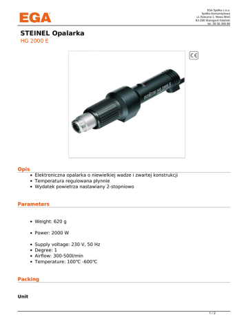EGA Spółka z o.o. Spółka Komandytowa ul. Rzeczna 1, Nowa Wieś 83-200 Starogard Gdański tel. 58 56 300 80 STEINEL Opalarka HG 2000 E Opis Elektroniczna opalarka o niewielkiej wadze i zwartej konstrukcji Temperatura regulowana płynnie Wydatek powietrza nastawiany 2-stopniowo Parameters Weight: 620 g Power: 2000 W Supply voltage: 230 V, 50 Hz Degree: 1 Airflow: 300-500l/min Temperature: 100℃ -600℃ Packing Unit 1/2 EGA Spółka z o.o. Spółka Komandytowa ul. Rzeczna 1, Nowa Wieś 83-200 Starogard Gdański tel. 58 56 300 80 Cardboard box: 1 szt. Variants No. Catalog no. EAN Power 1 HG 2000 E 4007841342616 2000 2/2 Powered by TCPDF (www.tcpdf.org)
