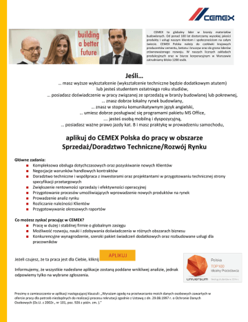 CEMEX to globalny lider w branży materiałów budowlanych. Od ponad 100 lat dostarczamy wysokiej jakości produkty i usługi naszym klientom i społecznościom na całym świecie. CEMEX Polska należy do czołówki krajowych producentów cementu, betonu i kruszyw oraz do grona liderów zrównoważonego rozwoju. W naszych licznych zakładach produkcyjnych oraz w biurze korporacyjnym w Warszawie zatrudniamy blisko 1200 osób. Jeśli… … masz wyższe wykształcenie (wykształcenie techniczne będzie dodatkowym atutem) lub jesteś studentem ostatniego roku studiów, … posiadasz doświadczenie w pracy związanej ze sprzedażą w branży budowlanej lub pokrewnej, … znasz dobrze lokalny rynek budowlany, … znasz w stopniu komunikatywnym język angielski, … umiesz dobrze posługiwad się programami pakietu MS Office, …. jesteś osobą mobilną i dyspozycyjną, … posiadasz ważne prawo jazdy kat. B i masz praktykę w prowadzeniu samochodu, aplikuj do CEMEX Polska do pracy w obszarze Sprzedaż/Doradztwo Techniczne/Rozwój Rynku Główne zadania: Kompleksowa obsługa dotychczasowych oraz pozyskiwanie nowych Klientów Negocjacje warunków handlowych kontraktów Doradztwo techniczne i współpraca z inwestorami oraz projektantami w przygotowaniu technicznej strony specyfikacji przetargowych Zwiększenie rentowności sprzedaży i efektywności operacyjnej Przygotowanie procesów umożliwiających wprowadzenie nowych produktów na rynek Prowadzenie analiz rynku Rozliczanie należności Klientów Przygotowywanie okresowych raportów Co możesz zyskać pracując w CEMEX? Pracę w dużej i stabilnej firmie o globalnym zasięgu Możliwośd rozwoju, nauki i zdobywania doświadczenia w różnych obszarach biznesu Konkurencyjne wynagrodzenie, szeroki pakiet świadczeo dodatkowych oraz rozbudowane usługi dla pracowników Jeżeli czujesz, że ta praca jest dla Ciebie, kliknij Informujemy, że wszystkie nadesłane aplikacje zostaną poddane wnikliwej analizie, jednak odpowiemy tylko na wybrane zgłoszenia. Prosimy o zamieszczenie w aplikacji następującej klauzuli: „Wyrażam zgodę na przetwarzanie moich danych osobowych zawartych w ofercie pracy dla potrzeb niezbędnych do realizacji procesu rekrutacji zgodnie z Ustawą z dn. 29.08.1997 r. o Ochronie Danych Osobowych (Dz.U. z 2002r., nr 101, poz. 926 z późn. zm. ).”