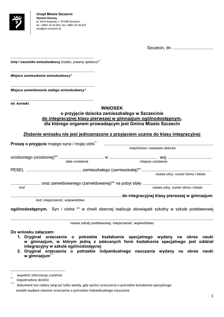 WNIOSEK o przyjęcie dziecka zamieszkałego w Szczecinie do