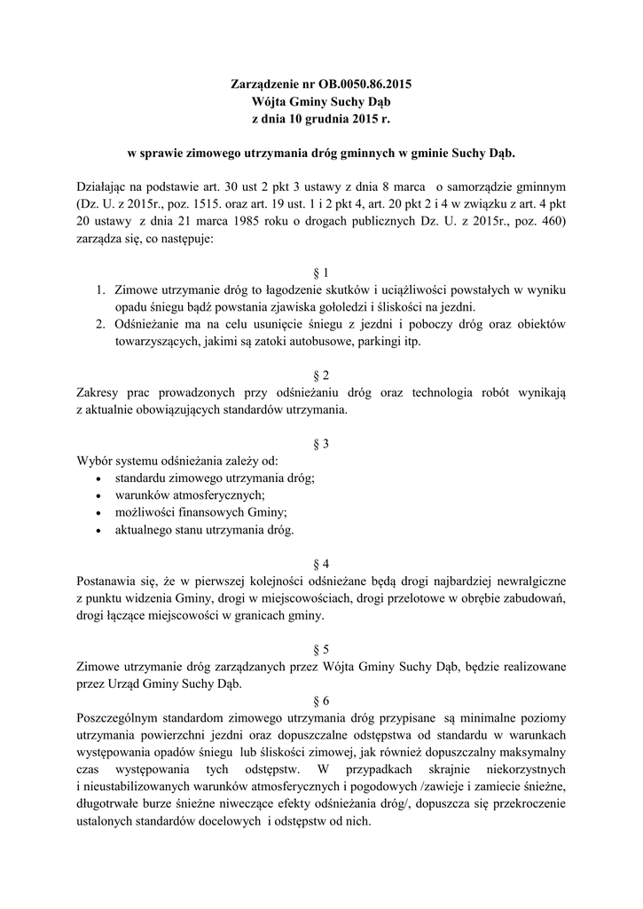 Zarządzenie nr OB.0050.86.2015 Wójta Gminy Suchy Dąb z dnia 10 grudnia 2015 r. w sprawie zimowego utrzymania dróg gminnych w gminie Suchy Dąb. Działając na podstawie art. 30 ust 2 pkt 3 ustawy z dnia 8 marca o samorządzie gminnym (Dz. U. z 2015r., poz. 1515. oraz art. 19 ust. 1 i 2 pkt 4, art. 20 pkt 2 i 4 w związku z art. 4 pkt 20 ustawy z dnia 21 marca 1985 roku o drogach publicznych Dz. U. z 2015r., poz. 460) zarządza się, co następuje: §1 1. Zimowe utrzymanie dróg to łagodzenie skutków i uciążliwości powstałych w wyniku opadu śniegu bądź powstania zjawiska gołoledzi i śliskości na jezdni. 2. Odśnieżanie ma na celu usunięcie śniegu z jezdni i poboczy dróg oraz obiektów towarzyszących, jakimi są zatoki autobusowe, parkingi itp. §2 Zakresy prac prowadzonych przy odśnieżaniu dróg oraz technologia robót wynikają z aktualnie obowiązujących standardów utrzymania. §3 Wybór systemu odśnieżania zależy od: standardu zimowego utrzymania dróg; warunków atmosferycznych; możliwości finansowych Gminy; aktualnego stanu utrzymania dróg. §4 Postanawia się, że w pierwszej kolejności odśnieżane będą drogi najbardziej newralgiczne z punktu widzenia Gminy, drogi w miejscowościach, drogi przelotowe w obrębie zabudowań, drogi łączące miejscowości w granicach gminy. §5 Zimowe utrzymanie dróg zarządzanych przez Wójta Gminy Suchy Dąb, będzie realizowane przez Urząd Gminy Suchy Dąb. §6 Poszczególnym standardom zimowego utrzymania dróg przypisane są minimalne poziomy utrzymania powierzchni jezdni oraz dopuszczalne odstępstwa od standardu w warunkach występowania opadów śniegu lub śliskości zimowej, jak również dopuszczalny maksymalny czas występowania tych odstępstw. W przypadkach skrajnie niekorzystnych i nieustabilizowanych warunków atmosferycznych i pogodowych /zawieje i zamiecie śnieżne, długotrwałe burze śnieżne niweczące efekty odśnieżania dróg/, dopuszcza się przekroczenie ustalonych standardów docelowych i odstępstw od nich. § 7. Wprowadza się, na drogach gminnych standardy utrzymania w okresie zimowym opisane w §8 pkt. 1 zwane dalej odpowiednio V i VI standardem zimowego utrzymania dróg. §8 Pojęcia ogólne ŚNIEG LUŹNY - jest to nieusunięty lub pozostały na nawierzchni po przejściu pługów śnieg, który nie został zagęszczony pod wpływem ruchu kołowego. ŚNIEG ZAJEŻDŻONY - jest to nieusunięty lub pozostały na nawierzchni po przejściu pługów śnieg, który został zagęszczony, ale nie stał się zlodowaciały. NABÓJ ŚNIEŻNY - jest to nieusunięta zlodowaciała lub ubita warstwa śniegu o znacznej grubości (od kilku centymetrów), przymarznięta do nawierzchni jezdni. BŁOTO POŚNIEGOWE - jest to topniejący śnieg pozostały na nawierzchni po przejściu pługów i posypaniu jej środkami chemicznymi 1. Standardy zimowego utrzymania dróg gminnych w Gminie Suchy Dąb zgodnie z zarządzeniem nr 46 Ministra Transportu i Gospodarki Morskiej z 25.10.1994 r. (Dziennik Urzędowy MTiGM Nr 10) określa załącznik. §9 Bezpośredni nadzór nad prawidłowym przebiegiem wykonywanych prac powierza się inspektorowi ds. dróg oraz sołtysom poszczególnych miejscowości. § 10 Zarządzenie wchodzi w życie z dniem podpisania. Załącznik do zarządzenia nr OB. 0050.86.2015 Wójta Gminy Suchy Dąb z dnia 10 grudnia 2015 r. STANDARDY ZIMOWEGO UTRZYMANIA DRÓG DOTYCZĄCE DRÓG GMINNYCH W GMINIE SUCHY DĄB Standard Opis stanu utrzymania drogi dla danego standardu Po ustaniu opadów śniegu dopuszcza się zaleganie śniegu: Jezdnia odśnieżona , w miejscach zasp odśnieżony co najmniej jeden pas ruchu z wykonaniem mijanek . Jezdnia posypana na odcinkach decydujących o możliwości ruchu . - luźny – 16 godz. - zajeżdżony – występuje - nabój śnieżny – występuje - zaspy - występują do 24 godz. dopuszcza się przerwy w komunikacji do 24 godz. Jezdnia zaśnieżona. Prowadzi się interwencyjne odśnieżanie w zależności od potrzeb . Jezdnie posypane po odśnieżaniu w miejscach wyznaczonych przez zarządcę drogi - luźny – występuje - zajeżdżony – występuje -nabój śnieżny – występuje -zaspy – występują do 48 godz. dopuszcza się przerwy w komunikacji do 48 godz. Dopuszczalne odstępstwa od standardu po ustąpieniu opadów W miejscach wyznaczonych : - gołoledź – 8 godz. - śliskość pośniegowa występuje - V VI W miejscach wyznaczonych: - wszystkie rodzaje śliskości po odśnieżaniu Wykaz dróg: - Wróblewo – 174001Grabiny-Zameczek – ulice Akacjowa, Bartnicza, Bukowa, Dworska, Gdańska, Grabowa, Herbowa, Jaśminowa, Jesionowa, Kasztanowa, Klonowa, Lipowa, Łąkowa, Majowa, Młyńska, Polna, Rycerska, Zamkowa - Suchy Dąb – ulice Sportowa, Polna, Żuławska, Podcieniowa - Ostrowite – 174011 - Osice – ulice wiejskie - Steblewo – ulice wiejskie - Koźliny – droga przez wieś, droga 174024, Zakład Rolny Koźliny, droga do posesji 111; - Krzywe Koło – 174021, 174020, 174019, 174018, ulica do posesji 174, ulice Zakład Rolny Pozostałe drogi gminne i transportu rolnego.