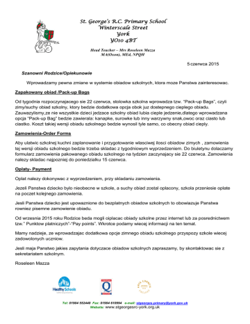 St. George’s R.C. Primary School Winterscale Street York YO10 4BT Head Teacher – Mrs Roseleen Mazza MA(Oxon), MEd, NPQH 5 czerwca 2015 Szanowni Rodzice/Opiekunowie Wprowadzamy pewna zmiane w systemie obiadow szkolnych, ktora moze Panstwa zainteresowac. Zapakowany obiad /Pack-up Bags Od tygodnia rozpoczynajacego sie 22 czerwca, stolowka szkolna wprowadza tzw. “Pack-up Bags”, czyli zimy/suchy obiad szkolny, ktory bedzie dodatkowa opcja obok juz dostepnego cieplego obiadu. Zauwazylismy,ze nie wszystkie dzieci jedzace szkolny obiad lubia cieple jedzenie,dlatego wprowadzana opcja “Pack-up Bag” bedzie zawierala: kanapke, surowke lub inny warzywny snak,owoc oraz ciasto lub ciastko. Koszt takiej wersji obiadu szkolnego bedzie wynosil tyle samo, co obecny obiad cieply. Zamowienia-Order Forms Aby ulatwic szkolnej kuchni zaplanowanie i przygotowanie wlasciwej ilosci obiadow zimych , zamowienia tej wersji obiadu szkolnego bedzie trzeba skladac z tygodniowym wyprzedzeniem. Do biuletynu dolaczamy formularz zamowienia pakowanego obiadu szkolnego na tydzien zaczynajacy sie 22 czerwca. Zamowienia nalezy skladac najpozniej do poniedzialku 15 czerwca. Oplaty- Payment Oplat nalezy dokonywac z wyprzedzeniem, przy skladaniu zamowienia. Jezeli Panstwa dziecko bylo nieobecne w szkole, a suchy obiad zostal oplacony, szkola przeniesie oplate na poczet kolejnego zamowienia. Jesli Panstwa dziecko jest upowaznione do bezplatnych obiadow szkolnych to obowiazuje Panstwa rowniez pisemne zamowienie obiadu. Od wrzesnia 2015 roku Rodzice beda mogli oiplacac obiady szkolne przez internet lub za posrednictwem tzw.” Punktow platniczych”-“Pay points”. Wkrotce podamy wiecej informacji na ten temat. Mamy nadzieje, ze wprowadzajac dodatkowa opcje zimnego obiadu szkolnego przyspozy szkole wiecej zadowolonych uczniow. Jesli maja Panstwo jakies zapytania dotyczace obiadow szkolnych zapraszamy, by skontaktowac sie z sekretariatem szkolnym. Roseleen Mazza Tel: 01904 552440 Fax: 01904 610994 e-mail: [email protected] Website: www.stgeorgesrc-york.org.uk
