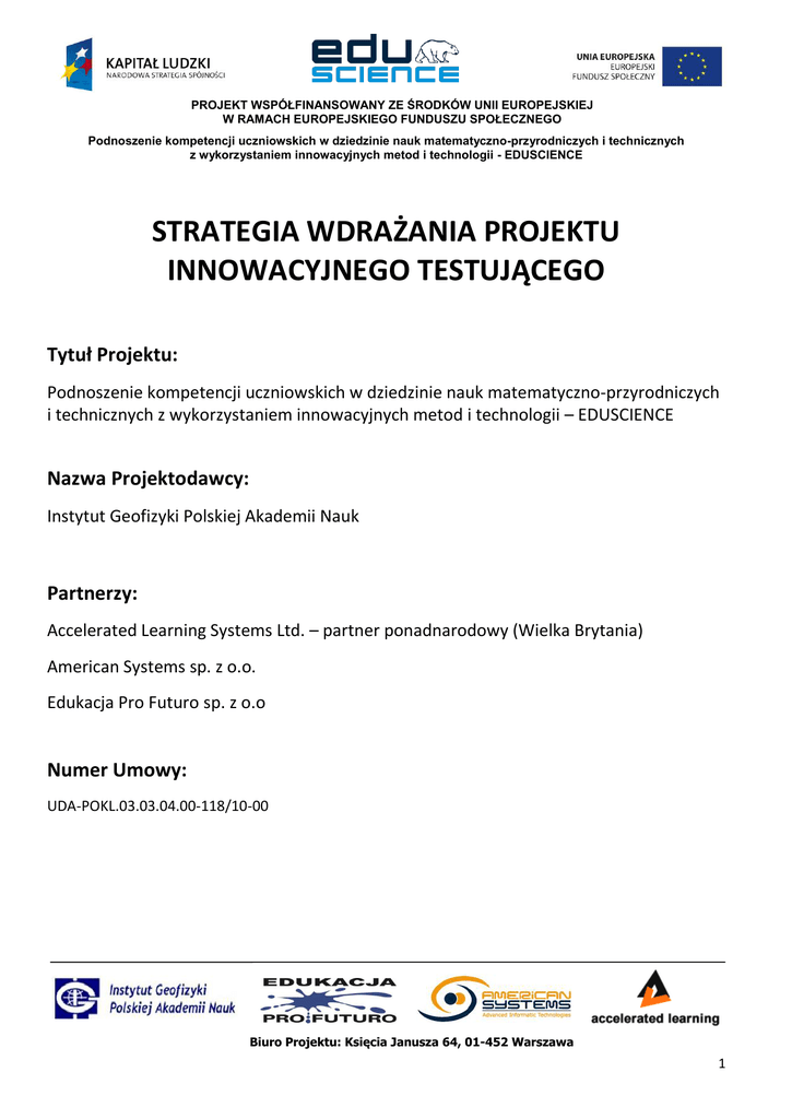 PROJEKT WSPÓŁFINANSOWANY ZE ŚRODKÓW UNII EUROPEJSKIEJ W RAMACH EUROPEJSKIEGO FUNDUSZU SPOŁECZNEGO Podnoszenie kompetencji uczniowskich w dziedzinie nauk matematyczno-przyrodniczych i technicznych z wykorzystaniem innowacyjnych metod i technologii - EDUSCIENCE STRATEGIA WDRAŻANIA PROJEKTU INNOWACYJNEGO TESTUJĄCEGO Tytuł Projektu: Podnoszenie kompetencji uczniowskich w dziedzinie nauk matematyczno-przyrodniczych i technicznych z wykorzystaniem innowacyjnych metod i technologii – EDUSCIENCE Nazwa Projektodawcy: Instytut Geofizyki Polskiej Akademii Nauk Partnerzy: Accelerated Learning Systems Ltd. – partner ponadnarodowy (Wielka Brytania) American Systems sp. z o.o. Edukacja Pro Futuro sp. z o.o Numer Umowy: UDA-POKL.03.03.04.00-118/10-00 Biuro Projektu: Księcia Janusza 64, 01-452 Warszawa 1 PROJEKT WSPÓŁFINANSOWANY ZE ŚRODKÓW UNII EUROPEJSKIEJ W RAMACH EUROPEJSKIEGO FUNDUSZU SPOŁECZNEGO Podnoszenie kompetencji uczniowskich w dziedzinie nauk matematyczno-przyrodniczych i technicznych z wykorzystaniem innowacyjnych metod i technologii - EDUSCIENCE I. Uzasadnienie „Nasza szkoła jest mało innowacyjna metodycznie, uczy tradycyjnie, nie dostrzega indywidualnych potrzeb i zainteresowao uczniów – gubi talenty” (Raport „Młodzi 2011”) Opis problemu Raport pt. „Młodzi 2011” (pod redakcją naukową ministra Michała Boniego) wskazuje na istniejący w Polsce problem niedopasowania kształcenia do potrzeb zmieniającego się rynku pracy. Kierunki studiów najczęściej wybierane przez młodzież nie pokrywają się z realnie istniejącymi branżami i potrzebami rynku, co jest szczególnie widoczne w niedoborze wykształconych absolwentów kierunków ścisłych i przyrodniczych. Tymczasem dziedziny te uznaje się za kierunki o kluczowym znaczeniu dla gospodarki opartej na wiedzy. Analiza danych statystycznych dotyczących liczby studentów podejmujących kształcenie na kierunkach matematycznych, przyrodniczych i technicznych pozwala na stwierdzenie, że mimo, iż w ostatnich latach obserwowany jest nieznaczny wzrost odsetka studentów tych kierunków w ogóle studentów, to wciąż wartości te są niesatysfakcjonująco niskie. Wg GUS kształcenie na kierunkach matematyczno-przyrodniczych i technicznych (pod uwagę wzięto następujące grupy kierunków zgodne z Międzynarodową Standardową Klasyfikacją Edukacji ISCED’97: biologiczne, fizyczne, matematyczne i statystyczne oraz inżynieryjno-techniczne) w 2010 r. podjęło zaledwie 11,40% wszystkich osób podejmujących kształcenie na studiach. Dodatkowo martwi fakt, że kobiety stanowiły niecałe 37% ogólnej liczby studentów tych kierunków, podczas gdy w ogólnej liczbie wszystkich studentów odsetek kobiet sięga 59% (opracowano na podstawie danych z Małego Rocznika Statystycznego Polski 2011). Nie ulega wątpliwości, że potrzebne są działania pobudzające zainteresowanie młodzieży studiami z dziedziny nauk ścisłych i przyrodniczych. Pewne działania w tym zakresie są już podejmowane (m.in. przywrócenie matematyki jako przedmiotu obowiązkowego na maturze, stypendia dla osób wybierających kierunki zamawiane). Jednak są one wciąż niewystarczające, a przede wszystkim nie obejmują wszystkich etapów kształcenia, a jedynie uczniów najstarszych. Relatywnie niewiele jest działao ukierunkowanych na rozwijanie zainteresowania naukami matematyczno-przyrodniczymi już od najmłodszych klas szkolnych, podczas gdy zgodnie z psychologią edukacji i procesem kształtowania się kompetencji to właśnie okres pierwszych klas szkoły podstawowej jest najbardziej sensytywny, jeśli chodzi o kształtowanie się przyszłych zainteresowao edukacyjnych. Ponadto nauczanie w obecnym systemie edukacji jest nakierowane na przygotowywanie uczniów do egzaminów zewnętrznych, przez co nauczyciele/nauczycielki bardziej koncentrują się na przekazywaniu faktów, niż na kształceniu umiejętności logicznego myślenia i badawczego podchodzenia do rozwiązywania problemów. Brak jest kompleksowego podejścia do tego problemu na wszystkich etapach kształcenia. Przedstawiony problem został również poruszony w raporcie PISA z 2009 r., w którym stwierdza się, że mimo utrzymującej się pozytywnej tendencji zmian w wyposażeniu szkół i pewnej poprawie w ogólnych osiągnięciach uczniów w przedmiotach przyrodniczych, to jednak nadal mamy w Polsce stosunkowo niewielką grupę uczniów dobrych i bardzo dobrych w tych dziedzinach. Odsetek uczniów osiągających najwyższe wyniki (poziom 5 i 6 wg raportu PISA) w rozumowaniu w naukach przyrodniczych jest niższy niż 8%, a dla nauk matematycznych wynosi nieco ponad 10%, a to właśnie ci uczniowie są potencjalnymi studentami kierunków matematycznoprzyrodniczych (Raport PISA 2009). Biuro Projektu: Księcia Janusza 64, 01-452 Warszawa 2 PROJEKT WSPÓŁFINANSOWANY ZE ŚRODKÓW UNII EUROPEJSKIEJ W RAMACH EUROPEJSKIEGO FUNDUSZU SPOŁECZNEGO Podnoszenie kompetencji uczniowskich w dziedzinie nauk matematyczno-przyrodniczych i technicznych z wykorzystaniem innowacyjnych metod i technologii - EDUSCIENCE Kolejnym wyzwaniem polskiego systemu edukacji jest niski poziom kompetencji kluczowych (KK) wśród uczniów/uczennic. Kompetencje kluczowe zdefiniowano w „Zaleceniu PE i Rady w sprawie Kompetencji kluczowych w procesie uczenia się przez całe życie” z 18.12.06 r. Projekt ukierunkowany jest na rozwijanie czterech z ośmiu KK tj.: porozumiewania się w jęz. obcych; k. matematycznych i podstawowych k. naukowotechnicznych, k. informatycznych oraz umiejętności uczenia się. W „Komunikacie Komisji dla Parlamentu Europejskiego, Rady, Europejskiego Komitetu Ekonomiczno-Społecznego i Komitetu Regionów” z dnia 25.11.2009 roku nt. kompetencji kluczowych w zmieniającym się świecie, zamieszczono rekomendacje dla rozwoju KK w krajach europejskich. Zapisano tam m.in. koniecznośd wyposażania szkół w nowe technologie i zapewnienie uczniom podstawowych umiejętnośc