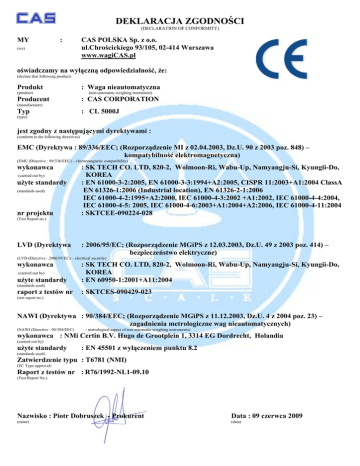 DEKLARACJA ZGODNOŚCI (DECLARATION OF CONFORMITY) MY : (we) CAS POLSKA Sp. z o.o. ul.Chrościckiego 93/105, 02-414 Warszawa www.wagiCAS.pl oświadczamy na wyłączną odpowiedzialność, że: (declare that following product) Produkt (product) Producent : Waga nieautomatyczna (non-automatic weighing instrument) : CAS CORPORATION (manufacturer) Typ : CL 5000J (type) jest zgodny z następującymi dyrektywami : (conform to the following directives) EMC (Dyrektywa : 89/336/EEC; (Rozporządzenie MI z 02.04.2003, Dz.U. 90 z 2003 poz. 848) – kompatybilność elektromagnetyczna) (EMC (Directive : 89/336/EEC) – electromagnetic compatibility) wykonawca (carried out by) użyte standardy (standards used) nr projektu : SK TECH CO. LTD, 820-2, Wolmoon-Ri, Wabu-Up, Namyangju-Si, Kyungii-Do, KOREA : EN 61000-3-2:2005, EN 61000-3-3:1994+A2:2005, CISPR 11:2003+A1:2004 ClassA EN 61326-1:2006 (Industrial location), EN 61326-2-1:2006 IEC 61000-4-2:1995+A2:2000, IEC 61000-4-3:2002 +A1:2002, IEC 61000-4-4:2004, IEC 61000-4-5: 2005, IEC 61000-4-6:2003+A1:2004+A2:2006, IEC 61000-4-11:2004 : SKTCEE-090224-028 (Test Report no.) LVD (Dyrektywa : 2006/95/EC; (Rozporządzenie MGiPS z 12.03.2003, Dz.U. 49 z 2003 poz. 414) – bezpieczeństwo elektryczne) (LVD (Directive : 2006/95/EC) – electrical security) wykonawca (carried out by) użyte standardy : SK TECH CO. LTD, 820-2, Wolmoon-Ri, Wabu-Up, Namyangju-Si, Kyungii-Do, KOREA : EN 60950-1:2001+A11:2004 (standards used) raport z testów nr : SKTCES-090429-023 (test report no.) NAWI (Dyrektywa : 90/384/EEC; (Rozporządzenie MGiPS z 11.12.2003, Dz.U. 4 z 2004 poz. 23) – zagadnienia metrologiczne wag nieautomatycznych) (NAWI (Directive : 90/384/EEC) - metrological aspect of non-automatic weighing instruments) wykonawca : NMi Certin B.V. Hugo de Grootplein 1, 3314 EG Dordrecht, Holandia (carried out by) użyte standardy : EN 45501 z wyłączeniem punktu 8.2 (standards used) Zatwierdzenie typu : T6781 (NMI) (EC Type-approval) Raport z testów nr : R76/1992-NL1-09.10 (Test Report No.) Nazwisko : Piotr Dobruszek - Prokurent Data : 09 czerwca 2009 (name) (data)