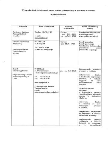 Wykaz placówek świadcącychpomoc osobom pokrąrwdzonym przemocą w rodzinie w powiecie laskim Dane teleadresowe Instytucja powiatowe centrum Pomocy Rodzinie Tei.|fax: 43 w Łasku e- mail: ośrodek Interwencji Kryzysowej 98 powiatowe centrum Pomocy Rodzinie 675 37 49 pcnr.lask(Dop.pl - 100 Łask ul. 9 Maja 33 Tel.: 43 675 e- mail: Rodzaj świadczonej Godziny unędowania Crynne; pon. wt. - - 16.00 pt. 7.30 - 15,30 8,00 Crynny: pon. 15.30 _ 19.30 50 49 [email protected] pomocy Poradnictwo informacyj ne prowadznne przez pracowników socjalnych Porady prawnika Porady psychologa Poradnictwo informacyjne prowadzon€ przez pracownika socjalnego w Łasku Zespól Interdyscyplinarny Miejsko-Gminny Ośrodek Pomocy Społecmej w Łasku 98-100 Łask ul. Warszawska 14 e-mail: [email protected] Tel. F'ax 43 675_21-38 43 675-ż1-91 łrvrł.mgopslasIł.pl Przewodnicąca Zespołu Tamara Szymko e-mail: tamara.szymko@m gopslask-pl pn. - pt. diagnozowanie problemu 7.30_15.30 przemocy w rodzinie, podejmowanie działań w środowisku zagJożonym w rodzinie mających na celu prz€mocą przeciwdzialanie zjawisku, temu rozpowszechnianie informacji o instytucjach, osobach i możliwościachudzielenia pomocy w środowisku lokalnym, inicjowanie dzialań w stosunku do osób przemoc stosujących w rodzinie, kompleksowe zajmowanie się rodzinami, w których dochodzi do przemocy, monitorowanie sytuacji rodzinnych, w których dochodzi do przemocy, a w szcz€póltrości organizowanie wspólpracy §lużb, udzi€lanie pomocy, a łv zależnościod potrzeb poradnictwa socjaln€go, prawnego,psychologicznego o§obom, rodzinom, grupom probl€mowym i środowisku, które mają trudności lub wykazują potrzebę wsparcia w rozwiązJ,,waniu swoich problemów, podejmowanie wspólnych dzialań w procedury Karta", Punkt Konsultacyjny w Miejsko-Gminrym Ośrodku Pomocy Społecznej w Łasku 9&100 Łask uL Żeromskiego14 Te\ 607-040-420 Pl. Szarych §zeregów 6 Tel. 609 860 890 zespól interdy§cyplinarny 98 Gminny Ośrodek Pomocy Społecmej w Buczku e-mail: [email protected] Zespól interdyscyplinarny Gmimy Ośrodek Pomocy §połeczrej w poniedziałek-piątek - 1l3 Buczek ul. Szkolna Te\lfax 98 - 1 43 677 41 59 160 Sędziejowice ul. Wieluńska 7 Te|.lfax 43 617 15 8| e-mail: [email protected] dzialalność poradniczo_ terapeutyczna w zakr€sie przemo€y prowadzenie grup wsparcia dla osób doznających przemocy i stosujących przemoc w rodzinie Crynne: pon. wt - pt - 16.00 7.30 - 15.30 8.00 Czynny: pn.-pt. Poradnictwo informacyj ne, socjalne, prowadzone przez pracowników socjalnych pomoc w odnalezieniu rozwiązań prawnych Poradnictwo informecyjne, - 7.30.-15.30 socjalne, prowadzone prZeZ pracowników socj alnych pomoc w odnalezieniu rozwiązań prawnych Sędziejowicach Punkt konsultacyjny Gminny Ośrodek Pomocy Społecmej w Sędziej owicach Tel. 43 677 15 81 ramach ,,Niebieska T€rapeuta pon. (II i Iv m_ca) 8.00_10.00 śr.(I i III m-ca) 14.00-17.00 Psycholog śfoda I m_ca 13.00-15.30 III m-ca 13.00-17.00 poradnictwo terapeutyczne, psycbologiczne zespół interdyscyplinarny Gminny Ośrodek Pomocy Społecznej w Widawie Zespól interdyscyplinarny Gminny Ośrodek Pomocy Społecznej w wodzieradach Punkt konsultacyjny 98 - 170 Widawa ul.. Rynek Kościuszki 10 'Iel. 43 672 61 Fax 43 612 |9 52 e-mail: [email protected] ll wodzierady 24 98 - 105 Wodzierady Czynny: pon. śr.czw. Poradnictwo informacyjne, §ocjalne, prowadzone prz€z 7.30. _ 15.30 wt. 7.30 pt. - - l6.00 7.30.-15.00 pon. 8.00 wt. 7.00 - 15.00 _ e-mail: [email protected] Tel. 43 611 36 99 pomoc w odnalezieniu rozwiązań prawnych. Grupy wsparcia Czynny: Tel:436773699 pracowników socjalnych pt. - ló.00 Poradnictwo informacyj ne, socjalne, prowadzolne przez pracowników socjalnych pomoc w odnalezieniu rozwiązań prawnych środaló.00 - l9.00 poradnictwo Czynna: Terapia p§ychologiczna, terapia rodzin, konsultacje, Gmirmy OśrodekPomocy Społecznej w t€rapeutyczne, psychologiczne wodzieradach Poradnia Psychologiczno - Pedagogiczna rv Łasku 98_100 Łask ul. Batorego 31, Tel.lfax pon. - czw. 7|45- 17200 pt. 7:45 - |5:00 Wakacje i ferie 8:00 - l5100 43 67520 46 e-mail: [email protected] §towarzyszenie ,,Labor" 98 - 113 Buczek calodobowo Brodnia Górna l5 Tel. 530 902 0ól antyalkoholowa kata rzyna,kowaIska1 2@w p.pl 98-100 Łask wtorek, środa ul. 9 Maja 28 e-mail: ewawrob€[email protected]. Ewa wróbel Tel. 60ó 857 494 Beata Mik§a Tel. 600 493 633 osobom bezdomnym, ofiarom prz€mocy, profilaktyka €-mail: Stowarzyszenie Pomocy ,,Arka Noego" w ł,asku łvsparci€ 14.30 - 20.00 pl terapeutyczna w zakre§ie przemocy dzialalność prolilaktyczna dotycząca patologii §polecznych (uzależnienia, AIDs). prowadzenie akcji propagandowych w Zakresie przeciwdzialania Drzemocy. uzal€żnieniom.