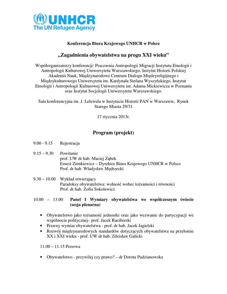 Konferencja Biura Krajowego UNHCR w Polsce „Zagadnienia obywatelstwa na progu XXI wieku” Współorganizatorzy konferencji: Pracownia Antropologii Migracji Instytutu Etnologii i Antropologii Kulturowej Uniwersytetu Warszawskiego, Instytut Historii Polskiej Akademii Nauk, Międzynarodowe Centrum Dialogu Międzyreligijnego i Międzykulturowego Uniwersytetu im. Kardynała Stefana Wyszyńskiego, Instytut Etnologii i Antropologii Kulturowej Uniwersytetu im. Adama Mickiewicza w Poznaniu oraz Instytut Socjologii Uniwersytetu Warszawskiego. Sala konferencyjna im. J. Lelewela w Instytucie Historii PAN w Warszawie, Rynek Starego Miasta 29/31 17 stycznia 2013r. Program (projekt) 9.00 - 9.15 Rejestracja 9.15 – 9.30 Powitanie prof. UW dr hab. Maciej Ząbek Ernest Zienkiewicz – Dyrektor Biura Krajowego UNHCR w Polsce Prof. dr hab. Władysław Mędrzecki 9.30 – 10.00 Wykład otwierający Paradoksy obywatelstwa: wolność wobec tożsamości i równości Prof. dr hab. Zofia Sokolewicz 10.00 – 13.00 • • • Panel I Wymiary obywatelstwa we współczesnym świecie (sesja plenarna) Obywatelstwo jako tożsamość jednostki oraz jako wezwanie do partycypacji we wspólnocie politycznej– prof. Jacek Raciborski Prawny wymiar obywatelstwa - prof. dr hab. Jacek Jagielski Rozwój międzynarodowych standardów dotyczących obywatelstwa na przełomie XX i XXI wieku - prof. UW dr hab. Zdzisław Galicki 11.00 – 11.15 Przerwa • Obywatelstwo - przywilej czy prawo? – dr Dorota Pudzianowska • • • • • • Ciągłość i zmiana. Nowa ustawa o obywatelstwie polskim - Mateusz Sora, Dyrektor Departamentu Obywatelstwa i Repatriacji w Ministerstwie Spraw Wewnętrznych Ku wyzwaniom XXIw. Ewolucja polskiego prawa o obywatelstwie - Agata Ewertyńska, Zastępca Dyrektora Wydziału Spraw Cudzoziemców Mazowieckim Urzędzie Wojewódzkim Obywatelstwo w podhalańskim dyskursie lokalnym – prof. UW dr hab. Anna Malewska “Obywatelstwo” w tradycji i nauczaniu Kościoła – prof. UKSW dr hab. Jarosław Różański Obywatelstwo i tożsamość mniejszości narodowej. Przykład dwujęzycznych, polsko-niemieckich, nazw miejscowości w województwie opolskim - prof. UW, dr hab. Sławomir Łodziński Polscy Żydzi – emigranci odzyskujący polskie obywatelstwo (tbc)- dr Kamila Dąbrowska Dyskusja 13.00 – 13.45 Lunch 13.45 - 15.15 Panel II Obywatelstwo w wymiarze regionalnym, krajowym i lokalnym (sesje równoległe) Sesja A. • Obywatelstwo z perspektywy społeczno-etycznej. Przypadek Wielkiej Brytanii – prof. Jan Balicki • Kurdowie w Polsce – na drodze dialogu i porozumienia – dr Maciej Kurcz • Nieobecny dylemat? Warunki naturalizacji cudzoziemców w Polsce - Marta Szaranowicz-Kusz • Kwestia obywatelstwa i przypadki bezpaństwowości w krajach Rady Współpracy Zatoki Arabskiej – Mustafa Switat Dyskusja Sesja B. • Kwestia tubylcza a status obywatela w Kamerunie - prof. dr hab. Ryszard Vorbrich • Problem narodu i obywatelstwa w podzielonym Sudanie - prof. UW dr hab. Maciej Ząbek • Obywatelstwo i etniczność. Budowanie państwa w warunkach różnorodności kulturowej – dr Małgorzata Szupejko • O obywatelu w Afryce – dr Krzysztof Trzciński Dyskusja 2 15.15 – 15.30 Przerwa 15.30 – 16.45 Panel III Obywatelstwo a status uchodźcy (sesja plenarna) • • • • Wyobrażony status uchodźcy i niechciane obywatelstwo. Tybetańczycy w Indiach - dr Natalia Bloch Złudny status – status uchodźcy. Wpływ zastanych regulacji prawnych na ludzkie losy – dr Izabela Czerniejewska, dr Katarzyna Kość-Ryżko Obywatelstwo i status uchodźcy a kwestia tożsamości. Argentyńscy uchodźcy w Hiszpanii w latach 70. i 80. XX w. – dr Magdalena Frątczak - Obojska Rio Grande - znikający punkt – dr Magdalena Krysińska – Kałużny Dyskusja 16.45 Zamknięcie konferencji 3