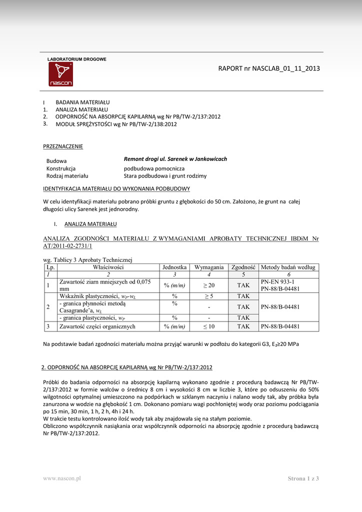 LABORATORIUM DROGOWE RAPORT nr NASCLAB_01_11_2013 I 1. 2. 3. BADANIA MATERIAŁU ANALIZA MATERIAŁU ODPORNOŚĆ NA ABSORPCJĘ KAPILARNĄ wg Nr PB/TW-2/137:2012 MODUŁ SPRĘŻYSTOŚCI wg Nr PB/TW-2/138:2012 PRZEZNACZENIE Budowa Konstrukcja Rodzaj materiału Remont drogi ul. Sarenek w Jankowicach podbudowa pomocnicza Stara podbudowa i grunt rodzimy IDENTYFIKACJA MATERIAŁU DO WYKONANIA PODBUDOWY W celu identyfikacji materiału pobrano próbki gruntu z głębokości do 50 cm. Założono, że grunt na całej długości ulicy Sarenek jest jednorodny. I. ANALIZA MATERIAŁU ANALIZA ZGODNOŚCI MATERIAŁU Z WYMAGANIAMI APROBATY TECHNICZNEJ IBDiM Nr AT/2011-02-2731/1 wg. Tablicy 3 Aprobaty Technicznej Lp. Właściwości 1 2 Zawartość ziarn mniejszych od 0,075 1 mm Wskaźnik plastyczności, wP-wL - granica płynności metodą 2 Casagrande’a, wL - granica plastyczności, wP 3 Zawartość części organicznych Zgodność Metody badań według 5 6 PN-EN 933-1 TAK PN-88/B-04481 TAK Jednostka 3 Wymagania 4 % (m/m) ≥ 20 % % ≥5 - TAK PN-88/B-04481 % % (m/m) ≤ 10 TAK TAK PN-88/B-04481 Na podstawie badań zgodności materiału można przyjąć warunki w podłożu do kategorii G3, E₂≥20 MPa 2. ODPORNOŚĆ NA ABSORPCJĘ KAPILARNĄ wg Nr PB/TW-2/137:2012 Próbki do badania odporności na absorpcję kapilarną wykonano zgodnie z procedurą badawczą Nr PB/TW2/137:2012 w formie walców o średnicy 8 cm i wysokości 8 cm w liczbie 3, które po odsuszeniu do 50% wilgotności optymalnej umieszczono na podpórkach w szklanym naczyniu i nalano wody tak, aby próbka była zanurzona w wodzie na głębokość 1 cm. Dokonano pomiaru wagi pochłoniętej wody oraz poziomu podciągania po 15 min, 30 min, 1 h, 2 h, 4h i 24 h. W trakcie testu kontrolowano ilość wody tak aby znajdowała się na stałym poziomie. Obliczono współczynnik nasiąkania oraz współczynnik odporności na absorpcję zgodnie z procedurą badawczą Nr PB/TW-2/137:2012. www.nascon.pl Strona 1 z 3 WYNIKI: a. Próbka 1 2 Współczynnik nasiąkania [kg/m ]: 0,38 Wysokość poziomu zawilgocenia [m]: 0,032 Współczynnik odporności na absorpcję: 153,09 b. Prókba 2 Współczynnik nasiąkania [kg/m2]:0,43 Wysokość poziomu zawilgocenia[m]:0,039 Współczynnik odporności na absorpcję:132,4 c. Próbka 3 2 Współczynnik nasiąkania [kg/m ]:0,36 Wysokość poziomu zawilgocenia[m]:0,031 Współczynnik odporności na absorpcję:158,0 Średnie wartości dla wszystkich trzech próbek: Współczynnik nasiąkania [kg/m2]:0,39 Wysokość poziomu zawilgocenia [m]:0,034 Współczynnik odporności na absorpcję:147,83 www.nascon.pl Strona 2 z 3 Średni współczynnik nasiąkania jest mniejszy od 0,55 i spełnia wymagania. Średni wspólczynnik odporności na absorpcję jest większy od wymaganego równego 80. 3. MODUŁ SPRĘŻYSTOŚCI wg Nr PB/TW-2/138:2012 3.1 Moduł sprężystości podłużnej Young a W wyniku badań uzyskana została wartość średnia dla próbki E = 1215 MPa. Badania wykonano wg procedury badawczej opracowanej na podstawie normy PN-EN 13 8 - 3 Mieszanki niezwiązane i związane spoiwem hydraulicznym. Część 3: Metoda oznaczania modułu sprężystości mieszanek związanych spoiwem hydraulicznym z uwzględnieniem wymagań aparaturowych podanych w PN-EN 13286-41. Badania przeprowadzono na stanowisku badawczym składającym się z maszyny wytrzymałościowej MTS Criterion oraz Systemu Cyfrowej Korelacji Obrazu DIC z głowicą -400 firmy Dantec Dynamics. 3.2 Kontrola procesu konsolidacji materiału Dodatkowo skontrolowano laboratoryjnie proces wzmacniania się konsolidacji materiału. Potwierdzono zdolność materiału do wzmacniania się w wyniku cyklicznych obciążeń. W badaniu przeprowadzono cykle 50 i 150 obciążeń. Pomiar modułu sprężystości E wykonano dla 3 różnych stanów: przy zerowym obciążeniu, po 50 cyklach obciążenia i odciążenia oraz po 150 cyklach. W celu wyznaczenia odkształceń próbkę poddano przy użyciu maszyny wytrzymałościowej MTS lokalnym obciążeniom o zmiennej wartości – od 50 do 350 kPa. LABORATORIUM Specjalista ds. Jakości M. Garbacz-Skubis www.nascon.pl Strona 3 z 3