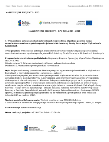 Miasto i Gmina Siewierz - http://www.siewierz.pl/ Data umieszczenia informacji: 2013-04-30 13:46:33 NASZE UNIJNE PROJEKTY - RPO NASZE UNIJNE PROJEKTY – RPO WSL 2014 - 2020 1. Wzmocnienie potencjału służb ratowniczych województwa śląskiego poprzez zakup samochodu ratowniczo – gaśniczego dla jednostki Ochotniczej Straży Pożarnej w Wojkowicach Kościelnych Tytuł projektu: Wzmocnienie potencjału służb ratowniczych województwa śląskiego poprzez zakup samochodu ratowniczo – gaśniczego dla jednostki Ochotniczej Straży Pożarnej w Wojkowicach Kościelnych Program/priorytet/działanie/poddziałanie: Regionalny Program Operacyjny Województwa Śląskiego na lata 2014-2020 Oś priorytetowa V. Ochrona środowiska i efektywne wykorzystanie zasobów Działanie 5.5. Wzmocnienie potencjału służb ratowniczych Opis: Projekt realizowany przez Gminę Siewierz polega na wyposażeniu jednostki OSP w Wojkowicach Kościelnych w nowy ciężki samochód – ratowniczo – gaśniczy. Głównym celem projektu jest wzmocnienie potencjału OSP Wojkowice Kościelne do przeciwdziałania i usuwania skutków klęsk żywiołowych, tj. prowadzenia akcji ratowniczych związanych z wystąpieniem niekorzystnych zdarzeń związanych z klimatem. Zakup wyposażenia przyczyni się do poprawy stanu gotowości operacyjnej OSP w Wojkowicach Kościelnych i skuteczności jej działań, co przełoży się na zwiększenie bezpieczeństwa mieszkańców obszaru jej działania – zarówno Wojkowic Kościelnych, Gminy Siewierz i całego Powiatu będzińskiego – obszaru działania Komendy Powiatowej Państwowej Straży Pożarnej w Będzinie. Przynależność jednostki do Krajowego Sytemu Ratowniczo – Gaśniczego (KSRG) sprawia, że realizacji przedsięwzięcia przyczyni się do wzmocnienia potencjału nie tylko wskazanej jednostki OSP ale i całego KSRG. Wartość projektu/dofinansowanie: Wartość projektu wynosi 803805,00 złotych a dofinansowanie ze środków Europejskiego Funduszu Rozwoju Regionalnego wynosi 138844,53 złotych. Stan realizacji: zakończono realizację. Okres realizacji projektu: od 20-07-2016 do 01-12-2016 r. NASZE UNIJNE PROJEKTY - RPO WSL 2007 - 2013 1. Wykonanie platformy widokowej wraz ze schodami w wieży bramnej Zamku w Siewierzu Tytuł projektu: Wykonanie platformy widokowej wraz ze schodami w wieży bramnej Zamku w Siewierzu Program/priorytet/działanie/poddziałanie: Regionalny Program Operacyjny Województwa Śląskiego na lata 2007-2013 - Program Rozwoju Subregionu Centralnego Priorytet IV. Kultura Działanie 4.1. Infrastruktura kultury Opis: Przedmiotem projektu jest wykonanie platformy widokowej wraz ze schodami w wieży bramnej Zamku w Siewierzu. W zakres projektu wchodzi: wykonanie prac zabezpieczających wieżę bramną, uzupełnienie znaczących ubytków murów w obrębie wieży oraz wykonanie wieloobiegowej klatki schodowej wraz z platformą widokową w konstrukcji stalowej. Wartość projektu/dofinansowanie: Wartość projektu wynosi 319.967,62 zł a dofinansowanie ze środków Europejskiego Funduszu Rozwoju Regionalnego wynosi 85% tj. 271.972,47 zł. Stan realizacji: zakończono realizację. Okres realizacji projektu: od 06-08-2007 do 31-07-2009 r. 2. Prace budowlano – konserwatorskie na Zamku w Siewierzu - etap II Tytuł projektu: Prace budowlano – konserwatorskie na Zamku w Siewierzu – etap II Program/priorytet/działanie/poddziałanie: Regionalny Program Operacyjny Województwa Śląskiego na lata 2007-2013, Priorytet IV. Kultura, Działanie 4.1. Infrastruktura kultury Projekt Kompleksowe prace budowlano – konserwatorskie na Zamku w Siewierzu – etap II uzyskał dofinansowanie w wysokości 1.141.162,80 zł w ramach Działania 4.1 Infrastruktura kultury Priorytet IV Kultura Regionalnego Programu Operacyjnego Województwa Śląskiego na lata 2007-2013. Dofinansowane przedsięwzięcie zakładało zabezpieczenie ruin zamku. Skala prowadzonych prac pozwala mówić o rewaloryzacji obiektu, tj. uporządkowaniu Zamku i jego otoczenia, odnowieniu lub odtworzeniu części elementów architektonicznych. Zostało to osiągnięte dzięki następującym działaniom: rekonstrukcji mostu bramnego wraz z kładką dla pieszych, wykonaniu bruku w barbakanie i na dziedzińcu wraz z podbudową, wykonaniu podłogi pod wieżą, oczyszczeniu murów z graffiti, wykonaniu prac konserwatorskich, remontowych, zabezpieczających i uzupełniających mury barbakanu, wieży oraz ściany północno – zachodniej, ekspozycji reliktów stołpu wraz z jego zabezpieczeniem i nadmurowaniem do poziomu dziedzińca, wybiciu wejścia ewakuacyjnego wraz z montażem stylizowanych wrót dębowych, odtworzeniu nadproży, przebudowie płyty nad piwnicą celem przekształcenia jej na scenę. Projekt charakteryzował się szerokim oddziaływaniem społecznym, gospodarczym i ekonomicznym. Jego realizacja pozwoliła zapewnić społeczności lokalnej bogatą ofertę kulturalną w oparciu o niewykorzystany dotychczas w dziedzinie kultury i turystyki Zamek Biskupów Krakowskich w Siewierzu. Stan realizacji: zakończono realizację. Okres realizacji projektu: od 05-06-2008 do 30-06-2009 r. 3. Rozwój infrastruktury aktywnych form turystyki i rekreacji Centrum Sportów Letnich i Wodnych – Pogoria Tytuł projektu: Rozwój infrastruktury aktywnych form turystyki i rekreacji Centrum Sportów Letnich i Wodnych – Pogoria Program/priorytet/działanie/poddziałanie: Regionalny Program Operacyjny Województwa Śląskiego na lata 2007-2013 - Program Rozwoju Subregionu Centralnego Priorytet III. Turystyka Działanie 3.2. Infrastruktura okołoturystyczna/podmioty publiczne Opis: Przedmiotem projektu jest rozwój infrastruktury aktywnych form turystyki i rekreacji. Realizowany on będzie na terenie czterech gmin: Dąbrowy Górniczej, Będzina, Sławkowa i Siewierza. W wyniku projektu zostanie utworzona infrastruktura sportowo-rekreacyjna przy Zamku w Siewierzu w postaci 2 kortów tenisowych, bieżni, placu zabaw, skate 