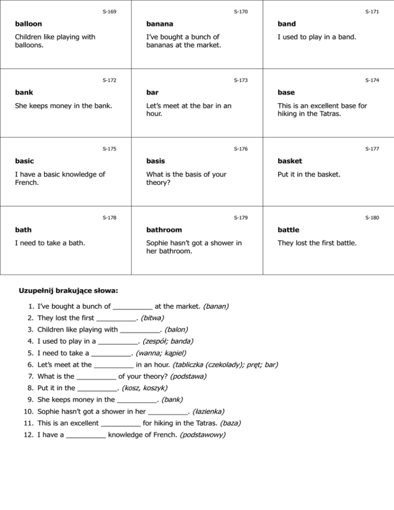 S-169 S-170 S-171 balloon banana band Children like playing with balloons. I’ve bought a bunch of bananas at the market. I used to play in a band. S-172 S-173 S-174 bank bar base She keeps money in the bank. Let’s meet at the bar in an hour. This is an excellent base for hiking in the Tatras. S-175 S-176 S-177 basic basis basket I have a basic knowledge of French. What is the basis of your theory? Put it in the basket. S-178 S-179 S-180 bath bathroom battle I need to take a bath. Sophie hasn’t got a shower in her bathroom. They lost the first battle. Uzupełnij brakujące słowa: 1. I’ve bought a bunch of __________ at the market. (banan) 2. They lost the first __________. (bitwa) 3. Children like playing with __________. (balon) 4. I used to play in a __________. (zespół; banda) 5. I need to take a __________. (wanna; kąpiel) 6. Let’s meet at the __________ in an hour. (tabliczka (czekolady); pręt; bar) 7. What is the __________ of your theory? (podstawa) 8. Put it in the __________. (kosz, koszyk) 9. She keeps money in the __________. (bank) 10. Sophie hasn’t got a shower in her __________. (łazienka) 11. This is an excellent __________ for hiking in the Tatras. (baza) 12. I have a __________ knowledge of French. (podstawowy) S-171 S-170 S-169 zespół; banda banan balon Grywałem w zespole. Kupiłem kiść bananów na targu. Dzieci lubią bawić się balonami. www.isel.edu.pl www.isel.edu.pl www.isel.edu.pl S-174 S-173 S-172 baza tabliczka (czekolady); pręt; bar To jest świetna baza do wycieczek w Tatry. Spotkajmy się w barze za godzinę. bank Ona trzyma pieniądze w banku. www.isel.edu.pl www.isel.edu.pl www.isel.edu.pl S-177 S-176 S-175 kosz, koszyk podstawa podstawowy Włóż to do koszyka. Co jest podstawą twojej teorii? Mam podstawową znajomość francuskiego. (Znam podstawy francuskiego.) www.isel.edu.pl www.isel.edu.pl www.isel.edu.pl S-180 S-179 S-178 bitwa łazienka wanna; kąpiel Przegrali pierwszą bitwę. Sophie nie ma prysznica w swojej łazience. Muszę się wykąpać. www.isel.edu.pl Odpowiedzi: 1. bananas 2. battle 3. balloons 4. band 5. bath 6. bar 7. basis 8. basket 9. bank 10. bathroom 11. base 12. basic www.isel.edu.pl www.isel.edu.pl
