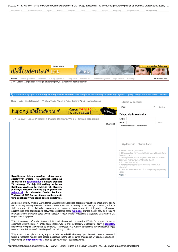 24.02.2015 IV Halowy Turniej Piłkarski o Puchar Dziekana WZ UŁ trwają zgłoszenia halowy turniej piłkarski o puchar dziekana wz uł zgłoszenia zapisy … dlaStudenta.pl Praca dla Studenta Sport Kultura Rozrywka Lokale Stancje Muzyka Komputery Naszym zdaniem Demotywatory Logowanie / Rejestracja Zmień miasto Studia Baza organizacji Uczelnie Szkoły językowe Księgarnie Niezbędnik Poradnik najemcy Wydarzenia Ceneo.pl Studia: Polska Z życia uczelni Organizacje studenckie Akademiki Konferencje Odtwarzacze MP3/MP4 Biblioteki i czytelnie Wykłady otwarte Z organizacji Telewizory Samorządy studenckie Edukacja Kursy, Szkolenia Księgarnie Telefony komórkowe Studencka polityka Antykwariaty Koła naukowe Targi Projekty Uroda Punkty ksero Świat nauki Media studenckie Festiwale Nauki Aparaty fotograficzne Bilety okresowe Sport akademicki Wydarzenia naukowe Zegarki Biura karier Odzież damska Imprezy studenckie Odzież męska Drzwi Otwarte Instrumenty muzyczne Wydarzenia inne Ebooki Studia w Łodzi Sport akademicki IV Halowy Turniej Piłkarski o Puchar Dziekana WZ UŁ trwają zgłoszenia Studia w mieście: Łódź Zmień Zaloguj się do akademika IV Halowy Turniej Piłkarski o Puchar Dziekana WZ UŁ trwają zgłoszenia Login: 20150218 Hasło: Wlazł Zapomniałem hasła | Zarejestruj się! Wydarzenia Studia Łódź » ESNOLYMPICS (Warszawa) » I Ogólnopolska Konferencja Doktorantów Nauk o Życiu – BioOpen (Łódź) » Strategie zarządzania międzynarodowymi łańcuchami dostaw na miarę wyzwań XXI wieku (Łódź) » Job Interview (Łódź) » Kongres Profesjonalistów Public Relations 2015 (Rzeszów) » Creative Vibes: Kreatywnością napędzamy gospodarkę (Łódź) Rywalizacja, dobra atmosfera i duża dawka sportowych emocji – to wszystko czeka już 21 marca na zawodników i kibiców podczas IV Halowego Turnieju Piłkarskiego o Puchar Dziekana Wydziału Zarządzania UŁ. Drużyny piłkarzyamatorów zmierzą się w grze o tytuł najlepszej, nie zabraknie również konkursu Turbokozak WZ. Po raz pierwszy odbędzie się turniej pokazowy dzieci ze szkółki sportowej. więcej » Już po raz czwarty Wydział Zarządzania Uniwersytetu Łódzkiego zaprasza wszystkich entuzjastów sportu na IV Halowy Turniej Piłkarski o Puchar Dziekana WZ UŁ. – Turniej to już tradycja Wydziału, która na stałe wpisała się w kalendarz wydarzeń uczelnianych. Jego celem jest integracja społeczności akademickiej oraz popularyzacja aktywnego spędzania czasu wolnego. Bardzo cieszy nas, że z roku na rok wydarzenie przyciąga coraz więcej kibiców – mówi Michał Wadzyński z Wydziału Zarządzania UŁ, organizator rozgrywek. W turnieju mogą brać udział studenci, doktoranci, absolwenci i pracownicy WZ UŁ. Pierwszym etapem są eliminacje drużyn, które w finale będą konkurować o tytuł najlepszej. Dodatkowo każdy z zespołów finałowych wytypuje zawodnika do konkursu Turbokozak WZ. Cztery konkurencje sprawnościowe będą testem szybkości, zwinności i umiejętności technicznych piłkarzy. W tym roku po raz pierwszy zagrają także dzieci ze szkółki piłkarskiej Sport Perfect, które w przerwach turnieju rozegrają między sobą mecze pokazowe. Najmłodsi piłkarze zmierzą się w trzech spotkaniach i udowodnią, że najważniejsze w grze są sportowy duch i zaangażowanie. http://lodz.dlastudenta.pl/studia/artykul/IV_Halowy_Turniej_Pilkarski_o_Puchar_Dziekana_WZ_UL_trwaja_zgloszenia,111308.html 1/2 24.02.2015 IV Halowy Turniej Piłkarski o Puchar Dziekana WZ UŁ trwają zgłoszenia halowy turniej piłkarski o puchar dziekana wz uł zgłoszenia zapisy … IV Halowy Turniej Piłkarski o Puchar Dziekana WZ UŁ odbędzie się 21 marca w Centrum Sportu UŁ. Zgłoszenia drużyn trwają do 2 marca 2015 r. Szczegóły wydarzenia, karta zgłoszeniowa i regulamin zawodów znajdują się na stronie http://turniej.wz.uni.lodz.pl. IV Halowy Turniej Piłkarski o Puchar Dziekana Wydziału Zarządzania UŁ Centrum Sportu UŁ, ul. Styrskiej 20/26, Łódź 21 marca 2015 r. Więcej na http://turniej.wz.uni.lodz.pl Poradnik najemcy ip » » » » Kupić czy wynająć? Wzór umowy najmu Szczegółowo co w umowie Szara strefa, rachunki, długość umowy i wakacje » Jaki budynek? Co ważnego w mieszkaniu? » Jak szukać: samemu czy przez agencję? więcej » Sport akademicki Red Bull Paper Wings studenckie zawody samolotów z papieru Do Polski po raz czwarty zawitają legendarne zawody samolotów z papieru Red Bull Paper Wings! Liceum Ekspresowo Nauka On-line. Sprawdź Ofertę. Liceum Dla Dorosłych. » Polska gospodarzem Akademickich Mistrzostw Europy we wspinaczce sportowej 2015 » Studenckie rejsy na największą imprezę w Europie » KaszebeRunda 2014 » Akademickie Mistrzostwa Świata w kolarstwie górskim » Powstały trzy nowe trasy narciarstwa biegowego więcej » Handluj z Trading 212 Dodaj do: Handluj online tylko 1 kliknięciem! Superszybko i łatwo. Demo z 50000zł Praca Łódź | Praca dla Studenta Komentarze szukaj dodaj komentarz Redakcja dlaStudenta.pl nie ponosi odpowiedzialności za wypowiedzi Internautów opublikowane na stronach serwisu oraz zastrzega sobie prawo do redagowania, skracania bądź usuwania komentarzy zawierających treści zabronione przez prawo, uznawane za obraźliwie lub naruszające zasady współżycia społecznego. Brak komentarzy. Inne działy dlaStudenta.pl Znajdź nas na Facebooku dlaStudenta.pl Praca Rozrywka Praktyki Gdzie zjeść Stancje Kultura Informator miejski dlaFaceta Sport dlaStudentki Komputery Naszym zdaniem Galeria Muzyka Prawo Jazdy Taniec Ogłoszenia dlaMaturzysty Finanse Turystyka Walentynki WOŚP Lubię to! 21 725 osób lubi obiekt dlaStudenta.pl. Wtyczka społecznościowa Facebooka Prawo Białystok | Bydgoszcz | Częstochowa | Gliwice | Katowice | Kielce | Kraków | Łódź | Lublin | Olsztyn | Opole | Poznań | Rzeszów | Szczecin | Toruń | Warszawa | Wrocław | Zabrze | Zielona Góra | Trójmiasto O Portalu | Reklama | Patronaty | Współpr