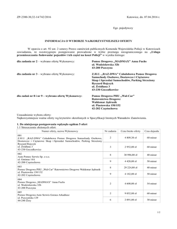 ZP-2380-30,32-14/742/2016 Katowice, dn. 07.04.2016 r. Egz. pojedynczy INFORMACJA O WYBORZE NAJKORZYSTNIEJSZEJ OFERTY W oparciu o art. 92 ust. 2 ustawy Prawo zamówień publicznych Komenda Wojewódzka Policji w Katowicach zawiadamia, że rozstrzygnięto postępowanie prowadzone w trybie przetargu nieograniczonego na „Usługa przemieszczania /holowania/ pojazdów i ich części na koszt Policji” w wyniku którego: dla zadania nr 2 – wybrano ofertę Wykonawcy: Pomoc Drogowa „MADMAX” Anna Fuchs ul. Wodzisławska 32b 43-200 Pszczyna dla zadania nr 3 – wybrano ofertę Wykonawcy: Z.H.U. „RAZ-DWA” Całodobowa Pomoc Drogowa Samochody Osobowe, Dostawcze i Ciężarowe Skup i Sprzedaż Samochodów, Parking Strzeżony Ryszard Rojczyk ul. Źródlana 3 43-230 Goczałkowice dla zadań nr 8 i nr 9 – wybrano ofertę Wykonawcy: Pomoc Drogowa PHU „Wal-Car” Ratownictwo Drogowe Waldemar Jędrusik ul. Piastowska 150/152 42-202 Częstochowa Uzasadnienie wyboru oferty: Najkorzystniejsze ważne oferty wg kryteriów określonych w Specyfikacji Istotnych Warunków Zamówienia. 1. Do niniejszego postępowania wpłynęło ogółem 5 ofert 1.1 Streszczenie złożonych ofert: Numer oferty, nazwa Wykonawcy Nr zadania Cena brutto oferty Czas dojazdu 2 4 809,30 zł 60 minut 3 2 952,00 zł 60 minut 002 Auto Pomoc Serwis Sp. z o.o. ul. Gminna 14A 42-200 Częstochowa 8 30 996,00 zł 40 minut 9 4 428,00 zł 50 minut 003 Pomoc Drogowa PHU „Wal-Car” Ratownictwo Drogowe Waldemar Jędrusik ul. Piastowska 150/152 42-202 Częstochowa 8 29 224,80 zł 40 minut 9 4 182,00 zł 50 minut 2 4 600,00 zł 54 minut 2 9 052,80 zł 60 minut 6 2 091,00 zł 30 minut 001 Z.H.U. „RAZ-DWA” Całodobowa Pomoc Drogowa Samochody Osobowe, Dostawcze i Ciężarowe Skup i Sprzedaż Samochodów, Parking Strzeżony Ryszard Rojczyk ul. Źródlana 3 43-230 Goczałkowice 004 Pomoc Drogowa „MADMAX” Anna Fuchs ul. Wodzisławska 32b 43-200 Pszczyna 005 Pomoc Drogowa Auto Serwis Goraus Arkadiusz ul. Pszczyńska 129 44-240 Żory 1/2 1.2 Porównanie złożonych ofert: Numer oferty, nazwa Wykonawcy 001 Z.H.U. „RAZ-DWA” Całodobowa Pomoc Drogowa Samochody Osobowe, Dostawcze i Ciężarowe Skup i Sprzedaż Samochodów, Parking Strzeżony Ryszard Rojczyk ul. Źródlana 3 43-230 Goczałkowice 002 Auto Pomoc Serwis Sp. z o.o. ul. Gminna 14A 42-200 Częstochowa 003 Pomoc Drogowa PHU „Wal-Car” Ratownictwo Drogowe Waldemar Jędrusik ul. Piastowska 150/152 42-202 Częstochowa 004 Pomoc Drogowa „MADMAX” Anna Fuchs ul. Wodzisławska 32b 43-200 Pszczyna 005 Pomoc Drogowa Auto Serwis Goraus Arkadiusz ul. Pszczyńska 129 44-240 Żory Numer zadania Liczba punktów w kryterium Łączna punktacja Cena (maks.90) Czas dojazdu (maks 10) 2 86,08 9,00 95,08 3 90,00 10,00 100,00 8 84,86 10,00 94,86 9 85,00 10,00 95,00 8 90,00 10,00 100,00 9 90,00 10,00 100,00 2 90,00 10,00 100,00 2 – – – 6 – – – Wykonano w 1 egz. M.K. zamieszczono na stronie internetowej 2/2