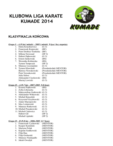 KLUBOWA LIGA KARATE KUMADE 2014 KLASYFIKACJA KOŃCOWA Grupa I – A (9 lat i młodsi – 2005 i młodsi 9 kyu i bez stopnia): 1. Daria Kraszkiewicz (G 3) 2. Franciszek Krajewski (BF) 3. Piotr Drobisz-Yoshioka (BF) 4. Milena Nowosad (SP 2) 5. Hubert Dąbrowski (G 3) 6. Ernest Jankowiak (BS) 7. Weronika Kobierska (BS) Tymon Tempczyk (SP 2) 8. Mateusz Liczmański (G 3) 9. Tymon Klawiński (Przedszkolaki MENTOR) Bartosz Nowakowski (Przedszkolaki MENTOR) Piotr Nowakowski (Przedszkolaki MENTOR) Julia Sidwa (G 3) Aleksander Ciechowski (BS) Maciej Lewicki (G 3) Grupa II – A (9-7 lat – 2007-2005 9-8 kyu): 1. Kosma Piątkowski (BS) 2. Zofia Liberacka (G 3) 3. Maksymilian Gutkowski (G 3) 4. Aleksander Witkowski (G 3) 5. Michał Boncalski (G 3) 6. Krzysztof Grzybowski (G 3) 7. Adam Maciejewski (G 3) 8. Max Leśniewski (G 3) 9. Mateusz Rutkowski (G 3) 10. Michał Prusakowski (G 3) 11. Michał Ciałowicz (G 3) Hubert Gil (SP 2) Michał Lipiński (SP 2) Grupa II – B (9-8 lat – 2006-2005 1. Franciszek Cychowski 2. Kacper Kamiński 3. Martyna Polak 4. Kajetan Szałkowski 5. Filip Rau 6. Filip Groberski 7. Mateusz Niedojadło 8. Jakub Owedyk 8-7 kyu): (MENTOR) (MENTOR) (MENTOR) (MENTOR) (MENTOR) (MENTOR) (MENTOR) (MENTOR) Jakub Łężyk 9. Jan Felsl Hubert Maciejewski Szymon Majchrzak Mikołaj Żywczak (MENTOR) (MENTOR) (MENTOR) (MENTOR) (MENTOR) Grupa III – A (10-13 lat – 2004-2001 9-7 kyu): 1. Maja Wiśniewska (G 3) 2. Martyna Komorowska (MENTOR) 3. Paweł Cichecki (MENTOR) 4. Zofia Przyborowska (SP 2) 5. Julia Piórkowska (MENTOR) 6. Bartosz Blangiewicz (SP 2) 7. Kornelia Kamińska (G 3) 8. Bartosz Śliwiński (G 3) Grupa III – B (9-11 lat – 2005-2003 6-4 kyu): 1. Rita Krause (MENTOR) 2. Patrycja Niewiadomska (MENTOR) 3. Maksym Zielaskowski (MENTOR) 4. Florentyna Śledź (MENTOR) 5. Stanisław Walczak (MENTOR) 6. Wojciech Skowroński (MENTOR) 7. Jan Zieliński (MENTOR) 8. Inga Boncalska (MENTOR) 9. Monika Lewandowska (MENTOR) 10. Piotr Kłosowski (MENTOR) Dominika Kowalkowska (MENTOR) 11. Patryk Boruszewski (MENTOR) Pola Bujnarowska (MENTOR) Filip Kowalski (MENTOR) Olga Pawlikowska (MENTOR) Grupa IV – A dziewczyny (12-14 lat – 2002-2000 6-4 kyu): 1. Izabela Włudarczyk (MENTOR) 2. Karolina Czerwińska (MENTOR) 3. Julia Bujnarowska (MENTOR) 4. Marta Milewska (MENTOR) 5. Magdalena Rutkowska (MENTOR) 6. Zuzanna Zalewska (MENTOR) 7. Laura Janiszewska (MENTOR) Grupa IV – B chłopcy (12-13 lat – 2002-2001 6-4 kyu): 1. Jakub Dąbrowski (MENTOR) 2. Jakub Witalis (MENTOR) 3. Bartosz Lewandowski (MENTOR) 4. Tymon Wiklendt (MENTOR) 5. Jakub Filipiak (MENTOR) 6. Bartłomiej Podkrólewicz (MENTOR) 7. Mateusz Bartosiak (MENTOR) Grupa V – A (13-17 lat – 2001-1997 6-1 kyu): 1. Jakub Obiala (MENTOR) 2. Mateusz Tucholski (MENTOR) 3. Łukasz Wessel (MENTOR) 4. Kacper Karbowiak (MENTOR) 5. Wojciech Sipak (MENTOR) 6. Adrian Boruszewski 7. Kacper Wiklendt 8. Dawid Algusiewicz 9. Bartosz Słupczewski 10. Michał Ochociński 11. Mikołaj Lewandowski Jakub Słupczewski Aleksander Wieczarek Grupa Szkolna Zławieś Wielka: 1. Emilia Jasik 2. Paulina Miedzianowska 3. Patryk Trzciński 4. Alana Gałek Grupa Szkolna Łubianka: 1. Julian Szwechowicz 2. Zuzanna Podgórska 3. Maja Kluska 4. Jakub Żebrowski Wiktor Sulka Agata Młodzianowska 5. Joanna Górna (MENTOR) (MENTOR) (MENTOR) (MENTOR) (MENTOR) (MENTOR) (MENTOR) (MENTOR)