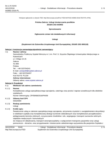 Dz.U./S S243 16/12/2016 443902-2016-PL - - Usługi - Dodatkowe informacje - Procedura otwarta 1/6 Niniejsze ogłoszenie w witrynie TED: http://ted.europa.eu/udl?uri=TED:NOTICE:443902-2016:TEXT:PL:HTML Polska-Zabrze: Usługi dostarczania posiłków 2016/S 243-443902 Sprostowanie Ogłoszenie zmian lub dodatkowych informacji Usługi (Suplement do Dziennika Urzędowego Unii Europejskiej, 2016/S 202-365118) Sekcja I: Instytucja zamawiająca/podmiot zamawiający I.1) Nazwa i adresy Samodzielny Publiczny Szpital Kliniczny nr 1 im. Prof. S. Szyszko Śląskiego Uniwersytetu Medycznego w Katowicach ul. 3 Maja 13-15 Zabrze 41-800 Polska Tel.: +48 323704241 E-mail: [email protected] Faks: +48 323704207 Kod NUTS: PL229 Adresy internetowe: Główny adres: www.szpital.zabrze.pl Sekcja II: Przedmiot II.1) Wielkość lub zakres zamówienia II.1.1) Nazwa: Kompleksowa usługa specjalistycznego sprzątania, cateringu oraz prania i napraw szwalniczych dla obiektów szpitalnych. Numer referencyjny: ZP/59/68/2016/PN/59 II.1.2) Główny kod CPV 55520000 II.1.3) Rodzaj zamówienia Usługi II.1.4) Krótki opis: Świadczenie usług w zakresie specjalistycznego sprzątania, utrzymania czystości z uwzględnieniem dezynfekcji w obiektach szpitala oraz kompleksowej obsługi kuchenek oddziałowych oraz kompleksowe porządkowanie i pielęgnowanie terenów zielonych, oczyszczanie chodników i ulic, segregacja i transport surowców wtórnych, odpadów medycznych i komunalnych do miejsca ich składowania, transport wewnątrzszpitalny z wyłączeniem transportu pacjentów oraz usługi pomocnicze – doraźne, oraz przygotowanie i dostarczanie całodziennego wyżywienia dla pacjentów Szpitala z 16/12/2016 S243 http://ted.europa.eu/TED - - Usługi - Dodatkowe informacje - Procedura otwarta Suplement do Dziennika Urzędowego Unii Europejskiej 1/6 Dz.U./S S243 16/12/2016 443902-2016-PL - - Usługi - Dodatkowe informacje - Procedura otwarta 2/6 uwzględnieniem zaleceń dietetycznych w tym przygotowanie żywienia dla dzieci w wieku od 0 do 1 roku życia oraz usługi pralnicze i naprawy szwalnicze wraz z transportem dla obiektów Szpitalnych z siedzibą przy ulicy 3go Maja 13-15 oraz przy ulicy Koziołka 1. Sekcja VI: Informacje uzupełniające VI.5) Data wysłania niniejszego ogłoszenia: 14/12/2016 VI.6) Numer pierwotnego ogłoszenia Numer ogłoszenia w Dz.Urz. UE – OJ/S: 2016/S 202-365118 Sekcja VII: Zmiany VII.1) Informacje do zmiany lub dodania VII.1.2) Tekst, który należy poprawić w pierwotnym ogłoszeniu Numer sekcji: II.1.2 Miejsce, w którym znajduje się tekst do modyfikacji: Główny kod CPV Zamiast: 90910000 Powinno być: 55520000 Numer sekcji: II.2.2) Miejsce, w którym znajduje się tekst do modyfikacji: Dodatkowy kod lub kody CPV Zamiast: 55320000 55520000 98310000 77310000 Powinno być: 55320000 98310000 Numer sekcji: II.1.1 Miejsce, w którym znajduje się tekst do modyfikacji: Nazwa Zamiast: Nazwa: Kompleksowa usługa specjalistycznego sprzątania, cateringu oraz prania i napraw szwalniczych dla obiektów szpitalnych. Numer referencyjny: ZP/59/68/2016/PN/59. Powinno być: Nazwa: Kompleksowa usługa cateringu oraz prania i napraw szwalniczych dla obiektów szpitalnych – 2 zadania. Numer referencyjny: ZP/59/68/2016/PN/59. Numer sekcji: II.1.4 Miejsce, w którym znajduje się tekst do modyfikacji: Krótki opis Zamiast: Świadczenie usług w zakresie specjalistycznego sprzątania, utrzymania czystości z uwzględnieniem dezynfekcji w obiektach szpitala oraz kompleksowej obsługi kuchenek oddziałowych oraz kompleksowe porządkowanie i pielęgnowanie terenów zielonych, oczyszczanie chodników i ulic, segregacja i transport surowców wtórnych, odpadów medycznych i komunalnych 16/12/2016 S243 http://ted.europa.eu/TED - - Usługi - Dodatkowe informacje - Procedura otwarta Suplement do Dziennika Urzędowego Unii Europejskiej 2/6 Dz.U./S S243 16/12/2016 443902-2016-PL - - Usługi - Dodatkowe informacje - Procedura otwarta 3/6 do miejsca ich składowania, transport wewnątrzszpitalny z wyłączeniem transportu pacjentów oraz usługi pomocnicze – doraźne, oraz przygotowanie i dostarczanie całodziennego wyżywienia dla pacjentów Szpitala z uwzględnieniem zaleceń dietetycznych w tym przygotowanie żywienia dla dzieci w wieku od 0 do 1 roku życia oraz usługi pralnicze i naprawy szwalnicze wraz z transportem dla obiektów Szpitalnych z siedzibą przy ulicy 3go Maja 13-15 oraz przy ulicy Koziołka 1. Powinno być: W zakresie zadania nr 1: Przygotowanie i dostarczanie całodziennego wyżywienia dla pacjentów Szpitala z uwzględnieniem zaleceń dietetycznych W zakresie zadania nr 2 Usługi pralnicze i naprawy szwalnicze wraz z transportem dla obiektów Szpitalnych z siedzibą przy ulicy 3-go Maja 13-15 oraz przy ulicy Koziołka 1 Zmodyfikowana Specyfikacja Istotnych Warunków Zamówienia wraz z załącznikami znajduje się na stronie internetowej Zamawiającego www.szpital.zabrze.pl Numer sekcji: II.1.6 Miejsce, w którym znajduje się tekst do modyfikacji: Informacja o częściach Zamiast: To zamówienie podzielone jest na części: nie. Powinno być: To zamówienie podzielone jest na części: tak Oferty można składać w odniesieniu do wszystkich części. Numer sekcji: II.2.4 Miejsce, w którym znajduje się tekst do modyfikacji: Opis zamówienia Zamiast: Świadczenie usług w zakresie specjalistycznego sprzątania, utrzymania czystości z uwzględnieniem dezynfekcji w obiektach szpitala oraz kompleksowej obsługi kuchenek oddziałowych oraz kompleksowe porządkowanie i pielęgnowanie terenów zielonych, oczyszczanie chodników i ulic, segregacja i transport surowców wtórnych,odpadów medycznych i komunalnych do miejsca ich składowania, transport wewnątrzszpitalny z wyłączeniem transportu pacjentów oraz usługi pomocnicze – doraźne, oraz przygotowanie i dostarczanie całodziennego wyżywienia dla pacjentów Szpitala z uwzględnieniem zaleceń dietetycznych w tym przygotowanie żywienia dla dzie