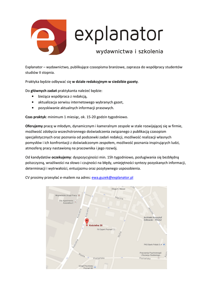 Explanator – wydawnictwo, publikujące czasopisma branżowe, zaprasza do współpracy studentów studiów II stopnia. Praktyka będzie odbywać się w dziale redakcyjnym w siedzibie gazety. Do głównych zadań praktykanta należeć będzie: • bieżąca współpraca z redakcją, • aktualizacja serwisu internetowego wybranych gazet, • pozyskiwanie aktualnych informacji prasowych. Czas praktyk: minimum 1 miesiąc, ok. 15-20 godzin tygodniowo. Oferujemy pracę w młodym, dynamicznym i kameralnym zespole w stale rozwijającej się w firmie, możliwość zdobycia wszechstronnego doświadczenia związanego z publikacją czasopism specjalistycznych oraz poznania od podszewki zadań redakcji, możliwość realizacji własnych pomysłów i ich konfrontacji z doświadczonym zespołem, możliwość poznania inspirujących ludzi, atmosferę pracy nastawioną na pracownika i jego rozwój. Od kandydatów oczekujemy: dyspozycyjności min. 15h tygodniowo, posługiwania się bezbłędną polszczyzną, wrażliwości na słowo i czujności na błędy, umiejętności syntezy pozyskanych informacji, determinacji i wytrwałości, entuzjazmu oraz pozytywnego usposobienia. CV prosimy przesyłać e-mailem na adres: [email protected]