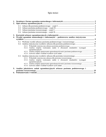 Spis treści 1. Struktura i forma egzaminu maturalnego z informatyki ................................................................ 2 2. Opis arkuszy egzaminacyjnych .......................................................................................................... 3 2.1. Arkusz dla poziomu podstawowego – część I .......................................................................... 4 2.2. Arkusz poziomu podstawowego – część II ............................................................................... 4 2.3. Arkusz poziomu rozszerzonego – część I ................................................................................. 5 2.4. Arkusz poziomu rozszerzonego – część II................................................................................ 5 3. Kartoteki arkuszy egzaminacyjnych z informatyki ......................................................................... 6 4. Wyniki egzaminu maturalnego z informatyki – podstawowa analiza statystyczna wyników ............................................................................................................................................... 9 4.1. Wybrane wyniki arkuszy poziomu podstawowego i rozszerzonego ........................................ 9 4.2. Analiza statystyczna wyników arkusza dla poziomu podstawowego ..................................... 10 4.2.1. Wskaźniki statystyczne arkusza poziomu podstawowego ...................................................... 11 4.2.2. Analiza stopnia wykonania zadań w obszarach standardów wymagań egzaminacyjnych .................................................................................................................... 11 4.2.3. Analiza stopnia opanowania sprawdzanych treści poziomu podstawowego .......................... 12 4.2.4. Łatwość zadań i rozkład wyników tych zadań ....................................................................... 13 4.3. Analiza statystyczna wyników arkusza dla poziomu rozszerzonego ...................................... 15 4.3.1. Wskaźniki statystyczne arkusza dla poziomu rozszerzonego ................................................. 15 4.3.2. Analiza stopnia wykonania zadań w obszarach standardów wymagań egzaminacyjnych .................................................................................................................... 16 4.3.3. Analiza stopnia opanowania sprawdzanych treści poziomu rozszerzonego ........................... 16 4.3.4. Łatwość zadań i rozkład wyników tych zadań ....................................................................... 18 5. Analiza jakościowa zadań egzaminacyjnych arkusza poziomu podstawowego i poziomu rozszerzonego ..................................................................................................................... 19 6. Podsumowanie i wnioski ................................................................................................................... 21 Okręgowa Komisja Egzaminacyjna w Gdańsku Informatyka 1. Struktura i forma egzaminu maturalnego z informatyki Egzamin maturalny z informatyki jest egzaminem zewnętrznym. Ma formę pisemną. Sprawdza wiadomości i umiejętności określone w standardach wymagań egzaminacyjnych i podstawie programowej. Polega na rozwiązaniu zadań zawartych w dwóch częściach arkusza egzaminacyjnego. W 2012 roku absolwenci mogli zdawać informatykę wyłącznie jako przedmiot wybrany dodatkowo, na poziomie podstawowym lub rozszerzonym. Dlatego nie określono progu zaliczenia, a wynik został zapisany na świadectwie dojrzałości w skali procentowej. Egzamin na poziomie podstawowym trwał 195 minut i składał się z dwóch części: • część pierwsza egzaminu (pisemna) trwała 75 minut, polegała na rozwiązaniu 3 zadań egzaminacyjnych bez korzystania z komputera; za rozwiązanie zadań zdający mógł uzyskać maksymalnie 20 punktów, • część druga egzaminu (praktyczna) trwała 120 minut i polegała na rozwiązaniu przy użyciu komputera 3 zadań; za ich rozwiązanie można było uzyskać maksymalnie 30 punktów. Egzamin na poziomie rozszerzonym trwał 240 minut i składał się z dwóch części: • część pierwsza egzaminu (pisemna) trwała 90 minut, polegała na rozwiązaniu 3 zadań egzaminacyjnych bez korzystania z komputera; za rozwiązanie zadań zdający mógł uzyskać maksymalnie 20 punktów, • część druga egzaminu (praktyczna) trwała 150 minut i polegała na rozwiązaniu przy użyciu komputera 3 zadań; za ich rozwiązanie można było uzyskać maksymalnie 30 punktów. W każdej części egzaminu zdający otrzymywał jeden arkusz egzaminacyjny. W czasie trwania drugiej części egzaminu, zdający pracowali przy autonomicznych stanowiskach komputerowych i mogli korzystać z programów, danych zapisanych na dysku twardym i na innych nośnikach stanowiących wyposażenie stanowiska, zawierającego również oprogramowanie, które zdający wybrali z listy ogłoszonej przez dyrektora Centralnej Komisji Egzaminacyjnej. W sali egzaminacyjnej dostępne były pełne wersje oprogramowania z plikami pomocy oraz podstawowa dokumentacja oprogramowania (opisy oprogramowania wraz z licencjami). Zdający mieli prawo sprawdzić w ciągu jednej godziny poprawność działania komputera i wybranego przez siebie oprogramowania. Sprawdzenie to odbywało się dzień wcześniej w obecności administratora lub opiekuna pracowni oraz członka zespołu nadzorującego. Administrator lub opiekun pracowni nie wchodził w skład zespołu nadzorującego, ale był obecny w sali egzaminacyjnej w czasie trwania egzaminu maturalnego z informatyki (części II). W czasie egzaminu • zdający sami interpretowali treść otrzymanych zadań, a członkowie zespołu nadzorującego nie mieli prawa odpowiadać na pytania dotyczące treści zadań ani sugerować ich interpretacji, • w drugiej części egzaminu każdy zdający otrzymał arkusz egzaminacyjny i nośnik DANE zawier