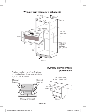 Wymiary przy montażu w zabudowie Min. 550 200 cm² 600 Min. 50 Min. 564–568 555 85 454,2 Min. 446 Maks. 450 445 358 Miejsce na gniazdko zasilające (30 ¢, otwór) 549 595 21 341 200 cm² Wymiary przy montażu pod blatem Produkt należy trzymać za 2 uchwyty boczne i uchwyt drzwiczek w trakcie jego odpakowywania. Uchwyt boczny Min. 550 Uchwyt boczny Min. 446 Maks. 450 Uchwyt drzwiczek Min. 564 Maks. 568 50 200 cm² Polski – 10 NQ50H5533KS_EO_DE68-04306C-01_PL.indd 10 2015-10-23 �� 10:47:24