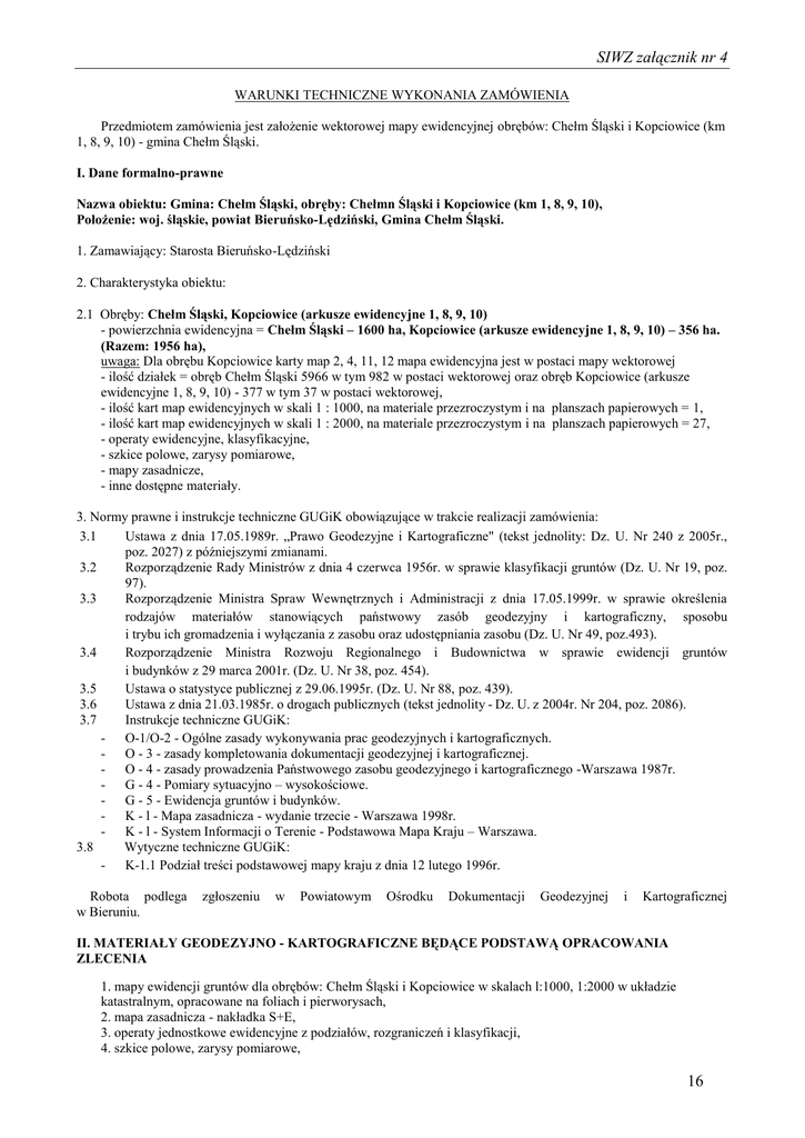 SIWZ załącznik nr 4 WARUNKI TECHNICZNE WYKONANIA ZAMÓWIENIA Przedmiotem zamówienia jest założenie wektorowej mapy ewidencyjnej obrębów: Chełm Śląski i Kopciowice (km 1, 8, 9, 10) - gmina Chełm Śląski. I. Dane formalno-prawne Nazwa obiektu: Gmina: Chełm Śląski, obręby: Chełmn Śląski i Kopciowice (km 1, 8, 9, 10), Położenie: woj. śląskie, powiat Bieruńsko-Lędziński, Gmina Chełm Śląski. 1. Zamawiający: Starosta Bieruńsko-Lędziński 2. Charakterystyka obiektu: 2.1 Obręby: Chełm Śląski, Kopciowice (arkusze ewidencyjne 1, 8, 9, 10) - powierzchnia ewidencyjna = Chełm Śląski – 1600 ha, Kopciowice (arkusze ewidencyjne 1, 8, 9, 10) – 356 ha. (Razem: 1956 ha), uwaga: Dla obrębu Kopciowice karty map 2, 4, 11, 12 mapa ewidencyjna jest w postaci mapy wektorowej - ilość działek = obręb Chełm Śląski 5966 w tym 982 w postaci wektorowej oraz obręb Kopciowice (arkusze ewidencyjne 1, 8, 9, 10) - 377 w tym 37 w postaci wektorowej, - ilość kart map ewidencyjnych w skali 1 : 1000, na materiale przezroczystym i na planszach papierowych = 1, - ilość kart map ewidencyjnych w skali 1 : 2000, na materiale przezroczystym i na planszach papierowych = 27, - operaty ewidencyjne, klasyfikacyjne, - szkice polowe, zarysy pomiarowe, - mapy zasadnicze, - inne dostępne materiały. 3. Normy prawne i instrukcje techniczne GUGiK obowiązujące w trakcie realizacji zamówienia: 3.1 Ustawa z dnia 17.05.1989r. „Prawo Geodezyjne i Kartograficzne" (tekst jednolity: Dz. U. Nr 240 z 2005r., poz. 2027) z późniejszymi zmianami. 3.2 Rozporządzenie Rady Ministrów z dnia 4 czerwca 1956r. w sprawie klasyfikacji gruntów (Dz. U. Nr 19, poz. 97). 3.3 Rozporządzenie Ministra Spraw Wewnętrznych i Administracji z dnia 17.05.1999r. w sprawie określenia rodzajów materiałów stanowiących państwowy zasób geodezyjny i kartograficzny, sposobu i trybu ich gromadzenia i wyłączania z zasobu oraz udostępniania zasobu (Dz. U. Nr 49, poz.493). 3.4 Rozporządzenie Ministra Rozwoju Regionalnego i Budownictwa w sprawie ewidencji gruntów i budynków z 29 marca 2001r. (Dz. U. Nr 38, poz. 454). 3.5 Ustawa o statystyce publicznej z 29.06.1995r. (Dz. U. Nr 88, poz. 439). 3.6 Ustawa z dnia 21.03.1985r. o drogach publicznych (tekst jednolity - Dz. U. z 2004r. Nr 204, poz. 2086). 3.7 Instrukcje techniczne GUGiK: - O-1/O-2 - Ogólne zasady wykonywania prac geodezyjnych i kartograficznych. - O - 3 - zasady kompletowania dokumentacji geodezyjnej i kartograficznej. - O - 4 - zasady prowadzenia Państwowego zasobu geodezyjnego i kartograficznego -Warszawa 1987r. - G - 4 - Pomiary sytuacyjno – wysokościowe. - G - 5 - Ewidencja gruntów i budynków. - K - l - Mapa zasadnicza - wydanie trzecie - Warszawa 1998r. - K - l - System Informacji o Terenie - Podstawowa Mapa Kraju – Warszawa. 3.8 Wytyczne techniczne GUGiK: - K-1.1 Podział treści podstawowej mapy kraju z dnia 12 lutego 1996r. Robota podlega w Bieruniu. zgłoszeniu w Powiatowym Ośrodku Dokumentacji Geodezyjnej i Kartograficznej II. MATERIAŁY GEODEZYJNO - KARTOGRAFICZNE BĘDĄCE PODSTAWĄ OPRACOWANIA ZLECENIA 1. mapy ewidencji gruntów dla obrębów: Chełm Śląski i Kopciowice w skalach l:1000, 1:2000 w układzie katastralnym, opracowane na foliach i pierworysach, 2. mapa zasadnicza - nakładka S+E, 3. operaty jednostkowe ewidencyjne z podziałów, rozgraniczeń i klasyfikacji, 4. szkice polowe, zarysy pomiarowe, 16 SIWZ załącznik nr 4 5. wykazy współrzędnych punktów granicznych, 6. część opisowa ewidencji gruntów opracowana w systemie Geo-Info Integra, aktualizowana na bieżąco, 7. część kartograficzna - numeryczna - prowadzona w systemie GEO-INFO V, 8. dowody zmian gruntowych, UWAGA ! – Zamawiający nie przewiduje możliwości wydania oryginałów materiałów poza siedzibę Zamawiającego. Zamawiający wyraża zgodę na dokonanie kserokopii, skanowania w/w materiałów na sprzęcie i we własnym zakresie Wykonawcy w siedzibie Zamawiającego za wyjątkiem pierworysów mapy ewidencyjnej i map klasyfikacyjnych. III. OBOWIĄZUJĄCY ZAKRES PRAC GEODEZYJNYCH Sporządzenie obiektowej numerycznej mapy ewidencyjnej w systemie GEO-INFO V z zachowaniem dotychczasowego podziału na gminy, obręby, karty mapy i dotychczasowej numeracji działek dla obrębów: Chełm Śląski (całość) i Kopciowice (arkusze ewidencyjne 1, 8, 9, 10) w gminie Chełm Śląski. Zmodyfikowanie obiektów z obrębów sąsiednich tak aby po imporcie uzyskać pełną spójność i poprawność topologiczną. IV. WYMAGANIA PROGRAMOWE Część graficzną dotyczącą działek i klasoużytków należy opracować w systemie GEO-INFO V. Zamawiający udostępni Wykonawcy: - mapy klasyfikacyjne do zeskanowania oraz rastry map klasyfikacyjnych (nie skalibrowane) stan na styczeńmarzec 2009r. - skalibrowane rastry mapy zasadniczej w systemie EWMAPA (format evr), - rastry map ewidencyjnych (nie skalibrowane) stan na styczeń-marzec 2009r. 1. 2. 3. Parametry skanowania i kalibracji: Rozdzielczość 400 dpi. Kalibracja z dokładnością 0.25 mm w skali mapy, Wymagane sporządzenie metryki kalibracji dla każdej kalibrowanej mapy Uzgodnienia dodatkowe - Zamawiający otrzyma od Wykonawcy, dane numeryczne umożliwiające utworzenie bazy działek i klasoużytków w systemie GEO-INFO V. Należy wykonać redakcję mapy w zakresie: działki, klasoużytki, punkty graniczne, nazwy ulic dla skali 1:500 i 1:1000 oraz w zakresie: działki, klasoużytki, nazwy ulic dla skali 1:2000 i 1:5000. UWAGA: Redakcja ma uwzględniać położenie budynków uwidocznionych w mapie numerycznej i na rastrach mapy zasadniczej. V. WYMAGANIA DOTYCZĄCE TOPOLOGII 1. 2. 3. 4. Baza działek i klasoużytków stanowi jednolity spójny obszar bez błędów topologicznych. Pod każdym narożnikiem działki znajduje się punkt graniczny. Na granicach obrębów, arkuszy ewidencyjnych i działek punkty graniczne muszą być wspólne. Wykonawca otrzyma od Zamawiającego również działki położone na gran