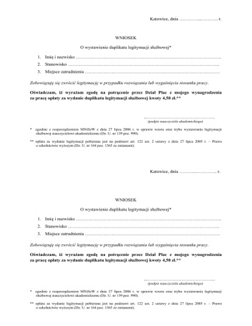 Katowice, dnia …………...……….. r. WNIOSEK O wystawienie duplikatu legitymacji służbowej* 1. Imię i nazwisko …………………………………………………………………………………. 2. Stanowisko …………………………………………………………………………………….. 3. Miejsce zatrudnienia …………………………………………………………………………… Zobowiązuję się zwrócić legitymację w przypadku rozwiązania lub wygaśnięcia stosunku pracy. Oświadczam, iż wyrażam zgodę na potrącenie przez Dział Płac z mojego wynagrodzenia za pracę opłaty za wydanie duplikatu legitymacji służbowej kwoty 4,50 zł.** ...…………………………………….. (podpis nauczyciela akademickiego) * zgodnie z rozporządzeniem MNiSzW z dnia 27 lipca 2006 r. w sprawie wzoru oraz trybu wystawiania legitymacji służbowej nauczycielowi akademickiemu (Dz. U. nr 139 poz. 990). ** opłata za wydanie legitymacji pobierana jest na podstawi art. 122 ust. 2 ustawy z dnia 27 lipca 2005 r. – Prawo o szkolnictwie wyższym (Dz. U. nr 164 poz. 1365 ze zmianami). Katowice, dnia ………..………….. r. WNIOSEK O wystawienie duplikatu legitymacji służbowej* 1. Imię i nazwisko …………………………………………………………………………………. 2. Stanowisko …………………………………………………………………………………….. 3. Miejsce zatrudnienia …………………………………………………………………………… Zobowiązuję się zwrócić legitymację w przypadku rozwiązania lub wygaśnięcia stosunku pracy. Oświadczam, iż wyrażam zgodę na potrącenie przez Dział Płac z mojego wynagrodzenia za pracę opłaty za wydanie duplikatu legitymacji służbowej kwoty 4,50 zł.** ...…………………………………….. (podpis nauczyciela akademickiego) * zgodnie z rozporządzeniem MNiSzW z dnia 27 lipca 2006 r. w sprawie wzoru oraz trybu wystawiania legitymacji służbowej nauczycielowi akademickiemu (Dz. U. nr 139 poz. 990). ** opłata za wydanie legitymacji pobierana jest na podstawi art. 122 ust. 2 ustawy z dnia 27 lipca 2005 r. – Prawo o szkolnictwie wyższym (Dz. U. nr 164 poz. 1365 ze zmianami).