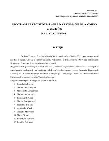 Załącznik Nr 1 do Uchwały Nr XVII/106/2007 Rady Miejskiej w Wyszkowie z dnia 29 listopada 2007r PROGRAM PRZECIWDZIAŁANIA NARKOMANII DLA GMINY WYSZKÓW NA LATA 2008/2011 WSTĘP Gminny Program Przeciwdziałania Narkomanii na lata 2008 – 2011 opracowany został zgodnie z treścią Ustawy o Przeciwdziałaniu Narkomanii z dnia 29 lipca 2005r oraz załoŜeniami Krajowego Programu Przeciwdziałania Narkomanii. Program został opracowany w ramach projektu „Wsparcie województw i społeczności lokalnych w zapobieganiu narkomanii na poziomie lokalnym”, realizowanego przez Fundację Demokracji Lokalnej na zlecenie Fundacji Fundusz Współpracy i Krajowego Biura ds. Przeciwdziałania Narkomanii w ramach projektu Tansition Facility. Program został opracowany przez zespół w składzie: 1. Urszula Zadworna 2. Małgorzata Kocięcka 3. Małgorzata Kwiecińska 4. Małgorzata Sarnacka 5. Hanna Jankowska 6. Marcin Bardyszewski 7. Stanisław Banach 8. Agnieszka Wasik 9. GraŜyna Majewska 10. Maria Pielech 11. Katarzyna Kowalik 12. Kamilla Puławska Gminny Program Przeciwdziałania Narkomanii opracowany został w oparciu o diagnozę sytuacji w gminie Wyszków przeprowadzonej w okresie 17.04.2007r – 30.06.2007r przez zespół: 1. Urszula Zadworna 2. Małgorzata Kocięcka 3. Hanna Jankowska 4. Małgorzata Sarnacka 5. Małgorzata Kwiecińska 6. Katarzyna Kowalik 7. Maria Pielech 8. Anna Stankiewicz 9. Kamilla Puławska OPIS ZJAWISKA NA PODSTAWIE DIAGNOZY Przeprowadzone badanie miało na celu pomiar natęŜenia zjawiska uŜywania przez młodzieŜ substancji psychoaktywnych. Podstawowymi pytaniami badawczymi były zatem pytania o liczbę młodych ludzi, którzy mieli doświadczenia z tego typu substancjami oraz o stopień nasilenia tych doświadczeń. Celem badania była równieŜ próba identyfikacji i pomiaru czynników wpływających na rozmiary zjawiska, zarówno po stronie popytu jak i podaŜy. W badaniu poruszono zatem takie kwestie jak dostępność substancji psychoaktywnych, zarówno w wymiarze fizycznym i psychologicznym, gotowość do podjęcia prób z tymi środkami, przekonania na temat ich szkodliwości, doświadczenia w zakresie problemów związanych z ich uŜywaniem. Wszystkie te kwestie zostały poddane pomiarowi ilościowemu w celu dokonania oszacowań dla całej populacji uczniów szkół podstawowych i gimnazjalnych Gminy Wyszków. Badanie objęło dwie kohorty młodzieŜy - młodzieŜ urodzoną w latach 1991 i 1994. Badana młodzieŜ uczęszcza do szóstych klas szkół podstawowych i trzecich klas gimnazjum. W związku z tym próba badawcza została pobrana spośród młodzieŜy szkolnej z tych typów szkół i poziomów klas. W badaniu wzięło udział 787 uczniów, w tym: 12 VI klas podstawowych – 288 osoby oraz 24 III klasy gimnazjum – 499 osób. W badaniu wzięły udział wszystkie III klasy gimnazjalne oraz 12 z 17 VI klas podstawowych ( w pięciu klasach Dyrektor Szkoły, Rada Rodziców i Pedagog Szkolny nie wyrazili zgody na przeprowadzenie ankiety ESPAD). Badanie zostało realizowane metodą ankiety audytoryjnej przez zespół pedagogów szkolnych. Ankieterzy zostali przeszkoleni oraz wyposaŜeni w szczegółową, pisemną instrukcję. Do ich zadań, poza przeprowadzeniem badania w klasie, naleŜało przygotowanie raportu zawierającego, obok opisu realizacji badania, informacje o klasie oraz o uczniach nieobecnych w trakcie badania. Nawiązanie kontaktu z przydzielonymi szkołami naleŜało do obowiązków ankietera. W procedurze badania połoŜono bardzo duŜy nacisk na zapewnienie respondentom maksimum poczucia bezpieczeństwa oraz pełnej anonimowości. SłuŜyły temu: − wymóg nieobecności nauczyciela w klasie w trakcie badania; − reguły postępowania ankietera (np. nie mógł on chodzić po klasie i zaglądać uczniom w kwestionariusze); − specjalna procedura zwrotu wypełnionego kwestionariusza polegająca na umieszczeniu go przez ucznia w kopercie a następnie zaklejeniu jej. Uczniowie w instrukcji otrzymali zapewnienie o pełnej anonimowości badań, zarówno na poziomie pojedynczych uczniów, jak równieŜ całej szkoły. Oznacza to, Ŝe tajemnicą objęte są równieŜ wyniki na poziomie szkół. Ankieterzy po sprawdzeniu kompletności materiałów przekazywali je do Urzędu Miejskiego w Wyszkowie. Następnie ankiety zostały poddane procedurze sprawdzania. Potem złoŜono i zweryfikowano zbiór danych. Wiosną 2007r zrealizowano audytoryjne badania ankietowe na próbie uczniów szóstych klas szkoły podstawowej i trzecich klas gimnazjum w Gminie Wyszków. Tytoń paliło chociaŜ raz w Ŝyciu 32,64 % uczniów szóstych klas szkoły podstawowej oraz 61,2 % gimnazjalistów. W czasie ostatnich 30 dni przed badaniem paliło 7,3 % badanych z młodszej grupy i 25,5 % uczniów starszych. Napoje alkoholowe w czasie ostatnich 12 miesięcy przed badaniem piło 46,19 % szóstoklasistów oraz 76,8 % gimnazjalistów. Picie napojów alkoholowych jest na tyle powszechne, Ŝe w czasie ostatnich 30 dni przed badaniem piło 23,27 % uczniów młodszych i 49,7 % uczniów starszych. Wysoki odsetek badanych przyznaje się do przekraczania progu nietrzeźwości. W czasie ostatnich 30 dni przed badaniem chociaŜ raz upiło się 7,3 % uczniów klas młodszych oraz 28,6 % uczniów klas gimnazjalnych. W czasie cełego Ŝycia nie upiło się 74,65 % badanych z młodszej kohorty oraz 41,4 % badanych ze starszej kohorty. Wyniki badania pokazują na znacznie wyŜszy poziom rozpowszechnienia uŜywania substancji legalnych, niŜ nielegalnych. Zwraca uwagę wysoki odsetek uczniów, którzy kiedykolwiek w Ŝyciu uŜywali substancji wziewnych (16,32 % młodsza grupa, 11,9 % starsza grupa) oraz leków uspokajających i nasennych bez przepisu lekarza (6,94 % młodsza grupa, 11,2 % starsza grupa). Wśród substancji nielegalnych wysokim rozpowszechnieniem cechują się konopie indyjskie. ChociaŜ raz w Ŝyciu uŜywało ich 4,52 % uczniów klas młodszych oraz 20,05 % uczniów klas g