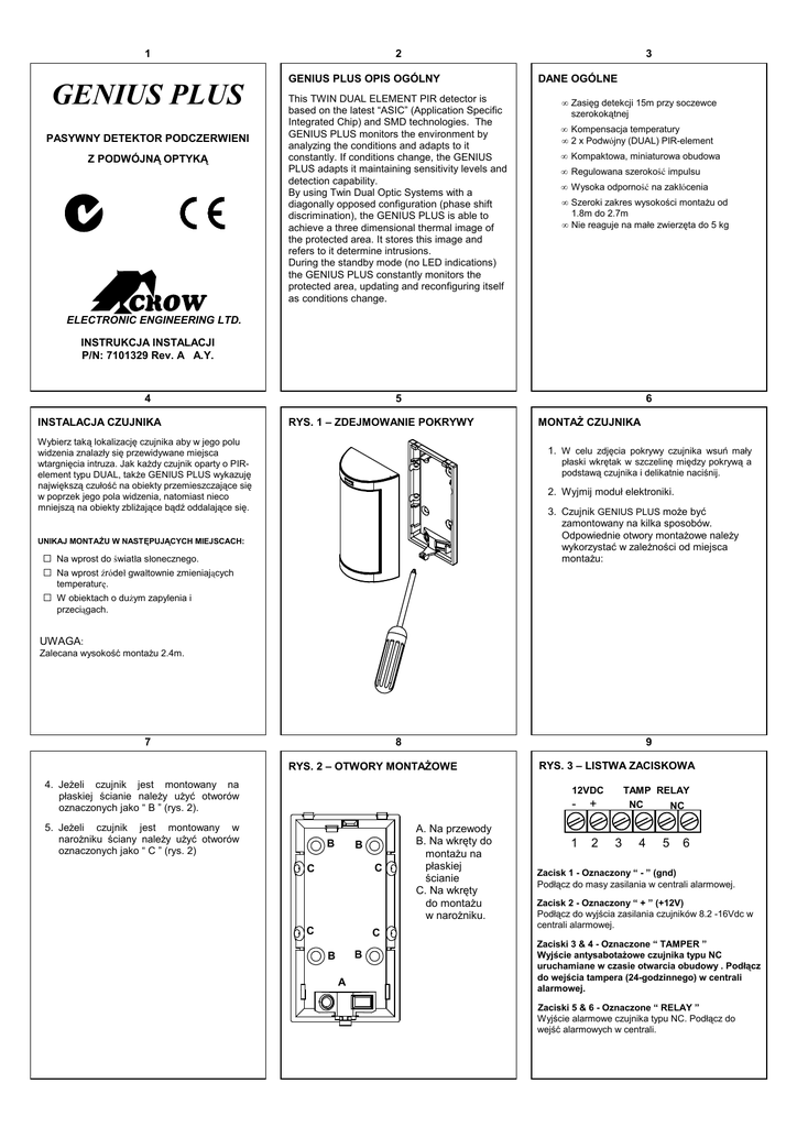 1 GENIUS PLUS PASYWNY DETEKTOR PODCZERWIENI Z PODWÓJNĄ OPTYKĄ 2 3 GENIUS PLUS OPIS OGÓLNY This TWIN DUAL ELEMENT PIR detector is based on the latest “ASIC” (Application Specific Integrated Chip) and SMD technologies. The GENIUS PLUS monitors the environment by analyzing the conditions and adapts to it constantly. If conditions change, the GENIUS PLUS adapts it maintaining sensitivity levels and detection capability. By using Twin Dual Optic Systems with a diagonally opposed configuration (phase shift discrimination), the GENIUS PLUS is able to achieve a three dimensional thermal image of the protected area. It stores this image and refers to it determine intrusions. During the standby mode (no LED indications) the GENIUS PLUS constantly monitors the protected area, updating and reconfiguring itself as conditions change. DANE OGÓLNE • Zasięg detekcji 15m przy soczewce szerokokątnej • Kompensacja temperatury • 2 x Podwójny (DUAL) PIR-element • Kompaktowa, miniaturowa obudowa • Regulowana szerokość impulsu • Wysoka odporność na zakłócenia • Szeroki zakres wysokości montaŜu od 1.8m do 2.7m • Nie reaguje na małe zwierzęta do 5 kg ELECTRONIC ENGINEERING LTD. INSTRUKCJA INSTALACJI P/N: 7101329 Rev. A A.Y. 4 INSTALACJA CZUJNIKA 5 6 RYS. 1 – ZDEJMOWANIE POKRYWY Wybierz taką lokalizację czujnika aby w jego polu widzenia znalazły się przewidywane miejsca wtargnięcia intruza. Jak kaŜdy czujnik oparty o PIRelement typu DUAL, takŜe GENIUS PLUS wykazuję największą czułość na obiekty przemieszczające się w poprzek jego pola widzenia, natomiast nieco mniejszą na obiekty zbliŜające bądź oddalające się. MONTAś CZUJNIKA 1. W celu zdjęcia pokrywy czujnika wsuń mały płaski wkrętak w szczelinę między pokrywą a podstawą czujnika i delikatnie naciśnij. 2. Wyjmij moduł elektroniki. 3. Czujnik GENIUS PLUS moŜe być zamontowany na kilka sposobów. Odpowiednie otwory montaŜowe naleŜy wykorzystać w zaleŜności od miejsca montaŜu: UNIKAJ MONTAśU W NASTĘPUJĄCYCH MIEJSCACH: Na wprost do światła słonecznego. Na wprost źródeł gwałtownie zmieniających temperaturę. W obiektach o duŜym zapylenia i przeciągach. UWAGA: Zalecana wysokość montaŜu 2.4m. 7 8 9 RYS. 2 – OTWORY MONTAśOWE 4. JeŜeli czujnik jest montowany na płaskiej ścianie naleŜy uŜyć otworów oznaczonych jako “ B ” (rys. 2). RYS. 3 – LISTWA ZACISKOWA 12VDC 5. JeŜeli czujnik jest montowany w naroŜniku ściany naleŜy uŜyć otworów oznaczonych jako “ C ” (rys. 2) B B C C C C B B A A. Na przewody B. Na wkręty do montaŜu na płaskiej ścianie C. Na wkręty do montaŜu w naroŜniku. - + 1 2 TAMP RELAY NC NC 3 4 5 6 Zacisk 1 - Oznaczony “ - ” (gnd) Podłącz do masy zasilania w centrali alarmowej. Zacisk 2 - Oznaczony “ + ” (+12V) Podłącz do wyjścia zasilania czujników 8.2 -16Vdc w centrali alarmowej. Zaciski 3 & 4 - Oznaczone “ TAMPER ” Wyjście antysabotaŜowe czujnika typu NC uruchamiane w czasie otwarcia obudowy . Podłącz do wejścia tampera (24-godzinnego) w centrali alarmowej. Zaciski 5 & 6 - Oznaczone “ RELAY ” Wyjście alarmowe czujnika typu NC. Podłącz do wejść alarmowych w centrali. 10 11 RYS. 4 - PŁYTKA ELEKTRONIKI Dioda LED USTAWIENIA CZUJNIKA WYMAGANIA DOTYCZĄCE PRZEWODÓW Jumper Pulse – Pozwala na dopasowanie sposobu pracy czujnika do charakterystyki obiektu: W celu otrzymania optymalnych rezultatów uŜywaj przewodu o przekroju φ 0.5 mm lub większym. Pamiętaj, Ŝe maksymalna długość przewodów połączeniowych czujnika z panelem centrali oprócz samego przekroju uŜytego przewodu uzaleŜniona jest takŜe od ilości czujników dołączonych równolegle do wiązki zasilającej UŜyj poniŜszej tabeli w celu optymalnego doboru potrzebnych przewodów dla jednego czujnika. Ustawienie zalecane do pomieszczeń o stabilnej charakterystyce termodynamicznej. LED JUMPER W tym ustawieniu GENIUS PLUS automatycznie wybiera sposób reakcji na analizowane sygnały rozpoznając ich charakter na podstawie analizy mikroprocesorowej sygnału z PIR-elementu. Ustawienie zalecane do pomieszczeń o trudnych warunkach środowiskowych (zmiany temperatury, przeciągi itd.) oraz ze zwierzętami o wymiarach do 25cm (wys.) i wadze poniŜej 5kg PULSE JAMPER PIRELEMENT 12 TAMPER Długość Przekrój m 200 mm .5 300 .75 400 1.0 800 1.5 Jumper LED – pozwala na włączenie/wyłączenie działania diody LED w czasie alarmu. Dioda LED włączona – świeci w czasie alarmu. Dioda LED wyłączona. LISTWA ZACISKOWA 13 14 FIG. 5 – SOCZEWKA SZEROKOKĄTNA 15 CHARAKTERYSTYKA SOCZEWKI (WA) DETEKCJA 0m 0ft 15m 49.2ft 2.4m 7.9ft 5m 10m 16.4ft 32.8ft 15m 49.2ft 16 Walk test IMPORTANT: In an environment with a small animal: 1. The GENIUS PLUS has to be mounted at 2.4m (7ft.) or higher (max 3.0m or 10ft.) above floor level. 2. Install the GENIUS PLUS vertically (not titled forward). 3. Away from furniture 2.4m (7.9ft.) or more, on which a small animal may jump. 4. Not facing a staircase, ladder or similar object which can be part of the monitored environment (the vertical motion of the animal may be interpreted by the detector as an actual intruder). 5. Flip jumper switch “PULSE to the “AUTO” (down) position for a harsh environment. 17 8.2 - 16VDC Current consumption Standby Active 13mA at 12VDC 8.5mA at 12VDC Detection speed 0.15 to 1.8m/sec (0.5 to 6 ft./sec) Sensitivity ∆1.1°C at 0.9m/sec (∆2°F at 3ft./sec) Alarm output N.C 50mA at 24VDC 27ohm in line resistor Tamper switch N.C 50mA at 24VDC 10ohm in line resistor Operating temperature -20°C to 50°C (-4°F to 122°F) Operating humidity Up to 95% (non-condensing) Storage temperature -40°C to 80°C (-40°F to 176°F) Detection method 2 matching dual element with double optic system RFI protection EMI immunity >30V/m at 10 to 1000MHz 50,000Volt electrical interference due to power surges or lighting LED is blinking 8 time during warm up period and self testing 12 Sec. LED is ON du
