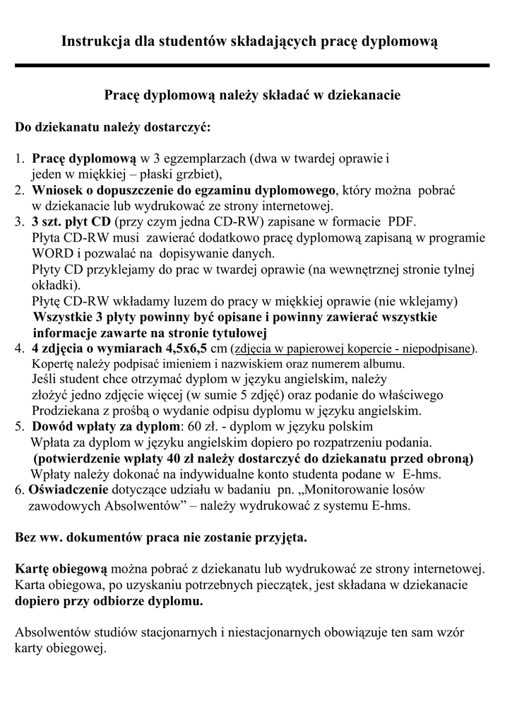 Instrukcja dla studentów składających pracę dyplomową Pracę dyplomową należy składać w dziekanacie Do dziekanatu należy dostarczyć: 1. Pracę dyplomową w 3 egzemplarzach (dwa w twardej oprawie i jeden w miękkiej – płaski grzbiet), 2. Wniosek o dopuszczenie do egzaminu dyplomowego, który można pobrać w dziekanacie lub wydrukować ze strony internetowej. 3. 3 szt. płyt CD (przy czym jedna CD-RW) zapisane w formacie PDF. Płyta CD-RW musi zawierać dodatkowo pracę dyplomową zapisaną w programie WORD i pozwalać na dopisywanie danych. Płyty CD przyklejamy do prac w twardej oprawie (na wewnętrznej stronie tylnej okładki). Płytę CD-RW wkładamy luzem do pracy w miękkiej oprawie (nie wklejamy) Wszystkie 3 płyty powinny być opisane i powinny zawierać wszystkie informacje zawarte na stronie tytułowej 4. 4 zdjęcia o wymiarach 4,5x6,5 cm (zdjęcia w papierowej kopercie - niepodpisane). Kopertę należy podpisać imieniem i nazwiskiem oraz numerem albumu. Jeśli student chce otrzymać dyplom w języku angielskim, należy złożyć jedno zdjęcie więcej (w sumie 5 zdjęć) oraz podanie do właściwego Prodziekana z prośbą o wydanie odpisu dyplomu w języku angielskim. 5. Dowód wpłaty za dyplom: 60 zł. - dyplom w języku polskim Wpłata za dyplom w języku angielskim dopiero po rozpatrzeniu podania. (potwierdzenie wpłaty 40 zł należy dostarczyć do dziekanatu przed obroną) Wpłaty należy dokonać na indywidualne konto studenta podane w E-hms. 6. Oświadczenie dotyczące udziału w badaniu pn. „Monitorowanie losów zawodowych Absolwentów” – należy wydrukować z systemu E-hms. Bez ww. dokumentów praca nie zostanie przyjęta. Kartę obiegową można pobrać z dziekanatu lub wydrukować ze strony internetowej. Karta obiegowa, po uzyskaniu potrzebnych pieczątek, jest składana w dziekanacie dopiero przy odbiorze dyplomu. Absolwentów studiów stacjonarnych i niestacjonarnych obowiązuje ten sam wzór karty obiegowej.