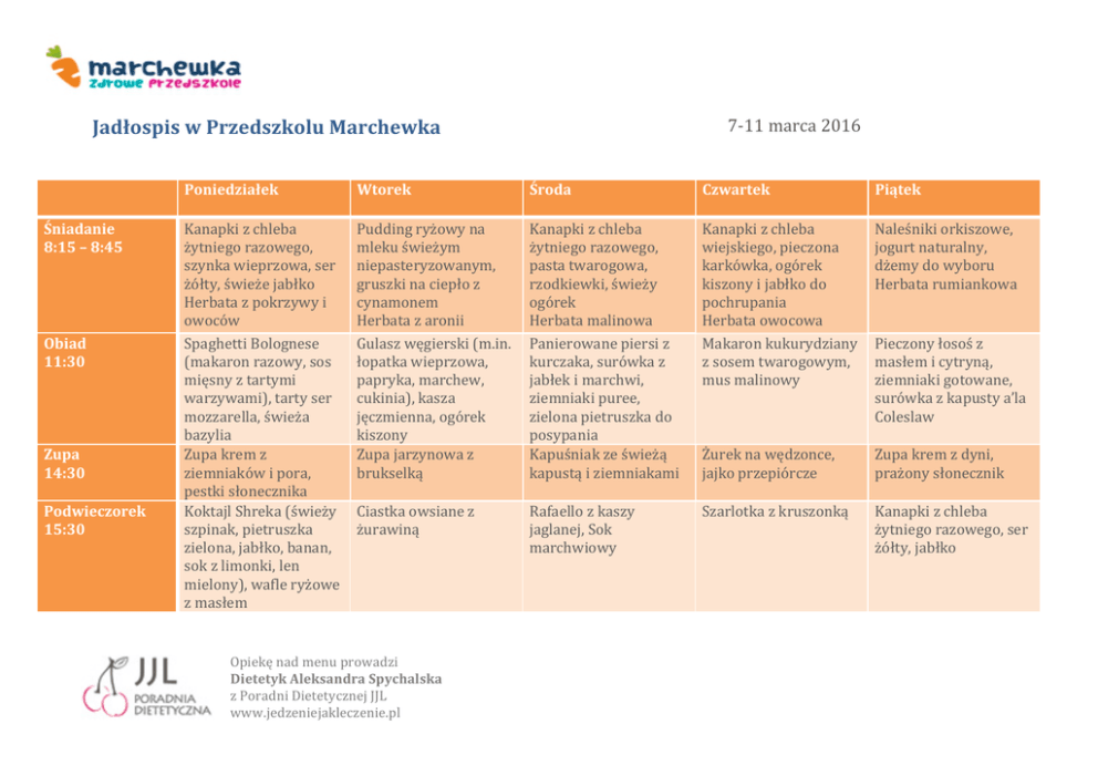 7-11marca2016 JadłospiswPrzedszkoluMarchewka Poniedziałek Wtorek Środa Czwartek Piątek Śniadanie 8:15–8:45 Kanapkizchleba żytniegorazowego, szynkawieprzowa,ser żółty,świeżejabłko Herbatazpokrzywyi owoców SpaghettiBolognese (makaronrazowy,sos mięsnyztartymi warzywami),tartyser mozzarella,świeża bazylia Zupakremz ziemniakówipora, pestkisłonecznika KoktajlShreka(świeży szpinak,pietruszka zielona,jabłko,banan, sokzlimonki,len mielony),wafleryżowe zmasłem Puddingryżowyna mlekuświeżym niepasteryzowanym, gruszkinaciepłoz cynamonem Herbatazaronii Gulaszwęgierski(m.in. łopatkawieprzowa, papryka,marchew, cukinia),kasza jęczmienna,ogórek kiszony Zupajarzynowaz brukselką Kanapkizchleba żytniegorazowego, pastatwarogowa, rzodkiewki,świeży ogórek Herbatamalinowa Panierowanepiersiz kurczaka,surówkaz jabłekimarchwi, ziemniakipuree, zielonapietruszkado posypania Kapuśniakześwieżą kapustąiziemniakami Kanapkizchleba wiejskiego,pieczona karkówka,ogórek kiszonyijabłkodo pochrupania Herbataowocowa Makaronkukurydziany zsosemtwarogowym, musmalinowy Naleśnikiorkiszowe, jogurtnaturalny, dżemydowyboru Herbatarumiankowa Żureknawędzonce, jajkoprzepiórcze Zupakremzdyni, prażonysłonecznik Ciastkaowsianez żurawiną Rafaellozkaszy jaglanej,Sok marchwiowy Szarlotkazkruszonką Kanapkizchleba żytniegorazowego,ser żółty,jabłko Obiad 11:30 Zupa 14:30 Podwieczorek 15:30 Opiekęnadmenuprowadzi DietetykAleksandraSpychalska zPoradniDietetycznejJJL www.jedzeniejakleczenie.pl Pieczonyłosośz masłemicytryną, ziemniakigotowane, surówkazkapustya’la Coleslaw