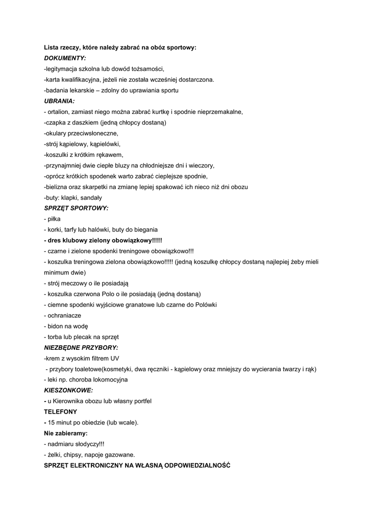 Lista rzeczy, które należy zabrać na obóz sportowy: DOKUMENTY: -legitymacja szkolna lub dowód tożsamości, -karta kwalifikacyjna, jeżeli nie została wcześniej dostarczona. -badania lekarskie – zdolny do uprawiania sportu UBRANIA: - ortalion, zamiast niego można zabrać kurtkę i spodnie nieprzemakalne, -czapka z daszkiem (jedną chłopcy dostaną) -okulary przeciwsłoneczne, -strój kąpielowy, kąpielówki, -koszulki z krótkim rękawem, -przynajmniej dwie ciepłe bluzy na chłodniejsze dni i wieczory, -oprócz krótkich spodenek warto zabrać cieplejsze spodnie, -bielizna oraz skarpetki na zmianę lepiej spakować ich nieco niż dni obozu -buty: klapki, sandały SPRZĘT SPORTOWY: - piłka - korki, tarfy lub halówki, buty do biegania - dres klubowy zielony obowiązkowy!!!!! - czarne i zielone spodenki treningowe obowiązkowo!!! - koszulka treningowa zielona obowiązkowo!!!!! (jedną koszulkę chłopcy dostaną najlepiej żeby mieli minimum dwie) - strój meczowy o ile posiadają - koszulka czerwona Polo o ile posiadają (jedną dostaną) - ciemne spodenki wyjściowe granatowe lub czarne do Polówki - ochraniacze - bidon na wodę - torba lub plecak na sprzęt NIEZBĘDNE PRZYBORY: -krem z wysokim filtrem UV - przybory toaletowe(kosmetyki, dwa ręczniki - kąpielowy oraz mniejszy do wycierania twarzy i rąk) - leki np. choroba lokomocyjna KIESZONKOWE: - u Kierownika obozu lub własny portfel TELEFONY - 15 minut po obiedzie (lub wcale). Nie zabieramy: - nadmiaru słodyczy!!! - żelki, chipsy, napoje gazowane. SPRZĘT ELEKTRONICZNY NA WŁASNĄ ODPOWIEDZIALNOŚĆ
