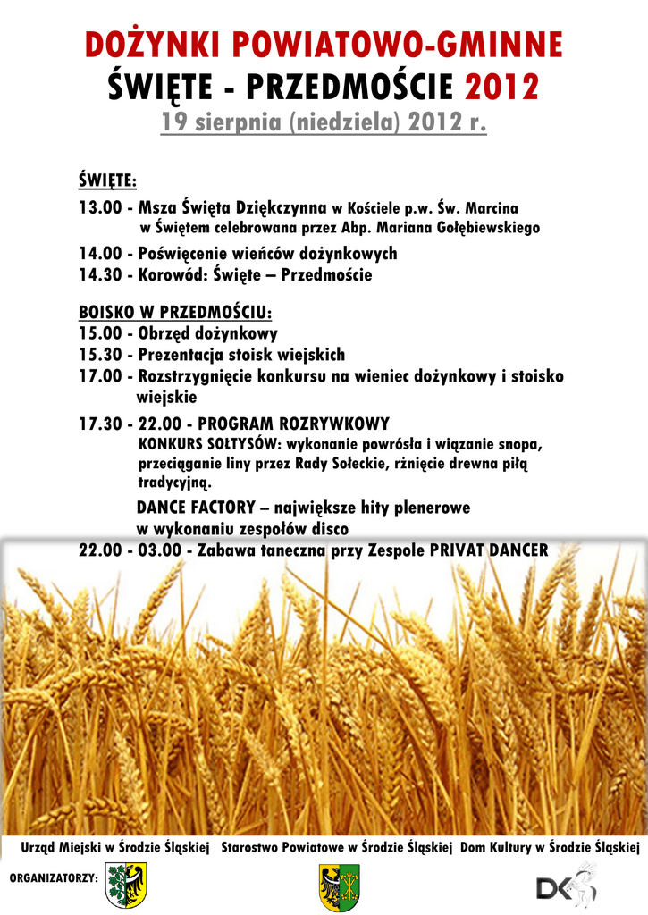 DOŻYNKI POWIATOWO-GMINNE ŚWIĘTE - PRZEDMOŚCIE 2012 19 sierpnia (niedziela) 2012 r. ŚWIĘTE: 13.00 - Msza Święta Dziękczynna w Kościele p.w. Św. Marcina w Świętem celebrowana przez Abp. Mariana Gołębiewskiego 14.00 - Poświęcenie wieńców dożynkowych 14.30 - Korowód: Święte – Przedmoście BOISKO W PRZEDMOŚCIU: 15.00 - Obrzęd dożynkowy 15.30 - Prezentacja stoisk wiejskich 17.00 - Rozstrzygnięcie konkursu na wieniec dożynkowy i stoisko wiejskie 17.30 - 22.00 - PROGRAM ROZRYWKOWY KONKURS SOŁTYSÓW: wykonanie powrósła i wiązanie snopa, przeciąganie liny przez Rady Sołeckie, rżnięcie drewna piłą tradycyjną. DANCE FACTORY – największe hity plenerowe w wykonaniu zespołów disco 22.00 - 03.00 - Zabawa taneczna przy Zespole PRIVAT DANCER Urząd Miejski w Środzie Śląskiej Starostwo Powiatowe w Środzie Śląskiej Dom Kultury w Środzie Śląskiej ORGANIZATORZY: