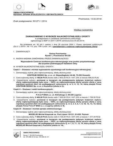 GMINA PROCHOWICE REFERAT SPRAW SPOŁECZNYCH I OBYWATELSKICH Prochowice, 13.02.2014r. 13 Znak postępowania: SO.271.1 1.2014 Według rozdzielnika ZAWIADOMIENIE O WYBORZE NAJKORZYSTNIEJSZEJ OFERTY w postępowaniu postę o udzielenie zamówienia publicznego ogłoszonego w BZP nr 22411-2014 zamieszczone 04.02.2014r. Na podstawie art. 92 pkt.1 ustawy z dnia 29 stycznia 2004 r. Prawo zamówień zamówie publicznych (Dz.U. z 2010 r. Nr 113, poz. 759 z późn. pó zm.) zawiadamiam o wyborze borze najkorzystniejszej oferty: oferty I. ZAMAWIAJĄCY: Gmina Prochowice Rynek 1, Prochowice 59-230 II. NAZWA NADANA ZAMÓWIENIU PRZEZ ZAMAWIAJĄCEGO: ZAMAWIAJ Wyposażenie enie Centrum konferencyjno konferencyjno-rekreacyjnego rekreacyjnego oraz punktu przystankowego dla turystów turys podróżujących Szlakiem Odry III. WYBÓR NAJKORZYSTNIEJSZEJ ORZYSTNIEJSZEJ OFERTY: Część I – Dostawa i montażż wyposażenia wyposa sportowego sali konferencyjno-rekreacyjnej: rekreacyjnej: 1. Zamawiający wybrał, jako najkorzystniejszą, najkorzystniejsz ofertę złożoną przez: CENTRUM SEDNO Sp. z o.o. ul. Niepodległości Niepodległo 44-48, 75-252 252 Koszalin 2. Cena wybranej oferty: 3 198,00 PLN (kwota netto 2 600,00 ,00 PLN i VAT 23% w kwocie 598,00 PLN) 3. Uzasadnienie wyboru: ponieważ poniewa w toczącym się postępowaniu powaniu jedynym kryterium wyboru oferty najkorzystniejszej była cena – 100%, za najkorzystniejszą ą ofertą ą uznano ofert ofertę z ceną najniższą spośród ród ofert nie podlegaj podlegających odrzuceniu tj. nr 2, 4, 13, 14, 14 którą złożyła Firma CENTRUM SEDNO Sp. z o.o. z Koszalina (oferta nr 2). Część II – Dostawa i mebli konferencyjnych: 1. Zamawiający wybrał, jako najkorzystniejszą, najkorzystniejsz ofertę złożoną przez: P.H.U.P BISA s.c. ul. Kilińskiego Kili 2, 59-220 Legnica 2. Cena wybranej oferty: 9 409,50 PLN (kwota netto 7 650,00 ,00 PLN i VAT 23% w kwocie 1 759,50 PLN) 3. Uzasadnienie wyboru: ponieważ poniewa w toczącym się postępowaniu powaniu jedynym kryterium wyboru oferty najkorzystniejszej była cena – 100%, za najkorzystniejszą ą ofertą ą uznano ofert ofertę z ceną najniższą spośród ofert ert nie podlegających podlegaj odrzuceniu tj. nr 2, 3, 5, 6, 7, 9, 10, 12, 13, 14, którą złożyła Firma P.H.U.P BISA s.c. z Legnicy (oferta nr 9). Część III – Dostawa i montażż sprzętu sprz elektronicznego: 1. Zamawiający wybrał, jako najkorzystniejszą, najkorzystniejsz ofertę złożoną przez: MODELIKI Michał Kasprzak os. Pod Lipami 15/121, 61-638 61 638 Poznań Pozna 2. Cena wybranej oferty: 7 045,44 PLN (kwota netto 5 728,00 ,00 PLN i VAT 23% w kwocie 1 317,44 PLN) 3. Uzasadnienie wyboru: ponieważ poniewa w toczącym się postępowaniu powaniu jedynym kryterium wyboru oferty najkorzystniejszej była cena – 100%, za najkorzystniejszą ą ofertą ą uznano ofert ofertę z ceną najniższą spośród ród ofert nie podlegających podlegaj odrzuceniu tj. nr 1, 8, 11, 13, 14, którą złożyła Firma MODELIKI ELIKI Michał Kasprzak z Poznania (oferta nr 14). GMINA PROCHOWICE Rynek 1, 59-230 Prochowice tel. 076 858 43 42 fax. 076 858 45 81 www.prochowice.com [email protected] www.bip.prochowice.com ZAWIADOMIENIE O WYBORZE NAJKORZYSTNIEJSZEJ OFERTY Znak postępowania: SO.271.1.2014 Część IV – Dostawa ulicznego wyposażenia punktu przystankowego: 1. Zamawiający wybrał, jako najkorzystniejszą, ofertę złożoną przez: PHPU ZUBER Andrzej Zuber ul. Krakowska 29c, 50-424 Wrocław 2. Cena wybranej oferty: 981,54 PLN (kwota netto 798,00 PLN i VAT 23% w kwocie 183,54 PLN) 3. Uzasadnienie wyboru: ponieważ w toczącym się postępowaniu jedynym kryterium wyboru oferty najkorzystniejszej była cena – 100%, za najkorzystniejszą ofertą uznano ofertę z ceną najniższą spośród ofert nie podlegających odrzuceniu, którą złożyła Firma PHPU ZUBER Andrzej Zuber z Wrocławia (oferta nr 13). IV. ZESTAWIENIE OFERT: Nr oferty Wartość brutto złożonych ofert Wykonawca Część I Część II 1 KAM-I Music Media ul. Dmowskiego 1c, 18-400 Łomża 2 CENTRUM SEDNO Sp. z o.o. ul. Niepodległości 44-48, 75-252 Koszalin 3 TRONUS POLSKA Sp. z o.o. ul. Ordona 2A, 01-237 warszawa 4 KAL-SPORT HURTOWNIA SPORTOWA Al. Rejtana 8, 35-310 Rzeszów 5 DOMMAR PPHU Marek Krause ul. Jesionowa 13, 64-130 Rydzyna 10 362,75 6 CLEARECO Marcin Szac ul. Domowicza 1, 95-080 Tuszyn 15 700,95 7 CENTRUM HANDLOWE LIDER Grzegorz Król ul. Staroszkolna 12, 59-700 Bolesławiec 15 499,42 8 ProAUDIO-AVT Sp. z o.o. ul. Graniczna 89A, 54-530 Wrocław 9 P.H.U.P BISA s.c. ul. Kilińskiego 2, 59-220 Legnica Część III Część IV 7 236,70 3 198,00 10 808,00 17 490,60 5 700,00 7 892,91 9 409,50 10 EURO-MEBLE ul. Siemianowicka 5a, 40-301 Katowice 11 BEST-AUDIO Włodzimierz Pająk ul. Traugutta 25, 90-113 Łódź 12 MEBWAY Kamil Gałdzicki ul. Diamentowa 2 lok. 2, 20-447 Lublin 13 PHPU ZUBER Andrzej Zuber ul. Krakowska 29c, 50-424 Wrocław 3 370,20 11 439,00 7 503,00 14 MODELIKI Michał Kasprzak os. Pod Lipami 15/121, 61-638 Poznań 6 213,96 12 595,20 7 045,44 14 151,15 8 179,50 13 528,16 981,54 V. OFERTY ODRZUCONE: W prowadzonym postępowaniu nie została odrzucona żadna oferta. VI. WYKLUCZENI WYKONAWCY: W prowadzonym postępowaniu nie zostali wykluczeni żadni wykonawcy. Niniejsze zawiadomienie zostaje wysłane w dniu dzisiejszym pocztą wszystkim wykonawcom, którzy ubiegali się o udzielenie zamówienia. Strona 2 z 3 ZAWIADOMIENIE O WYBORZE NAJKORZYSTNIEJSZEJ OFERTY Znak postępowania: SO.271.1.2014 Zawiadomienie podlega również niezwłocznemu zamieszczeniu na stronie internetowej oraz tablicy ogłoszeń Urzędu Miasta i Gminy Prochowice. Umowa w sprawie zamówienia może być zawarta w terminie nie krótszym niż 5 dni od dnia przesłania niniejszego zawiadomienia. Zamawiający informuje, że nastąpi to nie wcześniej jak w dniu 19.02.2014r. Rozdzielnik: 1. a/a 2. Tablica ogłoszeń Zamawiającego 3. http://www.bip.prochowice.com 4. KAM-I Music Media ul