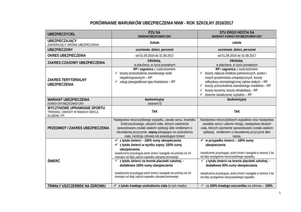 PORÓWNANIE WARUNKÓW UBEZPIECZENIA NNW - ROK SZKOLNY 2016/2017 UBEZPIECZYCIEL UBEZPIECZAJĄCY ZAWIERAJĄCY UMOWĘ UBEZPIECZENIA UBEZPIECZONY OKRES UBEZPIECZENIA ZAKRES CZASOWY UBEZPIECZENIA ZAKRES TERYTORIALNY UBEZPIECZENIA WARIANT UBEZPIECZENIA KOMISYJNY/BEZKOMISYJNY WYCZYNOWE UPRAWIANIE SPORTU TRENINGI, ZAWODY W RAMACH SEKCJI, KLUBÓW, ITP. PRZEDMIOT I ZAKRES UBEZPIECZENIA ŚMIERĆ TRWAŁY USZCZERBEK NA ZDROWIU PZU SA STU ERGO HESTIA SA WARIANTBEZKOMISYJNY WARIANT KOMISYJNY/BEZKOMISYJNY Szkoła szkoła uczniowie, dzieci, personel uczniowie, dzieci, personel od 01.09.2016 do 31.08.2017 24h/dobę, w placówce, w życiu prywatnym RP i zagranica z zastrzeżeniem: koszty przeszkolenia zawodowego osób niepełnosprawnych – RP usługi powypadkowe typu Assistance – RP bezkomisyjny (wariant II) od 01.09.2016 do 31.08.2017 24h/dobę, w placówce, w życiu prywatnym RP i zagranica z zastrzeżeniem: koszty nabycia środków pomocniczych, protez i innych przedmiotów ortopedycznych, koszty odbudowy stomatologicznej zębów stałych – RP koszty przeszkolenia zawodowego inwalidów – RP koszty leczenia, koszty rehabilitacji – RP dzienne świadczenie szpitalne – RP bezkomisyjny TAK TAK Następstwa nieszczęśliwego wypadku, zawału serca, krwotoku śródczaszkowego, obrażeń ciała, których zaistnienie spowodowane zostało atakiem epilepsji albo omdleniem o nieustalonej przyczynie, sepsą polegające na uszkodzeniu ciała, rozstroju zdrowia lub powodujące śmierć z tytułu śmierci – 100% sumy ubezpieczenia z tytułu śmierci w wyniku sepsy- 100% sumy ubezpieczenia Następstwa nieszczęśliwych wypadków oraz następstwa zawałów serca i udarów mózgu, następstwa obrażeń ciała, których zaistnienie spowodowane zostało atakiem epilepsji, omdleniem o nieustalonej przyczynie albo sepsą w przypadku śmierci – 100% sumy ubezpieczenia świadczenie przysługuje jeżeli śmierć nastąpiła nie później niż 24 miesiące od daty zajścia wypadku ubezpieczeniowego świadczenie przysługuje, jeżeli śmierć nastąpiła w okresie 2 lat od daty wystąpienia nieszczęśliwego wypadku z tytułu śmierci na terenie placówki szkolnej – dodatkowo 100% sumy ubezpieczenia z tytułu śmierci na terenie placówki szkolnej – dodatkowo 50% sumy ubezpieczenia świadczenie przysługuje jeżeli śmierć nastąpiła nie później niż 24 miesiące od daty zajścia wypadku ubezpieczeniowego świadczenie przysługuje, jeżeli śmierć nastąpiła w okresie 2 lat od daty wystąpienia nieszczęśliwego wypadku z tytułu trwałego uszkodzenia ciała (w tym między za 100% trwałego uszczerbku na zdrowiu – 100% 1 UBEZPIECZYCIEL PZU SA STU ERGO HESTIA SA WARIANTBEZKOMISYJNY WARIANT KOMISYJNY/BEZKOMISYJNY innymi: całkowita utrata narządu lub organu lub całkowita utrata ich funkcji, śpiączka trwająca dłużej niż 30 dni) – do 100% sumy ubezpieczenia – zgodnie z Tabelą Nr 3 w OWU z tytułu trwałego uszczerbku na zdrowiu spowodowanego wyłącznie zawałem serca, krwotokiem śródczaszkowym lub poważnym uszkodzeniem ciała – za 1% trwałego uszczerbku – 1% sumy ubezpieczenia sumy ubezpieczenia za 1% trwałego uszczerbku – 1% sumy ubezpieczenia Świadczenie zgodnie z zasadami oceny, ustalania i orzekania trwałego uszczerbku na zdrowiu dla lekarzy współpracujących z Grupą Ergo Hestia W tabelach m.in.: trwałe uszkodzenia ciała, złamania kości, zwichnięcia stawów, skręcenia, skutki oparzeń, odmrożenia, pogryzień, rany cięte (w tym m.in.: blizny), następstwa wstrząśnienia mózgu, zatrucia gazami.itp. z tytułu złamań kości lub zwichnięć stawów – do 100% sumy ubezpieczenia – zgodnie z Tabelą nr 4 w OWU w przypadku leczenia operacyjnego złamania albo zwichnięcia – dodatkowo świadczenie w wysokości 2% sumy ubezpieczenia za każdy operowany narząd z tytułu oparzeń lub odmrożeń – do 20% sumy ubezpieczenia – zgodnie z Tabelą nr 6 w OWU z tytułu wstrząśnienia lub podejrzenia wstrząśnienia mózgu – do 3% sumy ubezpieczenia – zgodnie z Tabelą nr 7 w OWU, przysługuje, jeśli ubezpieczony był hospitalizowany z tytułu pogryzień, pokąsań, ukąszeń – 10% sumy ubezpieczenia – przysługuje, jeśli ubezpieczony był hospitalizowany ŚWIADCZENIE „ZA BÓL” jednorazowe świadczenie w przypadku obrażeń, które nie spowodowały trwałego uszczerbku na zdrowiu, a wystąpiły poniższe następstwa: a/ nagłe zatrucie gazami, substancjami i produktami chemicznymi, porażenie prądem, piorunem, które to stany wymagały hospitalizacji - 5% sumy ubezpieczenia jednorazowe świadczenie w przypadku urazów ciała, które nie spowodowały trwałego uszczerbku na zdrowiu, a wymagały interwencji lekarskiej w placówce medycznej, połączonej z dalszym leczeniem (wymagały co najmniej jednej wizyty kontrolnej u lekarza) - 100 zł 2 UBEZPIECZYCIEL PZU SA STU ERGO HESTIA SA WARIANTBEZKOMISYJNY WARIANT KOMISYJNY/BEZKOMISYJNY b/ następstwa urazów ciała z jednego wypadku, które wymagało interwencji lekarskiej w placówce medycznej i jest połączone z dalszym leczeniem, wymaga co najmniej jednej wizyty kontrolnej u lekarza - 1,5% sumy ubezpieczenia ZWROT KOSZTÓW zwrot kosztów leczenia (w tym kosztów rehabilitacji, kosztów leczenia stomatologicznego zębów stałych) poniesionych na terytorium RP oraz poza granicami kraju – do 30% sumy ubezpieczenia Leczenie - wizyty i konsultacje lekarskie, leczenie ambulatoryjne, leczenie szpitalne, zabiegi ambulatoryjne, zabiegi operacyjne, badania zlecone przez lekarza, przyjmowanie leków oraz stosowanie środków opatrunkowych, transport z miejsca wypadku ubezpieczeniowego do szpitala lub ambulatorium, rehabilitację. Zwrot kosztów leczenia przysługuje jeżeli: - były niezbędne z medycznego punktu widzenia, - konieczność ich poniesienia powstała w ciągu 24 miesięcy (a w przypadku rehabilitacji jeżeli konieczność jej przeprowadzenia zaistniała nie później niż w okresie 6 miesięcy) od dnia 