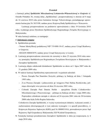 Protokół z lustracji pełnej Spółdzielni Mieszkaniowej Lokatorsko-Własnościowej w Grajewie ul. Osiedle Południe 36, zwanej dalej „Spółdzielnią”, przeprowadzonej w okresie od 4 maja do 16 czerwca 2010 roku przez lustratora Jerzego Telszewskiego, posiadającego uprawnienia lustracyjne Nr 5633/08, nadane przez Krajową Radę Spółdzielczą w Warszawie. Lustrację przeprowadzono na podstawie upoważnienia z dnia 19 kwietnia 2010 roku, wydanego przez Dyrektora Spółdzielczego Regionalnego Związku Rewizyjnego w Białymstoku. W toku lustracji ustalono, co następuje: I. Informacje wstępne 1. Spółdzielnia posiada: - Numer Identyfikacji podatkowej NIP 719-000-18-67, nadany przez Urząd Skarbowy w Grajewie. - REGON 000483079, nadany przez Urząd Statystyczny w Łomży. 2. Lustrację przeprowadzono stosownie do zawartej w dniu 25 stycznia 2010 roku umowy pomiędzy Spółdzielczym Regionalnym Związkiem Rewizyjnym w Białymstoku i Zarządem Spółdzielni. 3. Lustracją objęto całokształt działalności Spółdzielni za okres od 1 lipca 2007 roku do 31 grudnia 2009 roku. 4. W trakcie lustracji Spółdzielnię reprezentowali i wyjaśnień udzielali: − Prezes Zarządu Pan Stanisław Korycki, pełniący tę funkcję od dnia 1 listopada 1995 roku, − Z-ca Prezesa Zarządu i jednocześnie gł. księgowa Pani Halina Rostkowska, pełniąca obowiązki wice prezesa od dnia 24 stycznia 2001 roku, − Członek Zarządu Pani Danuta Stefan – specjalista Działu CzłonkowskoMieszkaniowego i Pracowniczego – pełniąca tę funkcję od dnia 1 maja 2008 roku. Poprzednio członkiem zarządu w okresie od 24 stycznia 2001 roku do 30 kwietnia 2008 roku była Zofia Regina Sulewska. Członkowie Zarządu Spółdzielni, w wyżej wymienionym składzie, wykazani zostali, z zachowaniem obowiązujących w tym zakresie wymogów i w sposób prawidłowy, w Krajowym Rejestrze Sądowym (KRS) pod Nr 0000031016, prowadzonym przez Sąd Rejonowy Sąd Gospodarczy Białymstoku XII Wydział Gospodarczy. 5. Tematykę lustracji przedstawiono Zarządowi Spółdzielni w dniu jej rozpoczęcia, tj. 4 maja 2010 roku. 2 6. O rozpoczęciu lustracji powiadomiono Radę Nadzorczą Spółdzielni za pośrednictwem jej Przewodniczącego Pana Daniela Bobrowicza, zapoznając go w dniu 4 maja 2010 roku z tematyką badań lustracyjnych. 7. Ostatnia pełna lustracja Spółdzielni przeprowadzona została przez Spółdzielczy Regionalny Związek Rewizyjny w Białymstoku w dniach od 14 września 2007 roku do 31 października 2007 roku i obejmowała całokształt działalności za okres od 1 lipca 2004 roku do 30 czerwca 2007 roku. Ponadto w dniach od 17 do 30 września 2008 roku Spółdzielnia objęta została kontrolą częściową w zakresie działalności inwestycyjnej za okres od 1 lipca 2007 roku do 30 czerwca 2008 roku. W wyniku tych lustracji Związek Rewizyjny sformułował ogółem 11 wniosków polustracyjnych. Przeprowadzona przez lustratora analiza stanu realizacji tych wniosków wykazała, że Zarząd wnioski polustracyjne zrealizował. I tak: • zaległe urlopy wypoczynkowe, w tym także zaległe urlopy wypoczynkowe członków Zarządu, wykorzystano do końca 2008 roku, • ceny wywoławcze lokali wystawianych przez Spółdzielnię na zbycie ustalane były do 50 % wyżej od cen wynikających z operatów szacunkowych, sporządzanych przez rzeczoznawców majątkowych, • wniosek dotyczący ustalania w treści umów na budowę lokali, zawieranych z przyszłymi użytkownikami, wstępnego i ostatecznego kosztu budowy, zrealizowano częściowo. Przyjęto, bowiem zasadę, wpisywania do umów, że koszt wstępny budowy jest równy kosztowi ostatecznemu, • do kalkulacji kosztów obsługi inwestycyjnej ujmowane są wszystkie koszty ponoszone przez Spółdzielnię na tą działalność, • zmodyfikowano zasady kwalifikowania części kosztów utrzymania zaplecza technicznego, a do dnia 21 grudnia 2009 roku całkowicie zlikwidowano funkcjonowanie zaplecza technicznego, • skorygowano i odstąpiono od odnoszenia części kosztów ogólnych w ciężar zakupu ciepła, • wyeliminowano nieprawidłowości w naliczaniu stawek roboczogodzin w wykonawstwie własnym, • przy sporządzaniu kalkulacji stawek opłat za użytkowanie lokali, narzut kosztów ogólnych stosowano do wszystkich kategorii lokali, w tym także do garaży, • z dniem 1 stycznia 2008 roku zmniejszono do 8 % zaliczki pobierane za dostawę ciepła do lokali znajdujących się w zarządzie Spółdzielni, 3 • objęto dodatkowym nadzorem działania w zakresie windykacji z tytułu opłat za lokale, • uzyskane w skali roku nadwyżki przychodów nad kosztami były zagospodarowywane zgodnie z zapisami ustawy Prawo Spółdzielcze oraz ustawy o spółdzielniach mieszkaniowych oraz decyzjami Zebrania Przedstawicieli, a następnie Walnego Zgromadzenia. 8. W badanym okresie zewnętrzne organy inspekcyjno-kontrolne przeprowadziły w Spółdzielni łącznie 5 kontroli. I tak: • Powszechna Kasa Oszczędności-Bank Polski S.A. Oddział w Białymstoku przeprowadziła 3 kontrole w dniach 4 lipca 2007 roku, 10 lipca 2008 roku i 18 września 2009 roku w zakresie „Realizacja przepisów ustawy z dnia 30 listopada 1995 roku o pomocy państwa w spłacie kredytów”. Nieprawidłowości nie stwierdzono, wniosków pokontrolnych nie zredagowano. Każdorazowo potwierdzono, że „Spółdzielnia prowadzi ewidencję analityczną zgodnie z wymogami przewidzianymi w ww. ustawie”. • Zakład Ubezpieczeń Społecznych Oddział w Białymstoku w dniach 05-12 maja 2008 roku przeprowadził kontrolę „Prawidłowości i rzetelności obliczania, potrącania i opłacania składek i wypłat, do których pobierania zobowiązany jest Zakład oraz zgłaszania do ubezpieczeń społecznych i ubezpieczenia zdrowotnego”. Nieprawidłowości nie stwierdzono, wniosków pokontrolnych nie zredagowano, • Państwowa Inspekcja Pracy w Białymstoku Oddział w Łomży przeprowadziła kontrolę w dniach 13-1