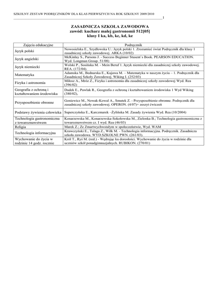 SZKOLNY ZESTAW PODRĘCZNIKÓW DLA KLAS PIERWSZYCH NA ROK SZKOLNY 2009/2010 __________________________________________________________________________________________ 1 ZASADNICZA SZKOŁA ZAWODOWA zawód: kucharz małej gastronomii 512[05] klasy I ka, kb, kc, kd, ke Zajęcia edukacyjne Język polski Język angielski Język niemiecki Matematyka Fizyka i astronomia Podręcznik Nowosielska E., Szydłowska U.: Język polski 1. Zrozumieć świat Podręcznik dla klasy 1 zasadniczej szkoły zawodowej. ARKA (10/02) McKinlay S., Parsons J. - Success Beginner Stusent`s Book. PEARSON EDUCATION. Wyd. Longman Group. 51/08) Wolski P., Sosińska M. - Mein Beruf 1. Język niemiecki dla zasadniczej szkoły zawodowej. REA. (172/04). Adamska M., Bednarska E., Kujawa M. – Matematyka w naszym życiu – 1. Podręcznik dla Zasadniczej Szkoły Zawodowej. Wiking I. (252/03) Miłosz A., Mróz Z., Fizyka i astronomia dla zasadniczej szkoły zawodowej Wyd. Rea (396/02) Geografia z ochroną i kształtowaniem środowiska Dudek E., Pawlak R., Geografia z ochroną i kształtowaniem środowiska 1 Wyd Wiking (380/02), Przysposobienie obronne Goniewicz M., Nowak-Kowal A., Smutek Z. - Przysposobienie obronne. Podręcznik dla zasadniczej szkoły zawodowej. OPERON. (4/07)+ zeszyt ćwiczeń Podstawy żywienia człowieka Superczyńska E., Karczmarek –Żylińska M. Zasady żywienia Wyd. Rea (10/2004) Technologia gastronomiczna z towaroznawstwem Religia Technologia informacyjna Wychowanie do życia w rodzinie 14 godz. rocznie Konarzewska M., Konarzewska-Sokołowska M., Zielonka B.; Technologia gastronomiczna z towaroznawstwem cz. I wyd. Rea (46/03) Marek Z.; Ze Zmartwychwstałym w społeczeństwie, Wyd. WAM Krawczyński E., Talaga Z., Wilk M. - Technologia informacyjna. Podręcznik. Zasadnicza szkoła zawodowa. WYD.SZKOLNE PWN. (261/03). Król T., Ryś M. (red.) - Wędrując ku dorosłości. Wychowanie do życia w rodzinie dla uczniów szkół ponadgimnazjalnych. RUBIKON. (270/01) SZKOLNY ZESTAW PODRĘCZNIKÓW DLA KLAS PIERWSZYCH NA ROK SZKOLNY 2009/2010 __________________________________________________________________________________________ 2 TECHNIKUM nr 9 zawód: technik organizacji usług gastronomicznych 341[07] klasy I Ta, Tb, Tc Zajęcia edukacyjne Język polski Język angielski Język niemiecki Historia Matematyka Fizyka i astronomia Chemia Biologia Geografia Technologia informacyjna Przysposobienie obronne Religia etyka Język obcy zawodowy Zasady żywienia Technologia gastronomiczna Wychowanie do życia w rodzinie Podręczniki Chemperek D., Kalbarczyk A. - Język polski. Zrozumieć tekst, zrozumieć człowieka. Starożytność - średniowiecze. Podręcznik. Liceum i technikum, klasa 1, część 1. WSiP S. A.. (26/08). Chemperek D., Kalbarczyk A. - Zrozumieć tekst - zrozumieć człowieka. Renesans preromantyzm. Podręcznik do języka polskiego dla liceum i technikum. Klasa 1, część 2. Zakres podstawowy i rozszerzony. WSiP S. A.. (128/08). Greenall S., Kryszewska H. - ForMat Intro. Elementary (zakres podstawowy). MACMILLAN POLSKA. (87/04). Rapacka S., Lewandowska M., Nawrotkiewicz J. - Hier und da 1. Podręcznik z ćwiczeniami dla liceum ogólnokształcącego, liceum profilowanego i technikum wraz z Zeszytem maturalnym. Zakres podstawowy. WYD.SZKOLNE PWN. (88/05). Choińska- Mika J., Lengauer W., Tymowski M., Zielińska K.: Historia 1. Kształcenie w zakresie podstawowym. Wyd. WSiP (1/08) Karpiński M., Dobrowolska M., Braun M., Lech J. - Matematyka 1. Podręcznik dla liceum i technikum. Zakres podstawowy. GDAŃSKIE WYDAWNICTWO OŚWIATOWE. (375/02) Fiałkowska M., Fiałkowski K., Sagnowska B. - Fizyka dla szkół ponadgimnazjalnych (podręcznik dla liceum ogólnokształcącego, liceum profilowanego i technikum - kształcenie w zakresie podstawowym) ZAMKOR. (46/02). Hejwowska S., Marcinkowski R. - Chemia ogólna i nieorganiczna. Chemia 1. Zakres podstawowy. Podręcznik dla liceum ogólnokształcącego, liceum profilowanego i technikum OPERON. (263/03). Lewiński W., Walkiewicz J., Skirmuntt G., Prokop J. - Biologia 1. Zakres podstawowy. Podręcznik dla liceum ogólnokształcącego, liceum profilowanego i technikum. OPERON. (171/02). Lenartowicz B., Wilczyńska E., Wójcik M. - Geografia na czasie 1. Geografia fizyczna świata i Polski. Podręcznik. Zakres podstawowy. PWN. (14/07) Wrotek W. – Technologia informacyjna. Podręcznik dla szkół ponadgimnazjalnych. HELION S.A. (44/05) Goniewicz M., Nowak-Kowal A., Smutek Z. - Przysposobienie obronne. Część II. Podręcznik dla liceum ogólnokształcącego, liceum profilowanego i technikum (wydanie zmienione). OPERON. (161/06).+ zeszyt ćwiczeń ks. Jan Szpet, Spotkania z Chrystusem wyd. Św. Wojciecha Poznań Baude A., Iglesias M, Inesta A., Ready to order; Elementary Inglish for the restaurants industry, Wyd. Longman j.niemiecki zawodowy wg materiałów własnych nauczycieli H.Kunachowicz, Elzbieta Czarnowska - Zasady Żywienia człowieka WSiP Procner A. - Technologia gastronomiczna z towaroznawstwem cz. I; WSiP Król T., Ryś M. (red.) - Wędrując ku dorosłości. Wychowanie do życia w rodzinie dla uczniów szkół ponadgimnazjalnych. Wyd. Rubikon. (270/01) SZKOLNY ZESTAW PODRĘCZNIKÓW DLA KLAS PIERWSZYCH NA ROK SZKOLNY 2009/2010 __________________________________________________________________________________________ 3 TECHNIKUM nr 9 zawód: technik hotelarstwa 341[04] klasy I Ha, Hb Zajęcia edukacyjne Język polski Język angielski Język niemiecki Historia Matematyka Fizyka i astronomia Chemia Biologia Geografia Technologia informacyjna Przysposobienie obronne Religia etyka Organizacja pracy w hotelarstwie Obsługa konsumenta Język obcy zawodowy Zajęcia praktyczne Wychowanie do życia w rodzinie Podręczniki Chemperek D., Kalbarczyk A. - Język polski. Zrozumieć tekst, zrozumieć człowieka. Starożytność - średniowiecze. Podręcznik. Liceum i technikum, klasa 1, część 1. WSiP S. A.. (26/08). Chemperek D., Kalbarczyk A. - Zrozumieć tekst - zro