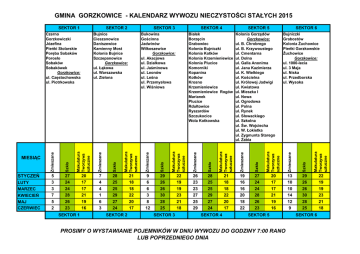 GMINA GORZKOWICE - KALENDARZ WYWOZU NIECZYSTOŚCI STAŁYCH 2015 SEKTOR 4 SEKTOR 5 SEKTOR 6 Makulatura Tworzywa sztuczne Zmieszane Szkło Makulatura Tworzywa sztuczne Zmieszane Szkło Makulatura Tworzywa sztuczne Zmieszane Szkło Makulatura Tworzywa sztuczne Zmieszane Szkło Makulatura Tworzywa sztuczne Bujniczki Grabostów Kolonia Żuchowice Pieńki Gorzkowskie Żuchowice Gorzkowice: ul. 1000-lecia ul. 3 Maja ul. Niska ul. Przedborska ul. Wysoka Szkło Kolonia Gorzędów Gorzkowice: ul. B. Chrobrego ul. B. Krzywoustego ul. Cmentarna ul. Dolna ul. Galla Anonima ul. Jana Kazimierza ul. K. Wielkiego ul. Kościelna ul. Królowej Jadwigi ul. Kwiatowa ul. Mieszka I ul. Nowa ul. Ogrodowa ul. Polna ul. Rynek ul. Słowackiego ul. Szkolna ul. Św. Wojciecha ul. W. Łokietka ul. Zygmunta Starego ul. Żabia Zmieszane Białek Borzęcin Grabowiec Kolonia Bujniczki Kolonia Kotków Kolonia Krzemieniewice Kolonia Plucice Komorniki Kopanina Kotków Krosno Krzemieniewice Krzemieniewice Rogów Marianek Plucice Rdułtowice Ryszardów Szczukocice Wola Kotkowska Makulatura Tworzywa sztuczne SEKTOR 3 Bukowina Gościnna Jadwinów Wilkoszewice Gorzkowice: ul. Akacjowa ul. Działkowa ul. Jaśminowa ul. Leonów ul. Leśna ul. Przemysłowa ul. Wiśniowa Szkło SEKTOR 2 Bujnice Cieszanowice Daniszewice Kamienny Most Kolonia Bujnice Szczepanowice Gorzkowice: ul. Łąkowa ul. Warszawska ul. Zielona Zmieszane SEKTOR 1 Czerno Gorzkowiczki Józefina Pieńki Stolarskie Poręba Sobaków Porosło Sobaków Sobakówek Gorzkowice: ul. Częstochowska ul. Piotrkowska STYCZEŃ 5 27 20 7 28 21 9 29 22 26 28 21 19 27 20 13 29 22 LUTY 3 24 17 4 25 18 6 26 19 23 25 18 16 24 17 10 26 19 MARZEC 3 24 17 4 25 18 6 26 19 23 25 18 16 24 17 10 26 19 KWIECIEŃ 7 28 21 1 29 22 3 30 23 27 29 22 20 28 21 14 30 23 MAJ CZERWIEC 5 26 19 6 27 20 8 28 21 25 27 20 18 26 19 12 28 21 2 23 16 3 24 17 12 25 18 29 24 17 22 23 16 9 25 18 MIESIĄC SEKTOR 1 SEKTOR 2 SEKTOR 3 SEKTOR 4 SEKTOR 5 PROSIMY O WYSTAWIANIE POJEMNIKÓW W DNIU WYWOZU DO GODZINY 7:00 RANO LUB POPRZEDNIEGO DNIA SEKTOR 6