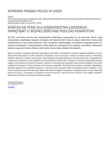 KOMENDA MIEJSKA POLICJI W ŁODZI Źródło: http://www.lodz.policja.gov.pl/eld/komunikaty-1/aktualnosci/10093,Koncza-sie-ferie-dla-wojewodztwa-lodzkiego-Pamietajmyo-bezpieczenstwie-podczas-.html Wygenerowano: Środa, 8 marca 2017, 05:55 KOŃCZĄ SIĘ FERIE DLA WOJEWÓDZTWA ŁÓDZKIEGO. PAMIĘTAJMY O BEZPIECZEŃSTWIE PODCZAS POWROTÓW W 2017 rok ferie zimowe dla województwa łódzkiego rozpoczęły się 14 stycznia. Wiele osób skorzystało z możliwości wyjazdu za miasto. 29 stycznia 2017 roku to ostatni dzień ferii i wiele osób zaplanowało w tym czasie powroty. Choć synoptycy zapowiadają, że będzie to pogodny okres, to jednak pamiętajmy o dostosowaniu stylu jazdy do panujących na drogach warunków. Miejscami jezdnie mogą być bardzo śliskie a dość ostre słońce może oślepiać kierujących. Zanim wyruszymy w podróż przygotujmy odpowiednio samochód, w szczególności zwracając uwagę na oświetlenie, poziom płynów eksploatacyjnych czy stan ogumienia. Pamiętajmy, aby nie wyruszać w drogę na ostatnią chwilę, za kierownicę siadajmy wypoczęci i róbmy częste postoje. Przestrzegajmy przepisów dotyczących przewożenia dzieci w odpowiednich urządzeniach i pasażerów, którzy podobnie jak kierujący powinni zapinać pasy. Policjanci w szczególny sposób będą zwracać uwagę na zachowania na drodze kierowców i pieszych. Funkcjonariusze prowadzić będą kontrole prędkości oraz stanu trzeźwości kierujących a także sprawdzać stan techniczny pojazdów. W okresie ferii zimowych na terenie województwa łódzkiego doszło do 79 wypadków drogowych, w których śmierć poniosło 6 osób a 99 zostało rannych. Niestety, w tym okresie policjanci musieli interweniować wobec blisko 180 nietrzeźwych kierujących. Pamiętajmy także, że jutro wiele osób powróci do pracy i na drogach, szczególnie w dużych miastach, zrobi się tłoczno. Biorąc to pod uwagę, wyjedźmy odpowiednio wcześniej, aby uniknąć nerwowych sytuacji. Ocena: 0/5 (0) Tweetnij