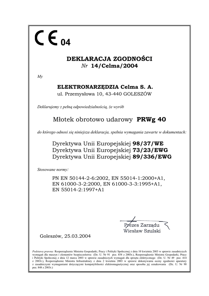 DEKLARACJA ZGODNOŚCI Nr 14/Celma/2004 My ELEKTRONARZĘDZIA Celma S. A. ul. Przemysłowa 10, 43-440 GOLESZÓW Deklarujemy z pełną odpowiedzialnością, że wyrób Młotek obrotowo udarowy PRWg 40 do którego odnosi się niniejsza deklaracja, spełnia wymagania zawarte w dokumentach: Dyrektywa Unii Europejskiej 98/37/WE Dyrektywa Unii Europejskiej 73/23/EWG Dyrektywa Unii Europejskiej 89/336/EWG Stosowane normy: PN EN 50144-2-6:2002, EN 55014-1:2000+A1, EN 61000-3-2:2000, EN 61000-3-3:1995+A1, EN 55014-2:1997+A1 Goleszów, 25.03.2004 Podstawa prawna: Rozporządzenie Ministra Gospodarki, Pracy i Polityki Społecznej z dnia 10 kwietnia 2003 w sprawie zasadniczych wymagań dla maszyn i elementów bezpieczeństwa (Dz. U. Nr 91 poz. 858 z 2003r.), Rozporządzenie Ministra Gospodarki, Pracy i Polityki Społecznej z dnia 12 marca 2003 w sprawie zasadniczych wymagań dla sprzętu elektrycznego (Dz. U. Nr 49 poz. 414 z 2003r.), Rozporządzenie Ministra Infrastruktury z dnia 2 kwietnia 2003 w sprawie dokonywania oceny zgodności aparatury z zasadniczymi wymaganiami dotyczącymi kompatybilności elektromagnetycznej oraz sposobu jej oznakowania (Dz. U. Nr 90 poz. 848 z 2003r.)