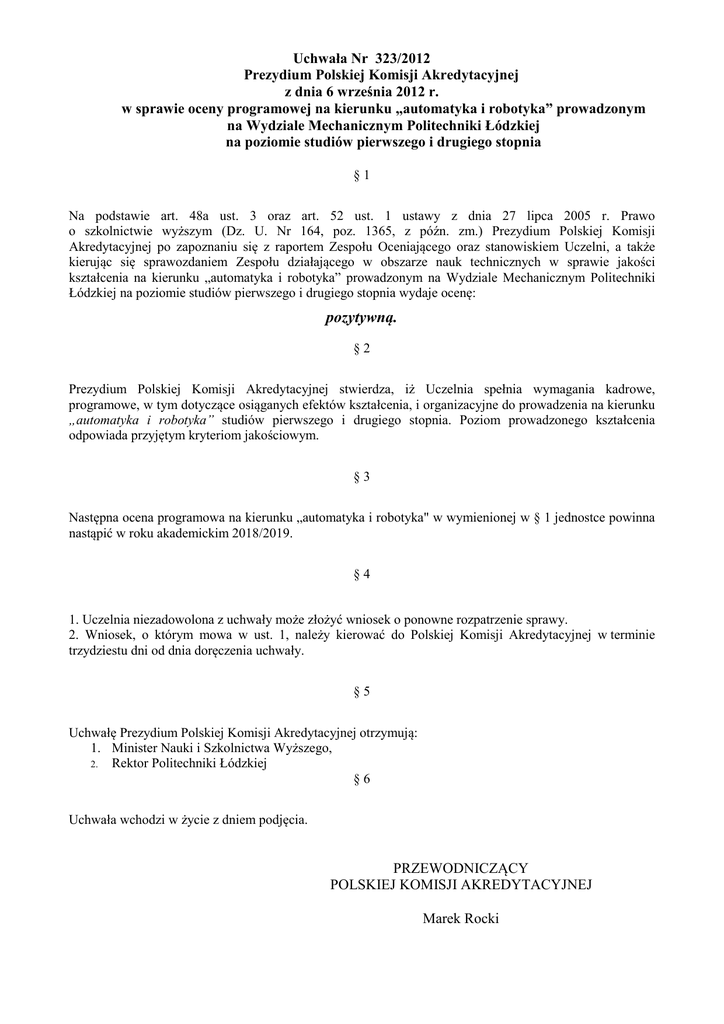 Uchwała Nr 323/2012 Prezydium Polskiej Komisji Akredytacyjnej z dnia 6 września 2012 r. w sprawie oceny programowej na kierunku „automatyka i robotyka” prowadzonym na Wydziale Mechanicznym Politechniki Łódzkiej na poziomie studiów pierwszego i drugiego stopnia §1 Na podstawie art. 48a ust. 3 oraz art. 52 ust. 1 ustawy z dnia 27 lipca 2005 r. Prawo o szkolnictwie wyższym (Dz. U. Nr 164, poz. 1365, z późn. zm.) Prezydium Polskiej Komisji Akredytacyjnej po zapoznaniu się z raportem Zespołu Oceniającego oraz stanowiskiem Uczelni, a także kierując się sprawozdaniem Zespołu działającego w obszarze nauk technicznych w sprawie jakości kształcenia na kierunku „automatyka i robotyka” prowadzonym na Wydziale Mechanicznym Politechniki Łódzkiej na poziomie studiów pierwszego i drugiego stopnia wydaje ocenę: pozytywną. §2 Prezydium Polskiej Komisji Akredytacyjnej stwierdza, iż Uczelnia spełnia wymagania kadrowe, programowe, w tym dotyczące osiąganych efektów kształcenia, i organizacyjne do prowadzenia na kierunku „automatyka i robotyka” studiów pierwszego i drugiego stopnia. Poziom prowadzonego kształcenia odpowiada przyjętym kryteriom jakościowym. §3 Następna ocena programowa na kierunku „automatyka i robotyka" w wymienionej w § 1 jednostce powinna nastąpić w roku akademickim 2018/2019. §4 1. Uczelnia niezadowolona z uchwały może złożyć wniosek o ponowne rozpatrzenie sprawy. 2. Wniosek, o którym mowa w ust. 1, należy kierować do Polskiej Komisji Akredytacyjnej w terminie trzydziestu dni od dnia doręczenia uchwały. §5 Uchwałę Prezydium Polskiej Komisji Akredytacyjnej otrzymują: 1. Minister Nauki i Szkolnictwa Wyższego, 2. Rektor Politechniki Łódzkiej §6 Uchwała wchodzi w życie z dniem podjęcia. PRZEWODNICZĄCY POLSKIEJ KOMISJI AKREDYTACYJNEJ Marek Rocki Tabela nr 2. Ocena spełnienia kryteriów oceny programowej Stopień spełnienia kryterium Kryterium wyróżniająco w pełni znacząco częściowo koncepcja rozwoju kierunku cele i efekty kształcenia oraz system ich weryfikacji + program studiów + + + zasoby kadrowe infrastruktura dydaktyczna prowadzenie badań naukowych system wsparcia studentów w procesie uczenia się wewnętrzny system zapewnienia jakości niedostatecznie + + + + Określone efekty kształcenia na kierunku „automatyka i robotyka” mają pełne szanse ich realizacji. Zapewnia to bardzo rozbudowany i sprawnie działający wewnętrzny system kontroli jakości kształcenia. Wewnętrzny system jakości kształcenia funkcjonuje bardzo dobrze i jest wysoce efektywny. Program studiów jest bardzo dobrze modyfikowany na bieżąco przy współudziale kadry akademickiej, pracodawców i studentów. Treści programowe są dobrze wypełnione aktualnymi problemami naukowymi i technicznymi z zakresu kierunku „automatyka i robotyka” i wiążą się z potrzebami przyszłych pracodawców absolwentów. Zapewniają to między innymi dobre kontakty I bieżące konsultacje z przemysłem. Proces dyplomowania na ogół dobrze weryfikuje końcowe efekty kształcenia. O skuteczności tego świadczy pełna zatrudnialność absolwentów już w semestrze dyplomowym. Zespół Oceniający wysoko ocenia poziom merytoryczny prac dyplomowych, natomiast zaleca, aby promotorzy prowadzący prace dyplomowe przy ocenie prac dyplomowych w większym stopniu zwracali uwagę na konieczność pełniejszego przeglądu czasopism naukowo-technicznych związanych z pracą dyplomową i na staranniejszą stronę edytorska pracy i ponadto, aby w każdej pracy dyplomowej wyraźnie był określony cel pracy, przedstawiony precyzyjny opis rozwiązania problemu, analiza otrzymanych wyników. Należy też zwracać uwagę dyplomantom na stronę językową prac dyplomowych, aby dyplomanci mogli się wykazać opanowaniem techniki pisania prac dyplomowych. W czasie poprzedniej wizytacji Zespołu Oceniającego PKA w ocenie z 2006 roku zarzucono zbyt duży odsiew studentów pierwszego roku. Stosunek liczby studentów na I roku do liczby studentów na II roku wtedy wynosił 59/26. Obecnie odsiew ten jest jeszcze większy i wyraża się stosunkiem 107/33, co jest zjawiskiem nadal niekorzystnym. Cieszy fakt, ze Władze Wydziału bardzo dbają o wysoki poziom kształcenia. Komisja Oceniająca zaleca wprowadzić na każdym pierwszym semestrze dodatkowe stałe kształcenie wyrównawcze z matematyki i fizyki, zapobiegające zbyt dużemu odsiewowi studentów pierwszego roku. Wydział ma dość liczną (55 osób) i mocną, lecz rozdrobnioną na 8 kierunków kształcenia, kadrę samodzielnych nauczycieli akademickich (prof./dr hab.). Ostatnio sytuacja poprawiła się, albowiem po wygaszeniu w marcu br. kształcenia na kierunku „papiernictwo i poligrafia”, średnio na jeden kierunek przypada 55:7=ok. 8 pracowników samodzielnych; do tego czasu było to tylko ok. 7 osób/kierunek, czyli bardzo mało ponad wymagane minimum 6 osób. Ponadto, Wydział bierze udział w kształceniu w Centrum Kształcenia Międzynarodowego PŁ (International Faculty of Enginnering) zasilając prowadzone tam dwa kierunki kształcenia: „mechanical engineering and applied computer science” (studia I stopnia) oraz kierunek „mechatronics” (studia II stopnia). Należy uznać, że zwiększenie liczby samodzielnych pracowników naukowo – dydaktycznych jest dla Wydziału zadaniem pilnym. Na kierunku kształcenia „automatyka i robotyka” jest bardzo mało, tylko 9% ogólnej liczby studentów Wydziału, co może utrudniać racjonalne ekonomicznie prowadzenie zajęć. Aktualnie na II stopniu studiów stacjonarnych nie ma studentów. Wydział dostrzegł ten problem i uzyskał środki unijne z Programu Operacyjnego Kapitał Ludzki (5 803 301 zł) na realizację (styczeń 2012 – czerwiec 2015, wspólnie z Wydziałem Elektrycznym PŁ) projektu pn. „Automatyk – robotyk kluczowy zawód XXI wieku”. Zespół Oceniający bardzo wysoko ocenia możliwości uzyskania zakładanych efektów ks