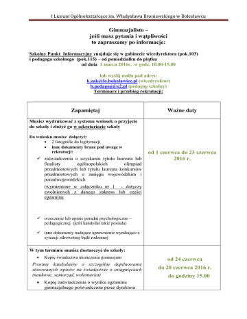 I Liceum Ogólnokształcące im. Władysława Broniewskiego w Bolesławcu Gimnazjalisto – jeśli masz pytania i wątpliwości to zapraszamy po informacje: Szkolny Punkt Informacyjny znajduje się w gabinecie wicedyrektora (pok.103) i pedagoga szkolnego (pok.115) – od poniedziałku do piątku od dnia 1 marca 2016r. w godz. 10.00-15.00 lub wyślij maila pod adres: [email protected] (wicedyrektor) [email protected] (pedagog szkolny) Terminarz i przebieg rekrutacji: Zapamiętaj Ważne daty Musisz wydrukować z systemu wniosek o przyjęcie do szkoły i złożyć go w sekretariacie szkoły Do wniosku musisz dołączyć: 2 fotografie do legitymacji inne dokumenty brane pod uwagę w rekrutacji: zaświadczenia o uzyskaniu tytułu laureata lub finalisty ogólnopolskich olimpiad przedmiotowych lub tytułu laureata konkursów przedmiotowych o zasięgu wojewódzkim i ponadwojewódzkich od 1 czerwca do 23 czerwca 2016 r. (wymienione w załączniku nr 1 - dotyczy zwolnionych z danego zakresu lub części egzaminu orzeczenie lub opinie poradni psychologiczno – pedagogicznej (jeśli kandydat takie posiada) inne dokumenty nadające uprawnienie wynikające z sytuacji zdrowotnej bądź rodzinnej W tym terminie musisz dostarczyć do szkoły: Kopię świadectwa ukończenia gimnazjum Prosimy kandydatów o szczególne dopilnowanie stosowanych wpisów na świadectwie o osiągnięciach (naukowe, samorząd, wolontariat) Kopię zaświadczenia o wyniku egzaminu gimnazjalnego poświadczone przez dyrektora od 24 czerwca do 28 czerwca 2016 r. do godziny 15.00 I Liceum Ogólnokształcące im. Władysława Broniewskiego w Bolesławcu gimnazjum (najpóźniej w terminie 2 dni od daty otrzymania) Szkolna Komisja Rekrutacyjna weryfikuje osiągnięcia ucznia na podstawie danych w systemie elektronicznym i dostarczonych dokumentów – 30 czerwca 2016 roku Ogłoszenie listy kandydatów zakwalifikowanych i niezakwalifikowanych do klas (wywieszenie na tablicy ogłoszeń w szkole) Jeśli znalazłaś/ znalazłeś się na liście przyjętych musisz przyjść osobiście lub w Twoim imieniu może przyjść rodzic lub osoba upoważniona aby: 15 lipca 2016 roku (godz.12.00) Od 15 lipca 2016 r. potwierdzić wolę podjęcia nauki w naszej szkole (po ogłoszeniu wyników) przynieść oryginały świadectw i wyniki egzaminu - 26 lipca Ogłoszenie ostatecznej listy przyjętych i nieprzyjętych do szkoły 27 lipca 2016 r. Terminarz opracowany przez Szkolną Komisję Rekrutacyjną w I Liceum Ogólnokształcącym w Bolesławcu - na podstawie : Zarządzenie Nr 2/2016 z dnia 27 stycznia 2016r. Dolnośląskiego Kuratora Oświaty w sprawie terminów rekrutacji do gimnazjów oraz terminów i zasad rekrutacji kandydatów do szkół ponadgimnazjalnych na rok szkolny 2016/2017
