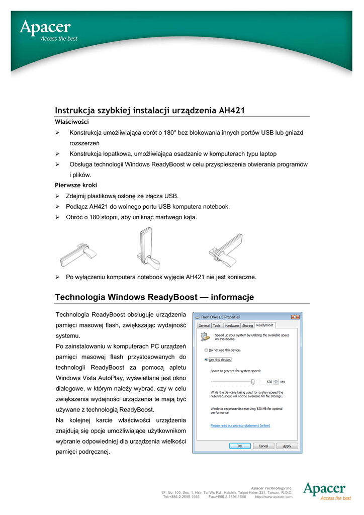 Instrukcja szybkiej instalacji urządzenia AH421 Właściwości ¾ Konstrukcja umożliwiająca obrót o 180° bez blokowania innych portów USB lub gniazd rozszerzeń ¾ Konstrukcja łopatkowa, umożliwiająca osadzanie w komputerach typu laptop ¾ Obsługa technologii Windows ReadyBoost w celu przyspieszenia otwierania programów i plików. Pierwsze kroki ¾ Zdejmij plastikową osłonę ze złącza USB. ¾ Podłącz AH421 do wolnego portu USB komputera notebook. ¾ Obróć o 180 stopni, aby uniknąć martwego kąta. ¾ Po wyłączeniu komputera notebook wyjęcie AH421 nie jest konieczne. Technologia Windows ReadyBoost — informacje Technologia ReadyBoost obsługuje urządzenia pamięci masowej flash, zwiększając wydajność systemu. Po zainstalowaniu w komputerach PC urządzeń pamięci masowej flash przystosowanych do technologii ReadyBoost za pomocą apletu Windows Vista AutoPlay, wyświetlane jest okno dialogowe, w którym należy wybrać, czy w celu zwiększenia wydajności urządzenia te mają być używane z technologią ReadyBoost. Na kolejnej karcie właściwości urządzenia znajdują się opcje umożliwiające użytkownikom wybranie odpowiedniej dla urządzenia wielkości pamięci podręcznej. Apacer Technology Inc. 9F, No. 100, Sec, 1, Hsin Tai Wu Rd., Hsichih, Taipei Hsien 221, Taiwan, R.O.C. Tel:+886-2-2696-1666 Fax:+886-2-1696-1668 http://www.apacer.com Wielkość pamięci podręcznej może wynosić od 230 MB do 4 GB. Firma Microsoft zaleca, aby wielkość pamięci podręcznej ReadyBoost była w proporcji co najmniej 1:1 w stosunku do wielkości pamięci głównej (RAM). Optymalną wydajność zapewniają wyższe wartości tego stosunku, do 3:1. Po wyjęciu urządzenia z komputera nie następuje utrata żadnych danych, ale komputer traci zwiększoną wydajność i system operacyjny ponownie wysyła żądania do dysku. Wydajność pamięci flash Aby zapewnić obsługę technologii ReadyBoost, urządzenia pamięci masowej flash muszą spełniać minimalne wymagania dotyczące wydajności, w tym przepustowość równą 2,5 MB/s dla odczytu losowych 4 KB danych i 1,75 MB/s dla zapisu losowych danych o wielkości 512 KB. Wyższe wymagania dotyczące wydajności dotyczą urządzenia, określonego jako „przystosowane do technologii ReadyBoost”: przepustowość 5 MB/s dla odczytu losowych 4 KB danych i 3 MB/s dla zapisu losowych danych o wielkości 512 KB. Aby w pełni korzystać z zalet zapewnianych przez technologię ReadyBoost, firma Microsoft zaleca używanie urządzeń przystosowanych do tej technologii. Apacer Technology Inc. 9F, No. 100, Sec, 1, Hsin Tai Wu Rd., Hsichih, Taipei Hsien 221, Taiwan, R.O.C. Tel:+886-2-2696-1666 Fax:+886-2-1696-1668 http://www.apacer.com