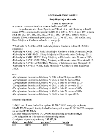 UCHWAŁA Nr XXIX/ 184 /2012 Rady Miejskiej w Kłodawie z dnia 20 lipca 2012r. w sprawie: zmiany uchwały w sprawie budżetu na 2012 rok. Na podstawie art. 18 ust. 2 pkt 4, pkt 9 lit. d, lit. i, pkt 10 ustawy z dnia 8 marca 1990 r. o samorządzie gminnym (Dz. U. z 2001 r., Nr 142, poz. 1591 z późn. zm.), art. 212, 214, 215, 219, 222, 235-237, 258, i 264 ust. 3 ustawy z dnia 27 sierpnia 2009 r. o finansach publicznych (Dz. U. Nr 157, poz. 1240 z późn. zm.) Rada Miejska w Kłodawie uchwala co następuje: § 1. W Uchwale Nr XIX/124/2011 Rady Miejskiej w Kłodawie z dnia 30.12.2011r zmienionej -Uchwałą Nr XX/131/2012 Rady Miejskiej w Kłodawie z dnia 27 stycznia 2012r. -Uchwałą Nr XXII/139/2012 Rady Miejskiej w Kłodawie z dnia 29 lutego 2012r. -Uchwałą Nr XXIII/153/2012 Rady Miejskiej w Kłodawie z dnia 30 marca 2012r. -Uchwałą Nr XXVI/165/2012 Rady Miejskiej w Kłodawie z dnia 30kwietnia2012r. -Uchwałą Nr XXVII/169/2012 Rady Miejskiej w Kłodawie z dnia 31maja2012r. -Uchwałą Nr XXVIII/179/2012 Rady Miejskiej w Kłodawie z dnia 29czerwca 2012r. oraz -Zarządzeniem Burmistrza Kłodawy Nr 6/12 z dnia 20 stycznia 2012r -Zarządzeniem Burmistrza Kłodawy Nr 21/12 z dnia 29 marca 2012r -Zarządzeniem Burmistrza Kłodawy Nr 24/12 z dnia 06 kwietnia 2012r -Zarządzeniem Burmistrza Kłodawy Nr 28/12 z dnia 24 kwietnia 2012r -Zarządzeniem Burmistrza Kłodawy Nr 40/12 z dnia 06 czerwca 2012r -Zarządzeniem Burmistrza Kłodawy Nr 42/12 z dnia 29 czerwca 2012r -Zarządzeniem Burmistrza Kłodawy Nr 52/12 z dnia 19 lipca 2012r dokonuje się zmian: 1).W§ 1 ust.1 kwotę dochodów ogółem 31 290 558,92 zastępuje się kwotą 31 620 231,52 w pkt 1 kwotę dochodów bieżących w wys.30 547 267,92 zastępuje się kwotą 30 733 350,52 Dochody majątkowe kwotę 743 291,00 zastępuje się kwotą 886 881,00 2).W załączniku nr 1 do uchwały dokonuje się zmian: a)zwiększa się dochody o kwotę :237 672,60 dział rozdział paragraf kwota 010 01095 0960 7 200,00 1 700 70005 0770 63 590,00 853 85395 2707 158 491,91 853 85395 2709 8 390,69 3).W § 2 ust.1 wydatki ogółem w kwocie 34 245 536,92 zastępuje się kwotą 34 575 209,52 natomiast wydatki bieżące prostuje się na 30 801 163,92 i zastępuje się kwotą 31 075 836,52 Wydatki majątkowe kwotę 3 438 773,00 prostuje się na 3 444 373 i zastępuje się kwotą 3 499 373,00 4). W załączniku nr 2 do uchwały dokonuje się zmian: a)zwiększa się wydatki o kwotę 302 048,60 dział rozdział paragraf kwota 010 01095 4300 7 200,00 010 01095 6050 25 000,00 700 70005 4390 5 000,00 710 71014 4300 6 000,00 751 75110 3030 16 460,00 751 75110 4170 10 240,00 751 75110 4210 4 120,00 751 75110 4300 2 190,00 801 80104 2540 7 646,00 801 80101 4270 25 000,00 801 80195 4300 1 130,00 852 85219 6060 5 600,00 853 85395 3119 19 580,00 853 85395 4017 24 493,30 853 85395 4019 1 296,70 853 85395 4117 4 318,20 853 85395 4119 228,60 853 85395 4127 629,85 853 85395 4129 33,35 853 85395 4177 2 849,16 853 85395 4179 150,84 853 85395 4217 4 969,51 853 85395 4219 263,09 853 85395 4307 121 231,89 853 85395 4309 6 418,11 b)zmniejsza się plan wydatków o kwotę: 64 376,00 dział rozdział paragraf kwota 900 90095 6050 50 000,00 (wydatki inwestycyjne w drogach) 2 801 80101 2540 8 776,00 (oświata zmiana klasyfikacji) 852 85214 3110 5 600,00 (przeniesienie OPS) 5).W § 1 ust,2 pkt.2 dotacje i środki zewnętrzne na finansowanie wydatków na realizację zadań finansowanych z udziałem środków, o których mowa w art.5 ust.1 pkt 2 i 3 ufp w części związanej z realizacją zadań jst kwotę 929 974,92 zastępuje się kwotą 1 096 857,52 6).W § 2 ust,2 pkt.2 wydatki na programy finansowane z udziałem środków, o których mowa w art.5 ust.1 pkt 2 i 3 ufp w części związanej z realizacją zadań jst kwotę 1 344 974,92 zastępuje się kwotą 1 567 807,52 7).Załącznik nr 3 do budżetu otrzymuje brzmienie w treści załącznika nr 1 do niniejszej uchwały 8). Załącznik nr 6 do uchwały budżetowej Zestawienie planowanych kwot dotacji udzielanych z budżetu Gminy Kłodawa w 2012 dla jednostek sektora finansów publicznych i spoza sektora finansów publicznych otrzymuje brzmienie załącznika nr 2 do niniejszej uchwały §2 Wykonanie uchwały powierza się Burmistrzowi Kłodawy. § 3. Uchwała wchodzi w życie z dniem podjęcia. Przewodniczący Rady Miejskiej /-/Jerzy Cichocki 3 Uzasadnienie do Uchwały Nr XXIX/184/2012 Rady Miejskiej w Kłodawie z dnia 20 lipca 2012r. Zwiększa się dochody o kwotę :237 672,60 -darowizny rolnictwo 7 200,00 -sprzedaż nieruchomości 63 590,00 -dotacja z WUP dla zadania realizowanego przez OPS 166 882,60 Zwiększa się wydatki o kwotę 302 048,60 m in: -usł. w rolnictwie 7 200,00 -małe projekty i odnowa wsi 25 000,00 -wyceny nieruchomości 5 000,00 -opracowanie geodezyjne do zmiany plany zagosp.przestrzennego – środki pochodzą z wcześniejszych wpłat mieszkańców 6 000,00 -przeprowadzenie referendum-33 010,00 -remonty szkół –Luboniek 25 000,00 -dotacja dla przedszkola-przeniesienie 7 646,00 -pozostałe usługi-oświata-przeniesienie 1 130,00 -przeniesienie OPS 5 600,00 -projekt realizowany przez OPS 186 462,60 Zmniejsza się plan wydatków o kwotę: 64 376,00 -wyd.inwestycyjne pozost.działalność komunalna 50 000,00 -oświata zmiana klasyfikacji 8 776,00 -zmiana klasyfikacji OPS 5 600,00 Przewodniczący Rady Miejskiej /-/Jerzy Cichocki 4