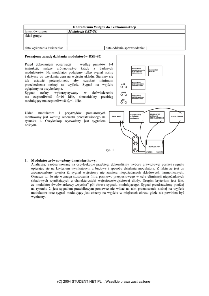 laboratorium Wstępu do Telekomunikacji Modulacja DSB-SC temat ćwiczenia: skład grupy: data wykonania ćwiczenia: data oddania sprawozdania: Poznajemy zasadę działania modulatorów DSB-SC Przed dokonaniem obserwacji według punktów 1-4 instrukcji, należy zrównoważyć każdy z badanych modulatorów. Na modulator podajemy tylko sygnał nośny i dążymy do uzyskania zera na wyjściu układu. Staramy się tak ustawić potencjometr, aby uzyskać minimum przechodzenia nośnej na wyjście. Sygnał na wyjściu oglądamy na oscyloskopie. Sygnał nośny wykorzystywany w doświadczeniu ma częstotliwość fc=10 kHz, sinusoidalny przebieg modulujący ma częstotliwość fm=1 kHz. Układ modulatora i przyrządów pomiarowych montowany jest według schematu przedstawionego na rysunku 1. Oscyloskop wyzwalany jest sygnałem nośnym. ZASILANIE MODULATOR Z PRZEŁĄCZANIEM WZMACNIENIA WZMACNIACZA +12 MODULATOR KOŁOWY MODULATOR ZRÓWNOWAŻONY 2-ĆWIARTKOWY GND -12 MODULATOR ZRÓWNOWAŻONY 4-ĆWIARTKOWY GENERATOR SYGNAŁU NOŚNEGO GENERATOR SYGNAŁU MODULUJĄCEGO OSCYLOSKOP +12 GND MODULATOR rys. 1 1. -12 wejścia wyjścia Modulator zrównoważony dwućwiartkowy. Analizując zaobserwowane na oscyloskopie przebiegi dokonaliśmy wyboru prawidłowej postaci sygnału opierając się na kryterium wynikającym z budowy i sposobu działania modulatora. Z faktu że jest on zrównoważony wynika iż sygnał wyjściowy nie zawiera niepożądanych składowych harmonicznych. Oznacza to, że nie wymaga stosowania filtru pasmowo-przepustowego w celu eliminacji niepożądanych składowych wynikających z charakterystyki wejściowo/wyjściowej diody. Drugim kryterium jest fakt, że modulator dwućwiartkowy „wycina” pół okresu sygnału modulującego. Sygnał przedstawiony poniżej na rysunku 2, jest sygnałem prawidłowym ponieważ nie widać na nim przenoszenia nośnej na wyjście modulatora oraz sygnał modulujący jest obecny na wyjściu w miejscach okresu gdzie nie powinien być wycinany. (C) 2004 STUDENT.NET.PL :: Wszelkie prawa zastrzeżone Niespełnienie warunków o których mowa powyżej widoczne jest na rysunkach 3 i 4 przedstawiających błędne przebiegi zaobserwowane przy skrajnych (lewe, prawe) położeniach potencjometru P. 2. Modulator zrównoważony czteroćwiartkowy Modulator udało się zrównoważyć do poziomu przy którym amplituda obserwowanego na wyjściu sygnału nośnego wynosiła 1 mV. Badany modulator wyposażony jest w dwa potencjometry. Potencjometr P1 (górny według orientacji na układzie elektronicznym) służy do zrównoważenia modulatora, zadaniem potencjometru P2 (dolny) jest natomiast regulacja symetrii sygnału wyjściowego. Obok sygnału prawidłowego (rys. 5) przedstawiono również przebiegi powstałe przy błędnym ustawieniu parametru amplitudy sygnału nośnego i modulującego (rys 6a – za duża amplituda sygnału nośnego z widocznymi prostokątnymi wierzchołkami fali nośnej; rys. 6b – zbyt duża amplituda sygnału modulującego). Rysunki 7a i 7b przedstawiają postać zaobserwowanego sygnału przy odpowiednio skrajnie prawym i skrajnie lewym położeniu potencjometru P1. (C) 2004 STUDENT.NET.PL :: Wszelkie prawa zastrzeżone 3. Modulator z przełączaniem wzmocnienia wzmacniacza. Dla modulatora przełączającego sygnałem nośnym był sygnał prostokątny. Stąd też w sygnale wyjściowym nośna występowała w postaci sygnału prostokątnego (oczywiście obwiednia sygnałów wyjściowych zaobserwowanych w punkcie 2 i 3 powinna być taka sama). Wniosek ten znajduje potwierdzenie w zaobserwowanych przebiegach przedstawionych na rysunkach 8 (prawidłowy) i 9 (błędny) 4. Modulator kołowy – opracowanie teoretyczne. Budowę modulatora pierścieniowego przedstawiono na rysunku 10. Składa się on z 4 spolaryzowanych w tym samym kierunku diod tworzących pierścień. Są one sterowane za pomocą prostokątnej fali nośnej (c(t) o częstotliwości fc). W warunkach idealnego zrównoważenia i gdy wszystkie diody są identyczne na wyjściu modulatora nie pojawia się sygnał o częstotliwości modulacji. Zakładamy sinusoidalną falę rys. 10 modulującą m(t) oraz prostokątną falę nośną c(t). 4 ∞ (− 1) c(t ) = ¦ cos[2πf c t (2n − 1)] π n =1 2n − 1 n −1 Rozwinięcie w szereg Fouriera sygnału c(t) ma postać: (C) 2004 STUDENT.NET.PL :: Wszelkie prawa zastrzeżone Na wyjściu modulatora pojawia się więc sygnał: 4 ∞ (− 1) s (t ) = c(t )m(t ) = ¦ cos[2πf c t (2n − 1)]m(t ) π n=1 2n − 1 n −1 Widać stąd, ze sygnał wyjściowy zawiera wyłącznie produkty modulacji – rys 11 (nie występuje składowa o częstotliwości fali nośnej). Modulator pierścieniowy bywa nazywany modulatorem podwójnie zrównoważonym, jest on bowiem zrównoważony zarówno jeśli chodzi o sygnał modulujący, jak i prostokątną falę nośną. Widmo sygnału wyjściowego modulatora ma wstęgi boczne wokół każdej z nieparzystych harmonicznych prostokątnej fali nośnej (rys 12). Jeśli spełniona jest nierówność fc>W, można zastosować filtr środkowoprzepustowy o częstotliwości środkowej fc i paśmie przepustowym o szerokości 2 W, w celu wydzielenia pożądanej pary wstęg bocznych położonych wokół częstotliwości nośnej fc. Układ wymagany dla generowania fali zmodulowanej w systemie DSB-SC składa się z modulatora pierścieniowego oraz następującego po nim filtru środkowoprzepustowego. rys. 11 rys. 12 Wnioski Poczynione podczas przeprowadzania doświadczenia obserwacje oraz ich porównanie z opracowaniem teoretycznym przekonują iż najlepszym sposobem otrzymania sygnału DSB-SC jest zastosowanie modulatora zrównoważonego czteroćwiartkowego. Przemawia za tym fakt, ze przy jego zastosowaniu otrzymujemy sygnał zmodulowany w którym wstęgi boczne występują tylko wokół podstawowej harmonicznej. W związku z tym moc nie jest rozpraszana na pozostałe składowe harmoniczne. Dobrą ilustracją znaczenia tego faktu jest załączni