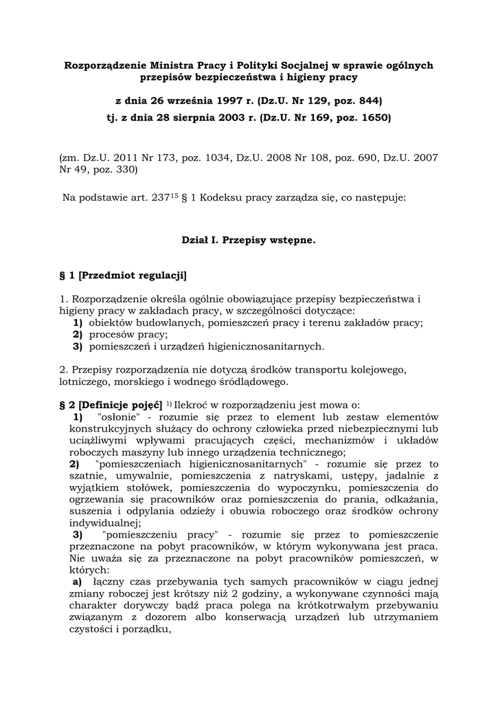 Rozporządzenie Ministra Pracy i Polityki Socjalnej w sprawie ogólnych przepisów bezpieczeństwa i higieny pracy z dnia 26 września 1997 r. (Dz.U. Nr 129, poz. 844) tj. z dnia 28 sierpnia 2003 r. (Dz.U. Nr 169, poz. 1650) (zm. Dz.U. 2011 Nr 173, poz. 1034, Dz.U. 2008 Nr 108, poz. 690, Dz.U. 2007 Nr 49, poz. 330) Na podstawie art. 23715 § 1 Kodeksu pracy zarządza się, co następuje: Dział I. Przepisy wstępne. § 1 [Przedmiot regulacji] 1. Rozporządzenie określa ogólnie obowiązujące przepisy bezpieczeństwa i higieny pracy w zakładach pracy, w szczególności dotyczące: 1) obiektów budowlanych, pomieszczeń pracy i terenu zakładów pracy; 2) procesów pracy; 3) pomieszczeń i urządzeń higienicznosanitarnych. 2. Przepisy rozporządzenia nie dotyczą środków transportu kolejowego, lotniczego, morskiego i wodnego śródlądowego. § 2 [Definicje pojęć] 1) Ilekroć w rozporządzeniu jest mowa o: 1) "osłonie" - rozumie się przez to element lub zestaw elementów konstrukcyjnych służący do ochrony człowieka przed niebezpiecznymi lub uciążliwymi wpływami pracujących części, mechanizmów i układów roboczych maszyny lub innego urządzenia technicznego; 2) "pomieszczeniach higienicznosanitarnych" - rozumie się przez to szatnie, umywalnie, pomieszczenia z natryskami, ustępy, jadalnie z wyjątkiem stołówek, pomieszczenia do wypoczynku, pomieszczenia do ogrzewania się pracowników oraz pomieszczenia do prania, odkażania, suszenia i odpylania odzieży i obuwia roboczego oraz środków ochrony indywidualnej; 3) "pomieszczeniu pracy" - rozumie się przez to pomieszczenie przeznaczone na pobyt pracowników, w którym wykonywana jest praca. Nie uważa się za przeznaczone na pobyt pracowników pomieszczeń, w których: a) łączny czas przebywania tych samych pracowników w ciągu jednej zmiany roboczej jest krótszy niż 2 godziny, a wykonywane czynności mają charakter dorywczy bądź praca polega na krótkotrwałym przebywaniu związanym z dozorem albo konserwacją urządzeń lub utrzymaniem czystości i porządku, b) mają miejsce procesy technologiczne niepozwalające na zapewnienie odpowiednich warunków przebywania pracowników w celu ich obsługi, bez zastosowania środków ochrony indywidualnej i zachowania specjalnego reżimu organizacji pracy, c) jest prowadzona hodowla roślin lub zwierząt, niezależnie od czasu przebywania w nich pracowników zajmujących się obsługą; 4) "pomieszczeniu stałej pracy" - rozumie się przez to pomieszczenie pracy, w którym łączny czas przebywania tego samego pracownika w ciągu jednej doby przekracza 4 godziny; 5) "pomieszczeniu czasowej pracy" - rozumie się przez to pomieszczenie pracy, w którym łączny czas przebywania tego samego pracownika w ciągu jednej doby trwa od 2 do 4 godzin; 6) "przepisach techniczno-budowlanych" - rozumie się przez to przepisy ustawy - Prawo budowlane oraz aktów wykonawczych do tej ustawy; 7) "ryzyku zawodowym" - rozumie się przez to prawdopodobieństwo wystąpienia niepożądanych zdarzeń związanych z wykonywaną pracą, powodujących straty, w szczególności wystąpienia u pracowników niekorzystnych skutków zdrowotnych w wyniku zagrożeń zawodowych występujących w środowisku pracy lub sposobu wykonywania pracy; 7a) "terenie zakładu pracy" - rozumie się przez to przestrzeń wraz z obiektami budowlanymi, będącą w dyspozycji pracodawcy, w której pracodawca organizuje miejsca pracy; 7b) "miejscu pracy" - rozumie się przez to miejsce wyznaczone przez pracodawcę, do którego pracownik ma dostęp w związku z wykonywaniem pracy; 8) "stanowisku pracy" - rozumie się przez to przestrzeń pracy, wraz z wyposażeniem w środki i przedmioty pracy, w której pracownik lub zespół pracowników wykonuje pracę; 9) "środkach ochrony indywidualnej" - rozumie się przez to wszelkie środki noszone lub trzymane przez pracownika w celu jego ochrony przed jednym lub większą liczbą zagrożeń związanych z występowaniem niebezpiecznych lub szkodliwych czynników w środowisku pracy, w tym również wszelkie akcesoria i dodatki przeznaczone do tego celu. Do środków ochrony indywidualnej nie zalicza się: - zwykłej odzieży roboczej i mundurów, które nie są specjalnie przeznaczone do zapewnienia bezpieczeństwa i ochrony zdrowia pracownika, - środków ochrony indywidualnej używanych przez wojsko, Policję i inne służby utrzymania porządku publicznego, - wyposażenia stosowanego przez służby pierwszej pomocy i ratownicze, - środków ochrony indywidualnej stosowanych na podstawie przepisów Prawa o ruchu drogowym, - wyposażenia sportowego, - środków służących do samoobrony lub do odstraszania, - przenośnych urządzeń do wykrywania oraz sygnalizowania zagrożeń i naruszania porządku publicznego; 10) "środkach ochrony zbiorowej" - rozumie się przez to środki przeznaczone do jednoczesnej ochrony grupy ludzi, w tym i pojedynczych osób, przed niebezpiecznymi i szkodliwymi czynnikami występującymi pojedynczo lub łącznie w środowisku pracy, będące rozwiązaniami technicznymi stosowanymi w pomieszczeniach pracy, maszynach i innych urządzeniach; 11) "środowisku pracy" - rozumie się przez to warunki środowiska materialnego (określonego czynnikami fizycznymi, chemicznymi i biologicznymi), w którym odbywa się proces pracy; 12) "urządzeniach ochronnych" - rozumie się przez to osłony lub takie urządzenia, które spełniają jedną lub więcej z niżej wymienionych funkcji: - zapobiegają dostępowi do stref niebezpiecznych, powstrzymują ruchy elementów niebezpiecznych, zanim pracownik znajdzie się w strefie niebezpiecznej, - nie pozwalają na włączenie ruchu elementów niebezpiecznych, jeśli pracownik znajduje się w strefie niebezpiecznej, - zapobiegają naruszeniu normalnych warunków pracy maszyn i innych urządzeń technicznych, - nie pozwalają na uaktywnienie innych czynników niebezpiecznych lub szkodliwych; 13) "zagrożeniu" - rozumie 