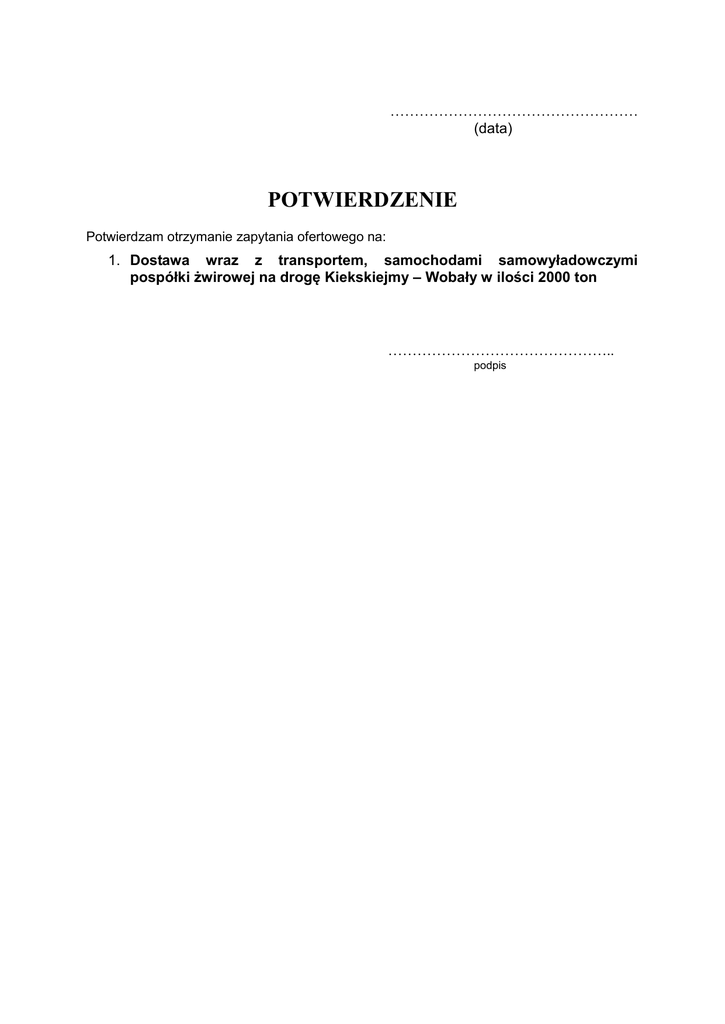 …………………………………………… (data) POTWIERDZENIE Potwierdzam otrzymanie zapytania ofertowego na: 1. Dostawa wraz z transportem, samochodami samowyładowczymi pospółki żwirowej na drogę Kiekskiejmy – Wobały w ilości 2000 ton ……………………………………….. podpis