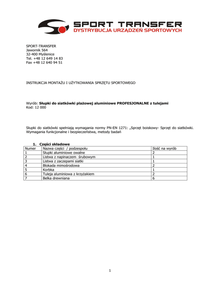 SPORT-TRANSFER Jawornik 564 32-400 Myślenice Tel. +48 12 649 14 83 Fax +48 12 640 94 51 INSTRUKCJA MONTAŻU I UŻYTKOWANIA SPRZĘTU SPORTOWEGO Wyrób: Słupki do siatkówki plażowej aluminiowe PROFESJONALNE z tulejami Kod: 12 000 Słupki do siatkówki spełniają wymagania normy PN-EN 1271: „Sprzęt boiskowy- Sprzęt do siatkówki. Wymagania funkcjonalne i bezpieczeństwa, metody badań 1. Części składowe Numer Nazwa części / podzespołu 1 Słupki aluminiowe owalne 2 Listwa z napinaczem śrubowym 3 Listwa z zaczepami siatki 4 Blokada mimośrodowa 5 Korbka 6 Tuleja aluminiowa z krzyżakiem 7 Belka drewniana Ilość na wyrób 2 1 1 2 1 2 6 1 2 2. Montaż słupków do siatkówki - W podłożu w przygotowanych otworach osadzić tuleje (6) pod kątem ~2° odchylenia od pionu w kierunku na zewnątrz pola gry, w rozstawie osiowym 10 m (dopuszcza się rozstawy osiowe od 9 do 11 m). Tuleje ustawiamy tak, aby wewnętrzna belka drewniana znajdowała się symetrycznie w osi boiska i w kierunku boiska. - Górna krawędź tulei ma się znajdować około 50mm ponad poziomem piasku. Przed zasypaniem tulei (6) zalecą się dodatkowe dociążenie belek (7) workami z piaskiem. 3 3. Mocowanie siatki - - - Linkę nośną z siatki zawieszamy na górnym zaczepie (8) listwy w szynie zaczepowej. Drugi koniec linki nośnej zaczepiamy o karabińczyk znajdujący się przy listwie z napinaczem śrubowym (9) Kręcąc korbką (6) nałożoną na przegub znajdujący się na dole śruby napinającej naprężamy linkę nośną siatki. W prawidłowo naprężonej siatce wysokość jej górnej krawędzi mierzona na środku nie może być niższa niż 1 cm w stosunku do wysokości mierzonej nad liniami bocznymi boiska. Po naprężeniu linki nośnej naciągamy siatkę za pomocą sznurków naprężających przywiązując je do zaczepów (10) znajdujących się na listwach obu szyn tak, aby siatka ułożyła się symetrycznie względnie osi wzdłużnej boiska. Wysokości zawieszania siatki w metrach: 2,43 dla mężczyzn; 2,24 dla kobiet; 2,35 dla juniorzy „m”.; 2,20 dla juniorzy „k”; 1,55 – badminton. 4. Użytkowanie słupków a) Słupki aluminiowe do siatkówki plażowej przeznaczone są do gry w piłkę siatkową i badminton. b) Słupki w tulejach (6) ustawiamy tak, żeby elementy służące do zawieszenia siatki skierowane były do boiska. c) Słupki posiadają płynną regulację wysokości siatki. W celu ustawienia żądanej wysokości odblokowujemy mimośród (4) przekręcając rączkę do góry i przesuwamy listwę napinającą (2) / zaczepową (3) na wybraną wysokość. Następnie dociskając rączkę mimośrodu (4) w dół blokujemy listwy na wybranej wysokości. Uwaga: regulację wysokości zawieszenia siatki wykonywać bez napiętej siatki d) Po ustawieniu wysokości naciągnąć siatkę zgodnie z instrukcja powyżej. e) Każdorazowo po zakończeniu gry poluzować naciąg linki nośnej siatki. UWAGA: Nie wolno wspinać się i wieszać na żadnych elementach słupków oraz siatki, nie odblokowywać mimośrodu w trakcie gry lub przy napiętej siatce. Dla dodatkowego bezpieczeństwa stosować osłony słupków Art. Nr 11 004. 4