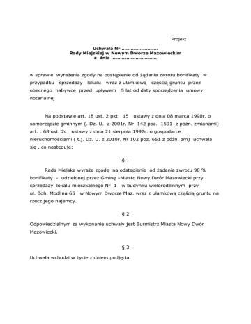 Projekt Uchwała Nr ........................ Rady Miejskiej w Nowym Dworze Mazowieckim z dnia .............................. w sprawie wyrażenia zgody na odstąpienie od żądania zwrotu bonifikaty w przypadku sprzedaży lokalu wraz z ułamkową obecnego nabywcę przed upływem częścią gruntu przez 5 lat od daty sporządzenia umowy notarialnej Na podstawie art. 18 ust. 2 pkt 15 ustawy z dnia 08 marca 1990r. o samorządzie gminnym (. Dz. U. z 2001r. Nr 142 poz. 1591 z późn. zmianami) art. . 68 ust. 2c ustawy z dnia 21 sierpnia 1997r. o gospodarce nieruchomościami ( t.j. Dz. U. z 2010r. Nr 102 poz. 651 z późn. zm) uchwala się , co następuje: §1 Rada Miejska wyraża zgodę na odstąpienie od żądania zwrotu 90 % bonifikaty - udzielonej przez Gminę –Miasto Nowy Dwór Mazowiecki przy sprzedaży lokalu mieszkalnego Nr 1 ul. Boh. Modlina 65 w budynku wielorodzinnym przy w Nowym Dworze Maz. wraz z ułamkową częścią gruntu na rzecz jego najemcy. §2 Odpowiedzialnym za wykonanie uchwały jest Burmistrz Miasta Nowy Dwór Mazowiecki. §3 Uchwała wchodzi w życie z dniem podjęcia. Uzasadnienie do Uchwały Nr ……………………………………… Rady Miejskiej w Nowym Dworze Mazowieckim z dnia ………………………….w sprawie wyrażenia zgody na odstąpienie od żądania zwrotu bonifikaty, udzielonej przy sprzedaży lokalu mieszkalnego nr 1 w budynku wielorodzinnym nr 65 przy ulicy Boh. Modlina w Nowym Dworze Mazowieckim wraz z ułamkową częścią gruntu na rzecz najemcy przedmiotowego lokalu. Na podstawie umowy o ustanowieniu odrębnej własności lokalu i sprzedaży, spisanej w formie aktu notarialnego Rep. A nr 6331/2009 z dnia 30.09.2009 roku Gmina Miasto Nowy Dwór Mazowiecki sprzedała na rzecz Państwa Lilianny i Rudolfa Ner lokal mieszkalny nr 1 w budynku nr 65 przy ulicy Boh. Modlina w Nowym Dworze Mazowieckim wraz z pomieszczeniem przynależnym (piwnicą), udziałem w rzeczy wspólnej oraz ułamkową częścią gruntu. Wartość sprzedaży przedmiotowego lokalu wraz z ułamkową częścią gruntu ustalono na podstawie operatu szacunkowego rzeczoznawcy majątkowego. Stosownie do Uchwały Rady Miejskiej w Nowym Dworze Mazowieckim z dnia 30 maja 2005 r. Nr XXXIII/339/05, zmienionej dnia 29 września 2005 r. Uchwałą Nr XXXIX/373/05 w sprawie zasad zbycia zasiedlonych lokali mieszkalnych na rzecz najemców tych lokali - „Sprzedawca” tj. Gmina Miasto Nowy Dwór Mazowiecki udzieliła 90% bonifikaty w łącznej kwocie 130.100,40 zł w tym: 123.180,30 zł od ceny sprzedaży lokalu mieszkalnego i 6.920,10 zł od ceny sprzedaży ułamkowej części gruntu. Kwota bonifikaty po jej waloryzacji podlega zwrotowi zgodnie z art. 68 ust. 2 ustawy z dnia 21 sierpnia 1997 r. gdy nabywca przed upływem 5 lat licząc od dnia sporządzenia aktu notarialnego; wykorzysta lokal na inne cele niż mieszkaniowe lub zbędzie lokal na rzecz innej osoby z wyłączeniem osób bliskich. W dniu 21.11.2012 roku Państwo NER wystąpili z wnioskiem o zwolnienie ich z obowiązku zwrotu kwoty równej udzielonej bonifikacie uzyskanej z planowanej sprzedaży lokalu mieszkalnego. Prośbę swą uzasadniają tym, iż zamierzają sprzedać lokal i zmienić miejsce zamieszkania z uwagi na sytuację rodzinną. Chcą zamieszkać u syna w Przemyślu. Środki uzyskane ze sprzedaży chcą przekazać synowi w zamian za umożliwienie urządzenia się w jego domu i opiekę, której wymagają z uwagi na swój wiek. Art. 68 ust. 2 c dodany do ustawy z dnia 21 sierpnia 1009 7 r. o gospodarce nieruchomościami (Dz. U. z 2004 r. nr 261, poz. 2603 ) ustawą z dnia 24 sierpnia 1997 r. (Dz. U. z 2007 r. Nr 173, poz. 1218) umożliwia radzie wyrażenie zgody na odstąpienie od żądania zwrotu udzielonej bonifikaty. Okoliczności rozpatrywanego przypadku pozwalają sądzić, że odstąpienie od żądania zwrotu bonifikaty jest uzasadnione.