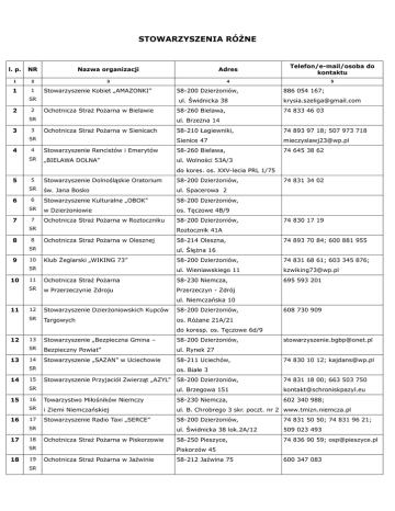 STOWARZYSZENIA RÓŻNE NR Nazwa organizacji Adres Telefon/e-mail/osoba do kontaktu 1 2 3 4 5 1 1 l. p. Stowarzyszenie Kobiet „AMAZONKI” SR 2 2 ul. Świdnicka 38 Ochotnicza Straż Pożarna w Bielawie SR 3 3 4 SR 58-260 Bielawa, 886 054 167; [email protected] 74 833 46 03 ul. Brzeżna 14 Ochotnicza Straż Pożarna w Sienicach 58-210 Łagiewniki, 74 893 97 18; 507 973 718 Sienice 47 [email protected] Stowarzyszenie Rencistów i Emerytów 58-260 Bielawa, 74 645 38 62 „BIELAWA DOLNA” ul. Wolności 53A/3 SR 4 58-200 Dzierżoniów, do kores. os. XXV-lecia PRL 1/75 5 5 SR 6 6 SR 7 7 Stowarzyszenie Dolnośląskie Oratorium 58-200 Dzierżoniów, św. Jana Bosko ul. Spacerowa 2 Stowarzyszenie Kulturalne „OBOK” 58-200 Dzierżoniów, w Dzierżoniowie os. Tęczowe 4B/9 Ochotnicza Straż Pożarna w Roztoczniku 58-200 Dzierżoniów, SR 8 8 10 Ochotnicza Straż Pożarna w Olesznej 58-214 Oleszna, 74 893 70 84; 600 881 955 ul. Ślężna 16 Klub Żeglarski „WIKING 73” SR 10 74 830 17 19 Roztocznik 41A SR 9 74 831 34 02 58-200 Dzierżoniów, 74 831 68 61; 603 345 876; ul. Wieniawskiego 11 [email protected] 695 593 201 11 Ochotnicza Straż Pożarna 58-230 Niemcza, SR w Przerzeczynie Zdroju Przerzeczyn - Zdrój ul. Niemczańska 10 11 12 Stowarzyszenie Dzierżoniowskich Kupców 58-200 Dzierżoniów, SR Targowych os. Różane 21A/21 608 730 909 do koresp. os. Tęczowe 6d/9 12 13 13 Stowarzyszenie „Bezpieczna Gmina – 58-200 Dzierżoniów, SR Bezpieczny Powiat” ul. Rynek 27 14 Stowarzyszenie „SAZAN” w Uciechowie 58-211 Uciechów, SR 14 15 16 Stowarzyszenie Przyjaciół Zwierząt „AZYL” 58-200 Dzierżoniów, ul. Brzegowa 151 [email protected] 602 340 988; Towarzystwo Miłośników Niemczy 58-230 Niemcza, SR i Ziemi Niemczańskiej ul. B. Chrobrego 3 skr. poczt. nr 2 www.tmizn.niemcza.pl 17 Stowarzyszenie Radio Taxi „SERCE” 58-200 Dzierżoniów, 74 831 50 50; 74 831 96 21; ul. Świdnicka 38 lok.2A/12 509 023 493 58-250 Pieszyce, 74 836 90 59; [email protected] 18 Ochotnicza Straż Pożarna w Piskorzowie SR 18 74 831 18 00; 663 503 750 16 SR 17 74 830 10 12; [email protected] os. Białe 3 SR 15 [email protected] 19 SR Piskorzów 45 Ochotnicza Straż Pożarna w Jaźwinie 58-212 Jaźwina 75 600 347 083 19 20 20 Stowarzyszenie Klubu Abstynenta 58-200 Dzierżoniów, SR „Na Pawłowym Wzgórzu” Wzgórze Ojca Św. Jana Pawła II 1 [email protected] 21 Towarzystwo Przyjaciół Bielawy 58-260 Bielawa, SR 21 22 23 Ochotnicza Straż Pożarna w Gilowie 24 Ochotnicza Straż Pożarna w Łagiewnikach 26 27 28 29 32 35 36 0698 207 75; [email protected] 74 821 5252; 74831 80 00 Dzierżoniowskich „Radio Taxi BIS” ul. Strumykowa 1 25 Ochotnicza Straż Pożarna w Niemczy 58-230 Niemcza, 6633 060 713; ul. Ogrodowa 1 [email protected] 74 893 76 36; 660 021 218 26 Ochotnicza Straż Pożarna w Ligocie 58-210 Łagiewniki, SR Wielkiej Ligota Wielka 56B 27 Stowarzyszenie Sudecka Agencja 58-260 Bielawa, SR Artystyczna „SART” ul. Piastowska 18 28 Stowarzyszenie Wędkarskie „SUDETY” 58-260 Bielawa, SR w Bielawie ul. Wysoka 1 29 Towarzystwo Turystyczno-Narciarskie 58-200 Dzierżoniów, SR „POTOCZEK” os. Różane 3B/12 31 Towarzystwo Miłośników Dzierżoniowa 58-200 Dzierżoniów, 74 645 16 46; 698 249 839; ul. Świdnicka 30 [email protected] 58-200 Dzierżoniów, 74 645 66 67 32 Stowarzyszenie „Nasz Krzyż” 33 Stowarzyszenie Obrony Bezrobotnych 58-200 Dzierżoniów, SR „GODNOŚĆ” ul. Piastowska 1 35 Stowarzyszenie Dzierżoniów XXI Wiek 58-200 Dzierżoniów, 36 74 834 44 45 74 833 68 96 74 831 71 78 ul. Nowa 1C/7 509 944 391; 518 037 740 ul. Kościelna 4 Związek Harcerstwa Wiejskiego SR 34 ul. Lipowa 4 58-200 Dzierżoniów, SR 33 74 893 94 97; 74 893 90 62; Stowarzyszenie Taksówkarzy SR 31 58-210 Łagiewniki, SR SR 30 [email protected] 24 SR 25 58-230 Niemcza, Gilów 43 SR 23 74 646 53 10 os. Włókniarzy 10 SR 22 74 832 36 18; 669 094 250; 58-200 Dzierżoniów, 74 831 67 73; 603 165 585 ul. Rynek 36 37 Stowarzyszenie Na Rzecz Rozwoju 58-200 Dzierżoniów, 74 831 24 20; SR i Integracji „UŚMIECH” ul. Miernicza 2 [email protected] 38 Stowarzyszenie Klub Abstynenta 58-200 Dzierżoniów, 504 439 720 SR „KALENICA” ul. Rynek 36 [email protected] 39 Klub Osób Niewidomych, 58-230 Niemcza, 74 837 61 27 SR Niepełnosprawnych, Emerytów ul. Rynek 14 i Rencistów „RADOŚĆ” w Niemczy 37 38 40 Stowarzyszenie Społeczno - Kulturalne SR 58-262 Owiesno 96 74 831 90 47, 606 120 090 „Za Miastem” 41 Ochotnicza Straż Pożarna w Tuszynie 58-203 Tuszyn 74 830 28 77 42 Stowarzyszenie „LEPSZE JUTRO” 58-250 Pieszyce, 74 836 52 23; 74 836 52 23 SR w Pieszycach [email protected] SR 39 ul. Ogrodowa 81 [email protected] 40 43 Stowarzyszenie „EDUKACJA I RODZINA” SR 41 42 43 44 45 58-200 Dzierżoniów, 692 526 913; ul. Wrocławska 51 [email protected] 44 Towarzystwo Miast Partnerskich 58-200 Dzierżoniów, 600 554 605; 74 831 49 55; SR Dzierżoniowskich ul. Bat. Chłopskich 19 [email protected] 45 Stowarzyszenie „Partnerstwo na Rzecz 58-240 Piława Górna, 504 250 522 SR Piławy” ul. Zielona 9 46 Stowarzyszenie „Obywatelski Blok 58-200 Dzierżoniów, 74 645 68 86; 515 190 836; SR Samorządowy” ul. Rynek 47 [email protected] 47 Stowarzyszenie Tekstylne Ziemi 58-260 Bielawa, SR Dzierżoniowskiej ul. Waryńskiego 15A 48 Stowarzyszenie na Rzecz Remontu 58-200 Dzierżoniów, 602 752 509; SR i Renowacji Zabytkowego Kościoła ul. Miodowa 3 [email protected] p.w. św. Jerzego 46 47 48 49 50 50 Stowarzyszenie Pomocy Honorowym 58-200 Dzierżoniów, 667 113 201; fax 74 832 22 92 SR Dawcom Krwi ul. Ząbkowicka 55 [email protected] 52 Sudeckie Towarzystwo Opieki nad 58-200 Dzierżoniów, SR Zwierzętami os. Różane 22A/6 53 Stowarzyszenie Taksówkarzy 58-260 Bielawa, 74 833 35 55; 607 209 685; SR „TELE TAXI” w Bielawie ul. Kopernika 7 609 525 237 54 Towarzystwo Oświatowe Ziemi 58-200 Dzierżoniów, 605 205 310; 600 822 729; SR Dzierżoniowskiej ul. Świdnicka 38 [email protected] 55 