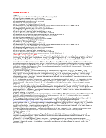 HAŃBA KACZYŃSKICH ZRÓDŁA http://www.jaroslawwielki.pl/zyciorys-i-biografia-jaroslawa-kaczynskiego.html http://lists.ceti.pl/pipermail/wiec/20071215/012603.html http://info.wyborcza.pl/temat/wyborcza/Rajmund+Kaczy%C5%84ski http://wiadomosci.gazeta.pl/kraj/1,34309,2976182.html http://www.skubi.net/glosuj-na-polske.pdf http://pl.wikipedia.org/wiki/Rajmund_Kaczy%C5%84ski http://www.wprost.pl/ar/200324/Sakiewicz-zawieszony-w-Trojce-do-konca-kampanii/?O=200324&K=1&KI=309533 http://pl.wikipedia.org/wiki/Jaros%C5%82aw_Kaczy%C5%84ski http://www.spieprzajdziadu.com/2008/12/07/dwa-zyciorysy-chronologia/ http://niss26an50.wordpress.com/tag/rajmund-kaczynski/ http://forum.mycork.org/index.php?action=printpage;topic=37545.0 http://lavira.pl/internauci?sid=15595635&cid=15595635&cinf=1080089 http://www.polityka.org.pl/index.php?option=com_content&task=view&id=122&Itemid=48 http://www.jaroslawwielki.pl/zyciorys-i-biografia-jaroslawa-kaczynskiego.html http://lists.ceti.pl/pipermail/wiec/20071215/012603.html http://info.wyborcza.pl/temat/wyborcza/Rajmund+Kaczy%C5%84ski http://wiadomosci.gazeta.pl/kraj/1,34309,2976182.html http://www.skubi.net/glosuj-na-polske.pdf http://pl.wikipedia.org/wiki/Rajmund_Kaczy%C5%84ski http://www.wprost.pl/ar/200324/Sakiewicz-zawieszony-w-Trojce-do-konca-kampanii/?O=200324&K=1&KI=309533 http://pl.wikipedia.org/wiki/Jaros%C5%82aw_Kaczy%C5%84ski http://www.spieprzajdziadu.com/2008/12/07/dwa-zyciorysy-chronologia/ http://niss26an50.wordpress.com/tag/rajmund-kaczynski/ http://forum.mycork.org/index.php?action=printpage;topic=37545.0 http://lavira.pl/internauci?sid=15595635&cid=15595635&cinf=1080089 http://www.polityka.org.pl/index.php?option=com_content&task=view&id=122&Itemid=48 JAROSŁAW KACZYŃ SKI -ZYCIORYS Jarosław Aleksander Kaczyński (ur. 18 czerwca 1949 w Warszawie) – polski polityk, doktor nauk prawnych, twórca i prezes partii politycznych Porozumienie Centrum oraz Prawo i Sprawiedliwość, senator I kadencji, poseł na Sejm I, III, IV, V, VI i VII kadencji. Od 14 lipca 2006 do 16 listopada 2007 prezes Rady Ministrów. Kandydat na urząd Prezydenta RP w przedterminowych wyborach prezydenckich w 2010. Jarosław Kaczyński urodził się w Warszawie na Żoliborzu. Ojciec, Rajmund Kaczyński, z zawodu inżynier, był żołnierzem Armii Krajowej i uczestnikiem powstania warszawskiego. Matka, Jadwiga z domu Jasiewicz, z wykształcenia jest filologiem polskim (zawodowo związana z IBL PAN).Jego bratem bliźniakiem był Lech Kaczyński. Przy ich porodzie asystowała jako położna matka poety Tadeusza Gajcego[1]. W 1962 bracia zagrali role Jacka (Lech Kaczyński) i Placka (Jarosław Kaczyński) w ekranizacji powieści Kornela Makuszyńskiego O dwóch takich, co ukradli księżyc w reżyserii Jana Batorego[2]. Wykształcenie i działalność zawodowa Uczęszczał początkowo do XLI Liceum Ogólnokształcącego im. Joachima Lelewela w Warszawie, ukończył w 1967 XXXIII Liceum Ogólnokształcące im. Mikołaja Kopernika w tym mieście. Studiował na Uniwersytecie Warszawskim. W 1968 był wśród studentów biorących udział w wiecach organizowanych w ramach tzw. wydarzeń marcowych[3]. W 1971 na Wydziale Prawa i Administracji UW uzyskał tytuł magistra. Na tym samym roku studiowali z nim m.in. jego brat Lech, Andrzej Rzepliński, Marek Safjan, Bogusław Wołoszański i Mirosław Wyrzykowski. 8 grudnia 1976 na WPiA UW obronił pracę doktorską zatytułowaną Rola ciał kolegialnych w kierowaniu szkołą wyższą. Jego promotorem był Stanisław Ehrlich[4]. W 1971 uzyskał miejsce na aplikacji prokuratorskiej w Warszawie, której jednak nie rozpoczął[5]. W latach 1971–1976 zatrudniony był jako pracownik naukowy w Instytucie Polityki Naukowej i Szkolnictwa Wyższego. Później, do 1981, pracował jako adiunkt na Uniwersytecie Warszawskim w filii w Białymstoku. W latach 1982–1983 był zatrudniony w Bibliotece Uniwersyteckiej w Warszawie na etacie starszego bibliotekarza. W 1990 był współzałożycielem Fundacji Prasowej "Solidarność". W tym samym roku wszedł (obok m.in. Lecha Kaczyńskiego, Macieja Zalewskiego, Andrzeja Urbańskiego i Krzysztofa Czabańskiego) w skład władz spółki akcyjnej "Telegraf", po czym w 1991 zbył akcje tej spółki na rzecz Macieja Zalewskiego[6]. W 1993 prokurator przedstawił mu zarzut rzekomego nielegalnego finansowania Porozumienia Centrum przez Fundację Prasową "Solidarność". Sprawa została ostatecznie umorzona w 2000[7]. W latach 1994–1997 Jarosław Kaczyński kierował działem wydawniczym w spółce z o.o. "Srebrna". Działalność polityczna w PRL[edytuj] W 1976, po tzw. wydarzeniach czerwcowych, rozpoczął współpracę z Komitetem Obrony Robotników, następnie z Biurem Interwencyjnym KSS KOR, gdzie badał m.in. przypadki zabójstw dokonanych przez funkcjonariuszy MO i SB. Od 1979 należał do redakcji kierowanego przez Antoniego Macierewicza niezależnego miesięcznika "Głos"[3]. W 1980 zaangażował się w działalność "Solidarności", kierował sekcją prawną Ośrodka Badań Społecznych przy Regionie Mazowsze[3]. W 1981 podpisał deklarację założycielską Klubów Służby Niepodległości[3], które nie podjęły jakiejkolwiek działalności. W stanie wojennym nie był na liście do internowania i nie został internowany. Zajmował się dystrybucją wydawnictw podziemnych, brał udział w reaktywowaniu "Głosu". W 1982 nawiązał współpracę z Komitetem Helsińskim, rok później z niejawnymi władzami NSZZ "S", Tymczasową Komisją Koordynacyjną, od 1986 kierował biurem społeczno-politycznym TKK, a od 1987 był sekretarzem jawnej Krajowej Komisji Wykonawczej. Uczestniczył w pracach, działającego legalnie od sierpnia 1988, Klubu Myśli Politycznej "Dziekania"[8]. W trakcie strajków w 1988 doradzał pracownikom ze Stoczni Gdańskiej im. Lenina[3]. W obradach Okrągłego Stołu uczestniczył w zespole ds. reform politycznych. W lipcu i sierpniu 1989 był w zespole negocjacyjnym ze strony NSZZ "S"