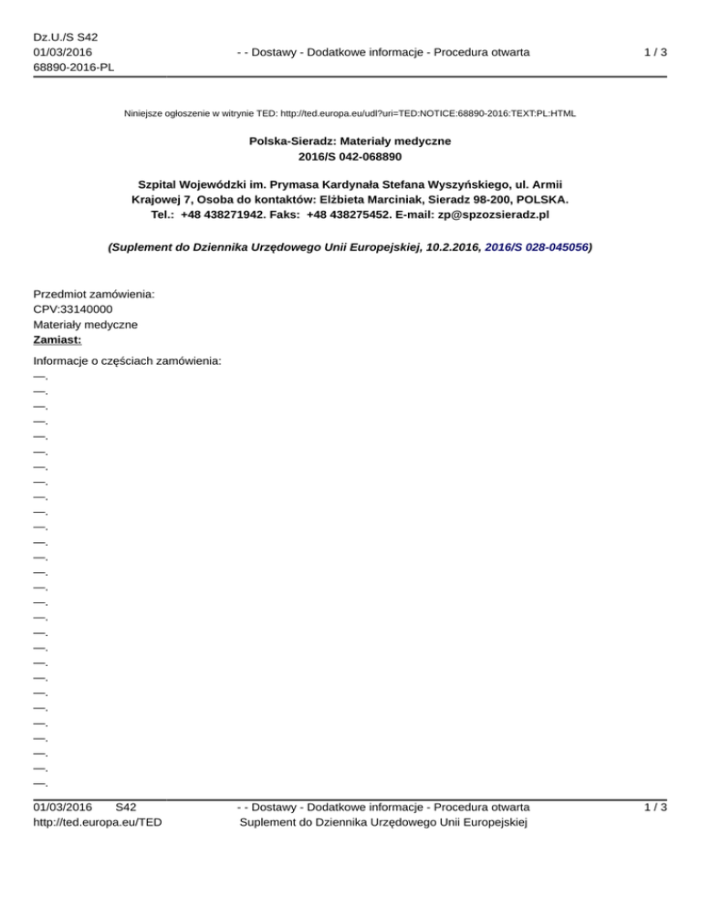 Dz.U./S S42 01/03/2016 68890-2016-PL - - Dostawy - Dodatkowe informacje - Procedura otwarta 1/3 Niniejsze ogłoszenie w witrynie TED: http://ted.europa.eu/udl?uri=TED:NOTICE:68890-2016:TEXT:PL:HTML Polska-Sieradz: Materiały medyczne 2016/S 042-068890 Szpital Wojewódzki im. Prymasa Kardynała Stefana Wyszyńskiego, ul. Armii Krajowej 7, Osoba do kontaktów: Elżbieta Marciniak, Sieradz 98-200, POLSKA. Tel.: +48 438271942. Faks: +48 438275452. E-mail: [email protected] (Suplement do Dziennika Urzędowego Unii Europejskiej, 10.2.2016, 2016/S 028-045056) Przedmiot zamówienia: CPV:33140000 Materiały medyczne Zamiast: Informacje o częściach zamówienia: —. —. —. —. —. —. —. —. —. —. —. —. —. —. —. —. —. —. —. —. —. —. —. —. —. —. —. —. 01/03/2016 S42 http://ted.europa.eu/TED - - Dostawy - Dodatkowe informacje - Procedura otwarta Suplement do Dziennika Urzędowego Unii Europejskiej 1/3 Dz.U./S S42 01/03/2016 68890-2016-PL - - Dostawy - Dodatkowe informacje - Procedura otwarta 2/3 —. —. —. —. —. —. —. —. —. —. —. —. —. —. —. —. —. Powinno być: Informacje o częściach zamówienia: Część nr: 73 Nazwa: Dostawa sprzętu medycznego jednorazowego użytku 1) Krótki opis Dostawa sprzętu medycznego jednorazowego użytku. 2) Wspólny Słownik Zamówień (CPV) 33140000 3) Wielkość lub zakres 4) Informacje o różnych datach dotyczących czasu trwania lub rozpoczęcia/realizacji zamówienia 5) Informacje dodatkowe na temat części zamówienia Kryterium oceny: 80 % cena, 15 % walory użytkowe, 5 % termin dostawy. Część nr: 74 Nazwa: Dostawa sprzętu medycznego jednorazowego użytku 1) Krótki opis Dostawa sprzętu medycznego jednorazowego użytku. 2) Wspólny Słownik Zamówień (CPV) 33140000 3) Wielkość lub zakres 4) Informacje o różnych datach dotyczących czasu trwania lub rozpoczęcia/realizacji zamówienia 5) Informacje dodatkowe na temat części zamówienia Kryterium oceny: 95 % cena, 5 % termin dostawy. Część nr: 75 Nazwa: Dostawa sprzętu medycznego jednorazowego użytku 1) Krótki opis Dostawa sprzętu medycznego jednorazowego użytku. 2) Wspólny Słownik Zamówień (CPV) 33140000 3) Wielkość lub zakres 4) Informacje o różnych datach dotyczących czasu trwania lub rozpoczęcia/realizacji zamówienia 5) Informacje dodatkowe na temat części zamówienia 01/03/2016 S42 http://ted.europa.eu/TED - - Dostawy - Dodatkowe informacje - Procedura otwarta Suplement do Dziennika Urzędowego Unii Europejskiej 2/3 Dz.U./S S42 01/03/2016 68890-2016-PL - - Dostawy - Dodatkowe informacje - Procedura otwarta 3/3 Kryterium oceny: 95 % cena, 5 % termin dostawy. Część nr: 76 Nazwa: Dostawa sprzętu medycznego jednorazowego użytku 1) Krótki opis Dostawa sprzętu medycznego jednorazowego użytku. 2) Wspólny Słownik Zamówień (CPV) 33140000 3) Wielkość lub zakres 4) Informacje o różnych datach dotyczących czasu trwania lub rozpoczęcia/realizacji zamówienia 5) Informacje dodatkowe na temat części zamówienia Kryterium oceny: 95 % cena, 5 % termin dostawy. Część nr: 77 Nazwa: Dostawa sprzętu medycznego jednorazowego użytku 1) Krótki opis Dostawa sprzętu medycznego jednorazowego użytku. 2) Wspólny Słownik Zamówień (CPV) 33140000 3) Wielkość lub zakres 4) Informacje o różnych datach dotyczących czasu trwania lub rozpoczęcia/realizacji zamówienia 5) Informacje dodatkowe na temat części zamówienia Kryterium oceny: 95 % cena, 5 % termin dostawy. 01/03/2016 S42 http://ted.europa.eu/TED - - Dostawy - Dodatkowe informacje - Procedura otwarta Suplement do Dziennika Urzędowego Unii Europejskiej 3/3