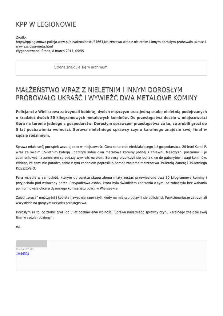 KPP W LEGIONOWIE Źródło: http://kpplegionowo.policja.waw.pl/ple/aktualnosci/37663,Malzenstwo-wraz-z-nieletnim-i-innym-doroslym-probowalo-ukrasc-iwywiezc-dwa-meta.html Wygenerowano: Środa, 8 marca 2017, 05:55 Strona znajduje się w archiwum. MAŁŻEŃSTWO WRAZ Z NIELETNIM I INNYM DOROSŁYM PRÓBOWAŁO UKRAŚĆ I WYWIEŹĆ DWA METALOWE KOMINY Policjanci z Wieliszewa zatrzymali kobietę, dwóch mężczyzn oraz jedną osobę nieletnią podejrzanych o kradzież dwóch 30 kilogramowych metalowych kominów. Do przestępstwa doszło w miejscowości Góra na terenie jednego z gospodarstw. Dorosłym sprawcom przestępstwa za to, co zrobili grozi do 5 lat pozbawienia wolności. Sprawa nieletniego sprawcy czynu karalnego znajdzie swój finał w sądzie rodzinnym. Sprawa miała swój początek wczoraj rano w miejscowości Góra na terenie niedziałającego już gospodarstwa. 20-letni Kamil P. wraz ze swoim 15-letnim kolegą upatrzyli sobie dwa metalowe kominy jednej z chlewni. Mężczyźni postanowili je zdemontować i z zamiarem sprzedaży wywieźć na złom. Sprawcy przeliczyli się jednak, co do gabarytów i wagi kominów. Widząc, że sami nie poradzą sobie z tym zadaniem poprosili o pomoc znajome małżeństwo 39-letnią Żanetę i 35-letniego Krzysztofa O. Para wsiadła w samochód, którym do punktu skupu złomu miały zostać przewiezione dwa 30 kilogramowe kominy i przyjechała pod wskazany adres. Przypadkowa osoba, która była świadkiem zdarzenia o tym, co zobaczyła bez wahania poinformowała oficera dyżurnego komisariatu policji w Wieliszewie. Zajęci „pracą” mężczyźni i kobieta nawet nie zauważyli, kiedy na miejscu pojawili się policjanci. Funkcjonariusze zatrzymali wszystkich na gorącym uczynku przestępstwa. Dorosłym za to, co zrobili grozi do 5 lat pozbawienia wolności. Sprawa nieletniego sprawcy czynu karalnego znajdzie swój finał w sądzie rodzinnym. rsz. Ocena: 0/5 (0) Tweetnij